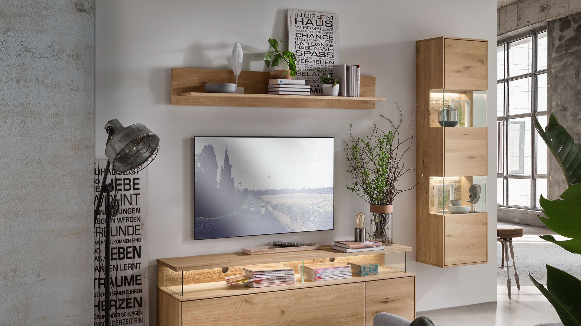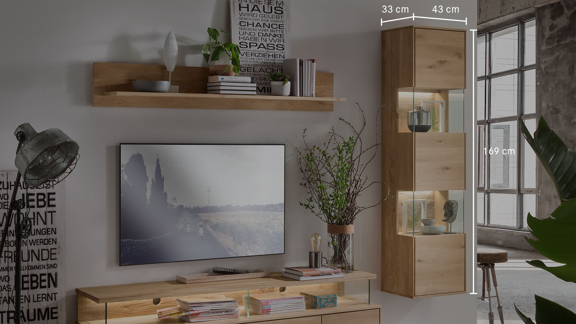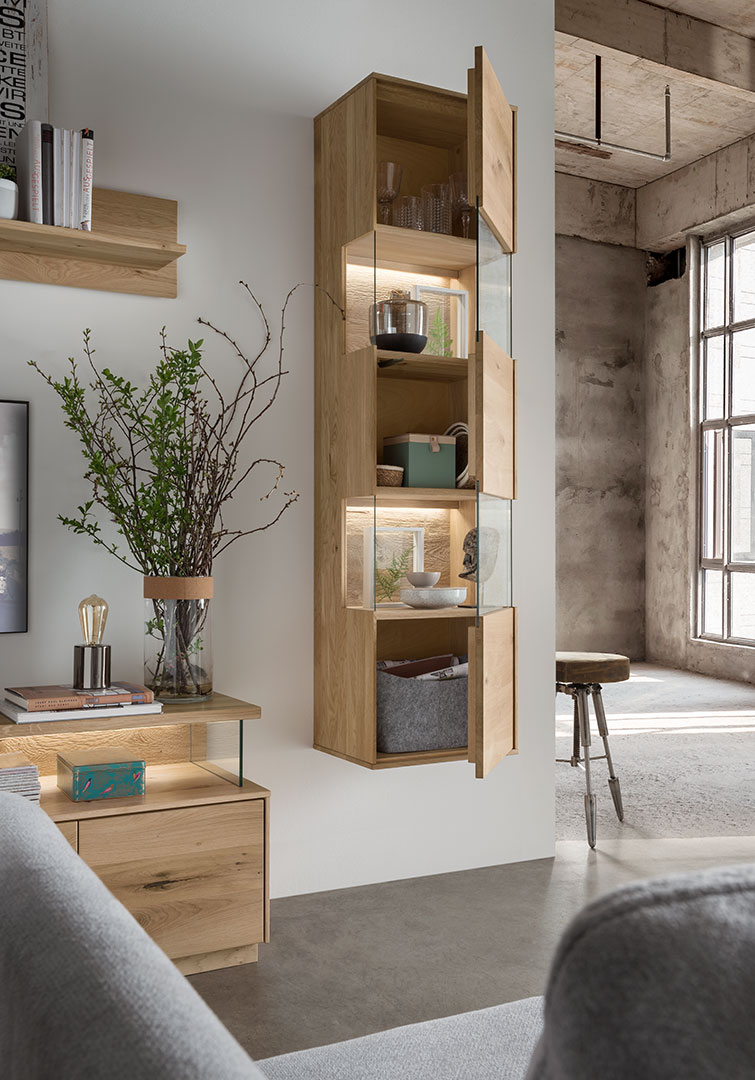 Atemberaubende Schlichtheit, pure Eleganz. Diese schlanke Hängevitrine aus markantem Wildeichenholz macht Ihre Wohnträume wahr! Sie können dieses Design-Juwel sogar zum Funkeln bringen. Wie das geht?