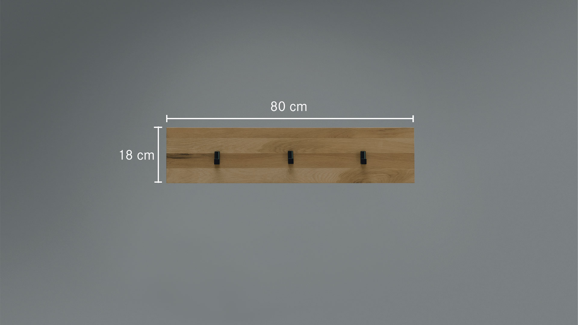 Prachtvolle Hakenleiste im Flur für Mantel, Taschen & Co. Die markanten Schwarzstahl-Haken unterstreichen die faszinierende Maserung der edlen Wildeiche. Praktisch auch im Kinderzimmer für Turnbeutel & Co. oder im Schlafzimmer für Westen, Stola und Ihre Gürtel.