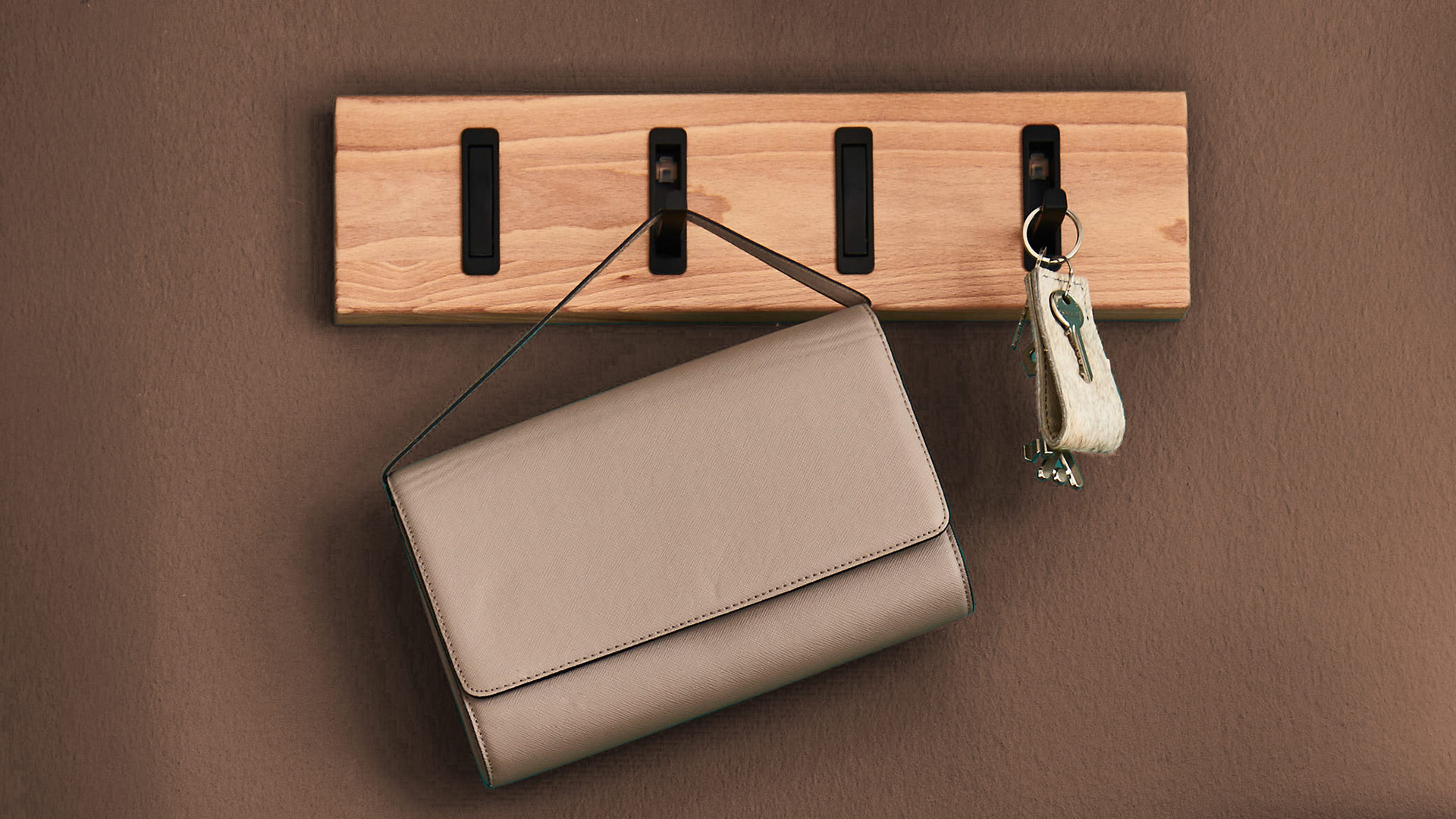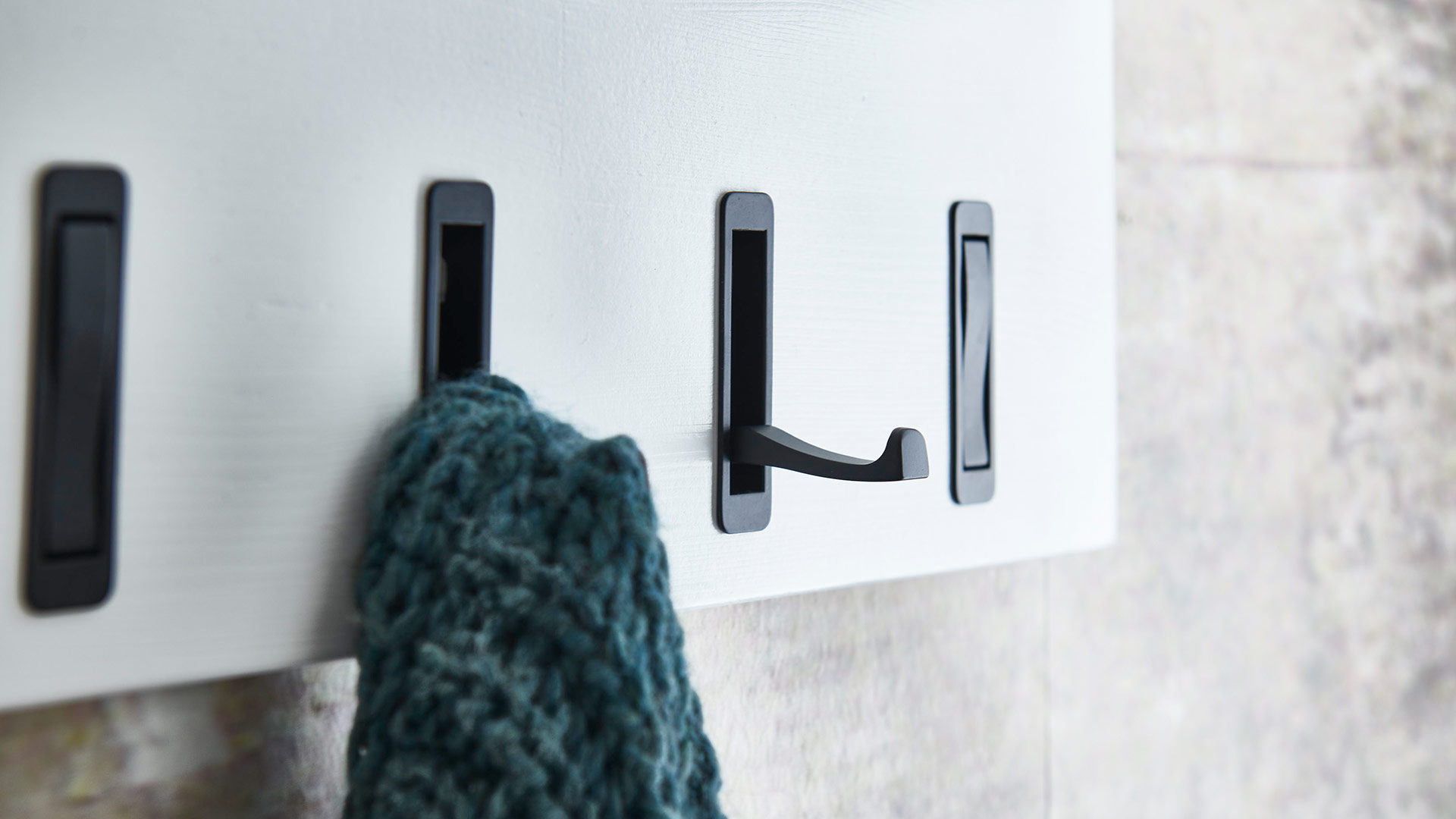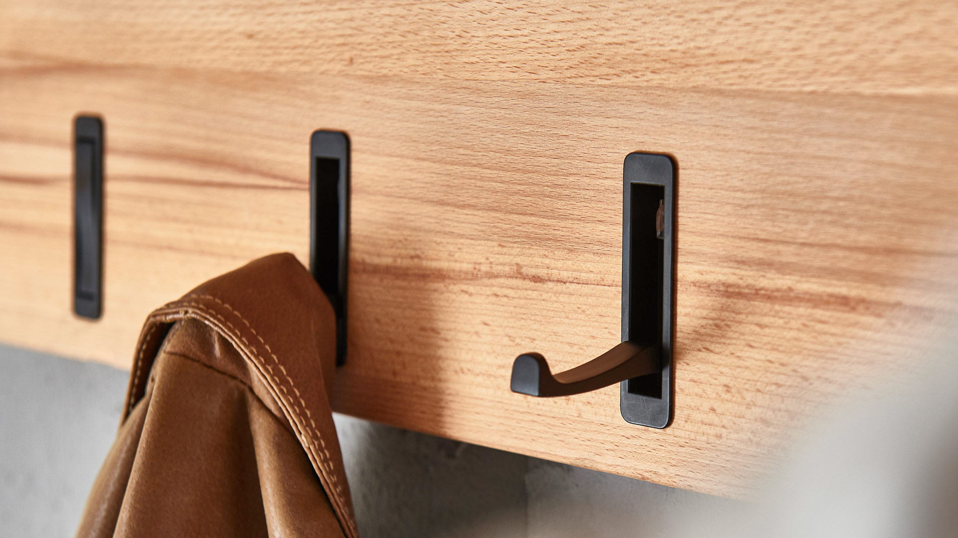 Einfach genial: Bei Hakenleiste "Vestido" verschwinden die Haken im Holz des Paneels, wenn sie nicht gebraucht werden. So entsteht eine plane Fläche, in der die schwarzen Elemente wie Intarsien-Arbeiten im markant gezeichneten bzw. weißen Holz wirken.