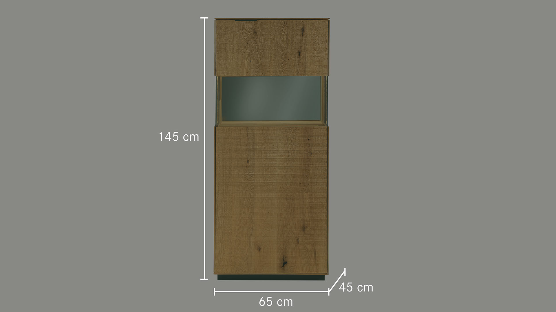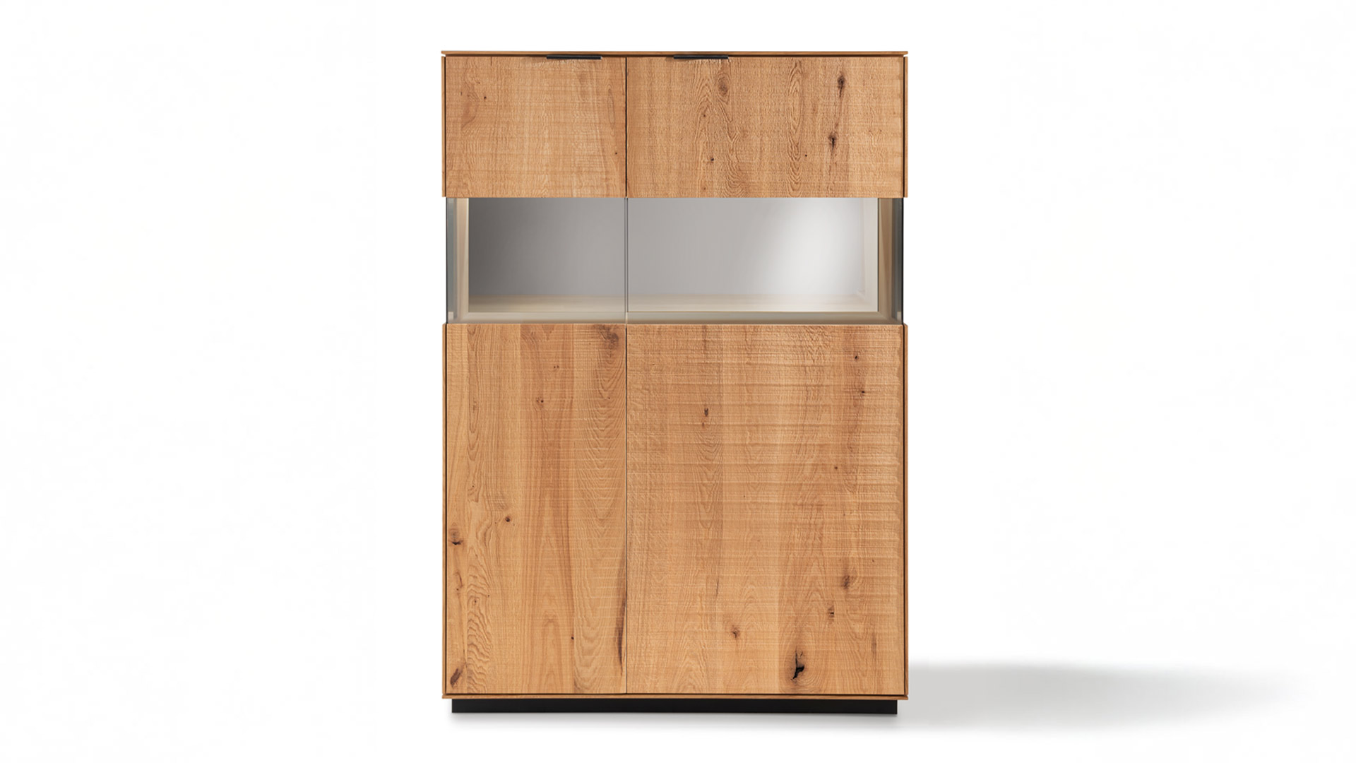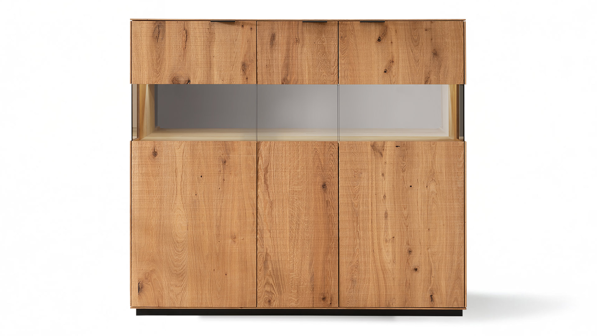 Das Highboard "Eterna" verbindet auf perfekte Weise rustikalen Charme mit modernen Akzenten. Die eleganten Glaselemente und die beeindruckende Spiegelrückwand in Kombination mit der integrierten LED-Beleuchtung setzen Ihre Dekoration und Schaustücke auf stilvolle Weise in Szene und lassen sie in einem ganz neuen, faszinierenden Licht erscheinen. Die edlen Glaselemente harmonieren perfekt mit dem charaktervollen, gemaserten Wildeichenholz und schaffen so einen eleganten Kontrast.