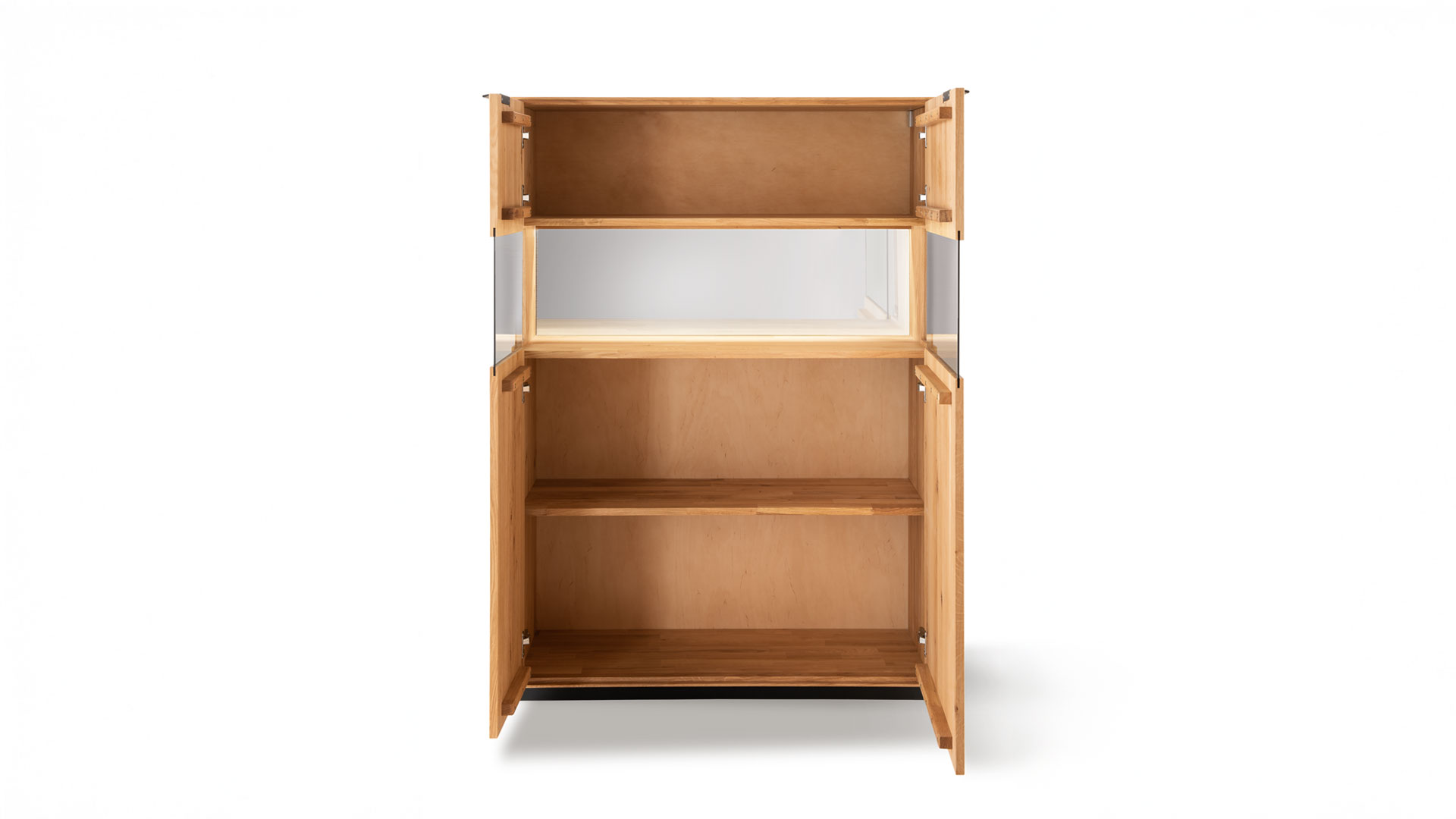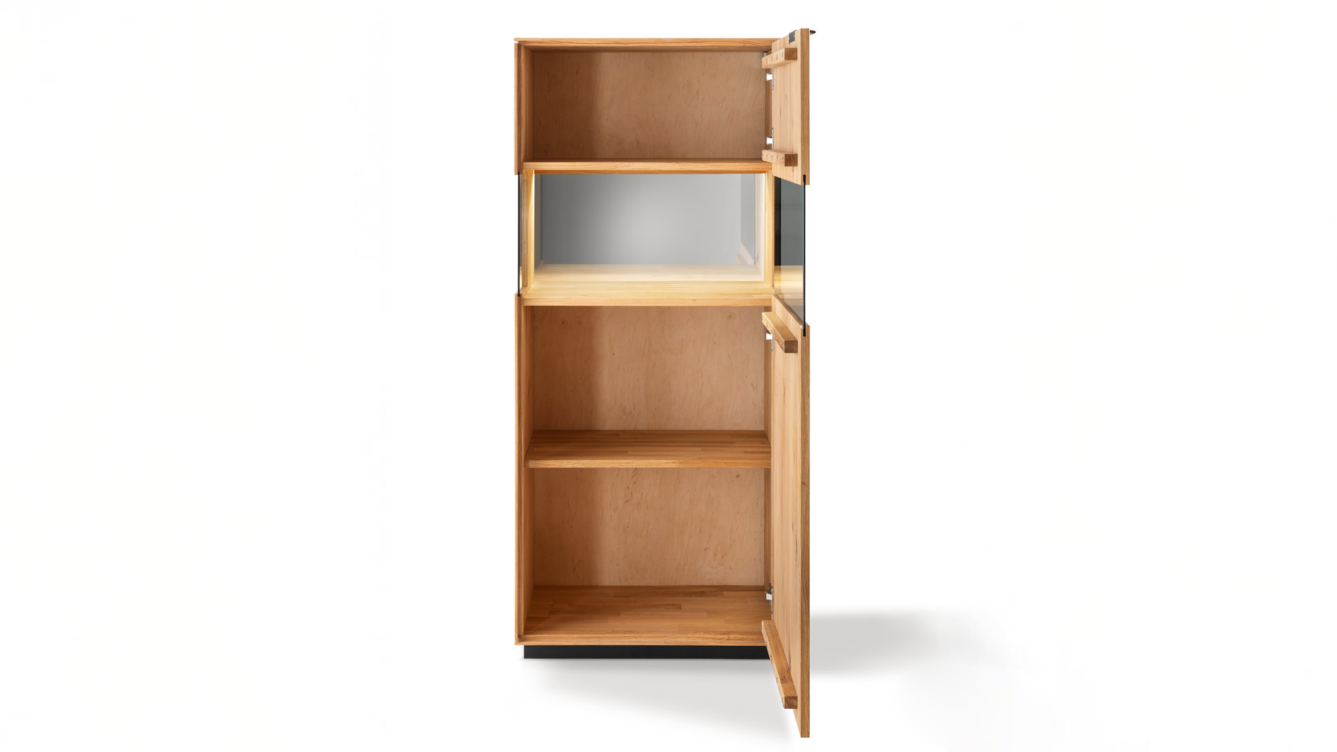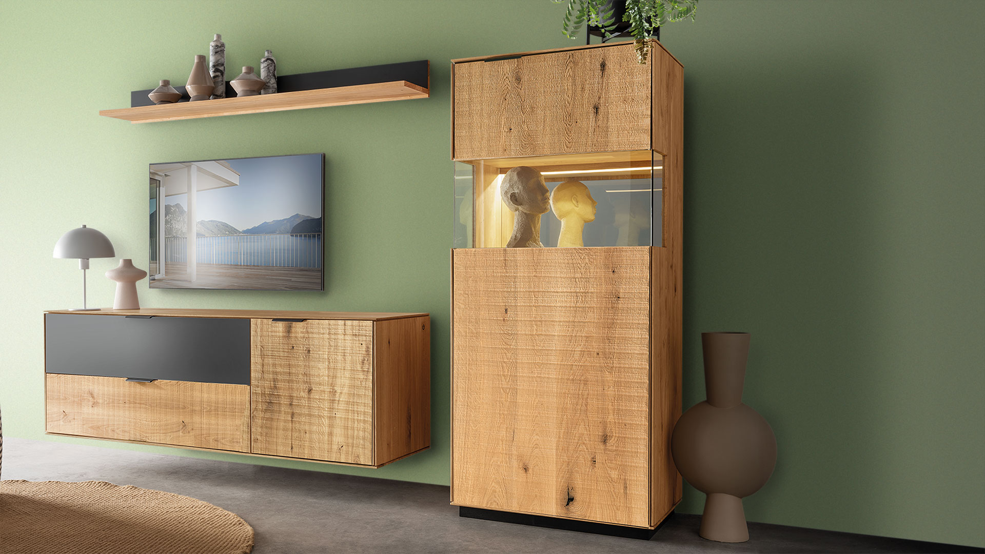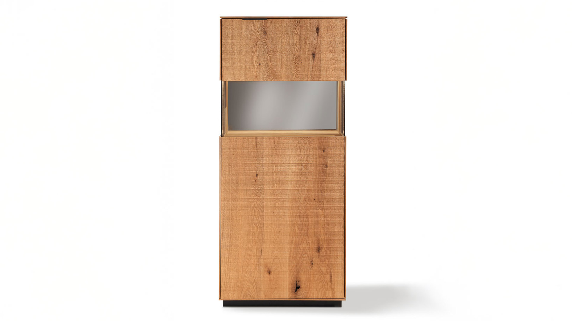 Das Highboard "Eterna" verbindet auf perfekte Weise rustikalen Charme mit modernen Akzenten. Die eleganten Glaselemente und die beeindruckende Spiegelrückwand in Kombination mit der integrierten LED-Beleuchtung setzen Ihre Dekoration und Schaustücke auf stilvolle Weise in Szene und lassen sie in einem ganz neuen, faszinierenden Licht erscheinen. Die edlen Glaselemente harmonieren perfekt mit dem charaktervollen, gemaserten Wildeichenholz und schaffen so einen eleganten Kontrast.