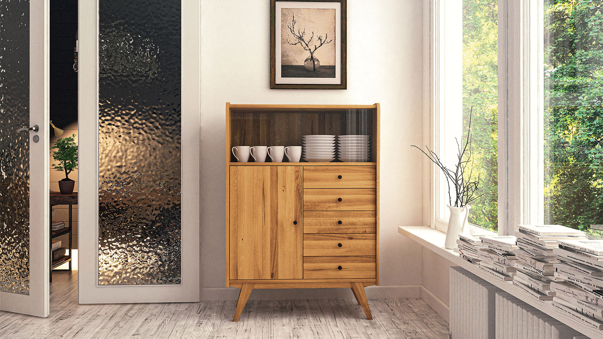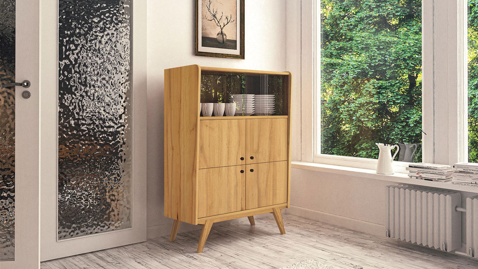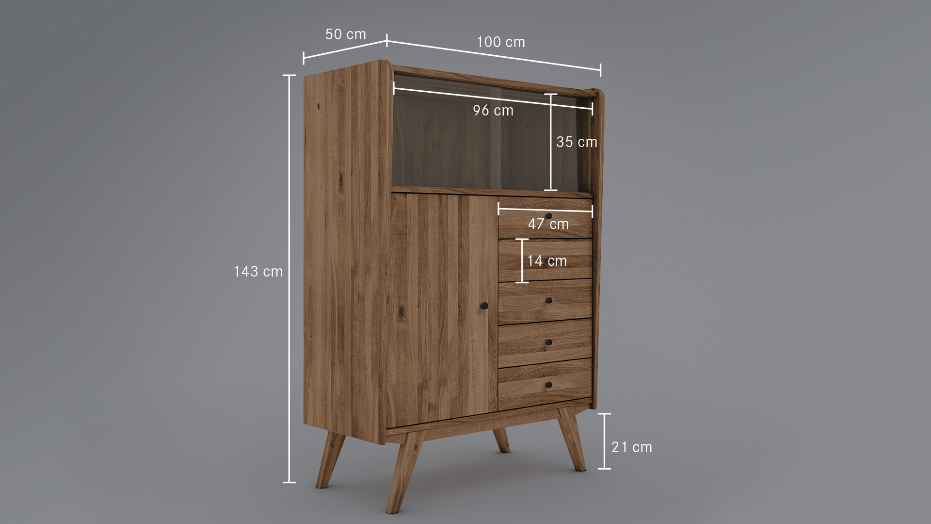 Die klaren Glas-Schiebetüren haben stilecht eingefräste Griffmulden. Die glatte Front des Highboards ist etwas nach innen versetzt und wird von sorgfältig abgerundeten Seitenteilen eingerahmt. Das edle Massivholz-Highboard hat eine markante Zarge, in die hohe Schrankfüße schräg eingearbeitet sind. Schwarze Knopfgriffe aus Metall machen das Gesamtbild perfekt. Sie erhalten "Lasala" wahlweise in massiver Kernbuche oder Wildeiche. Wir bieten das markante Highboard in 4 Varianten an - entscheiden Sie selbst, welche am besten in Ihr Zuhause passt.
