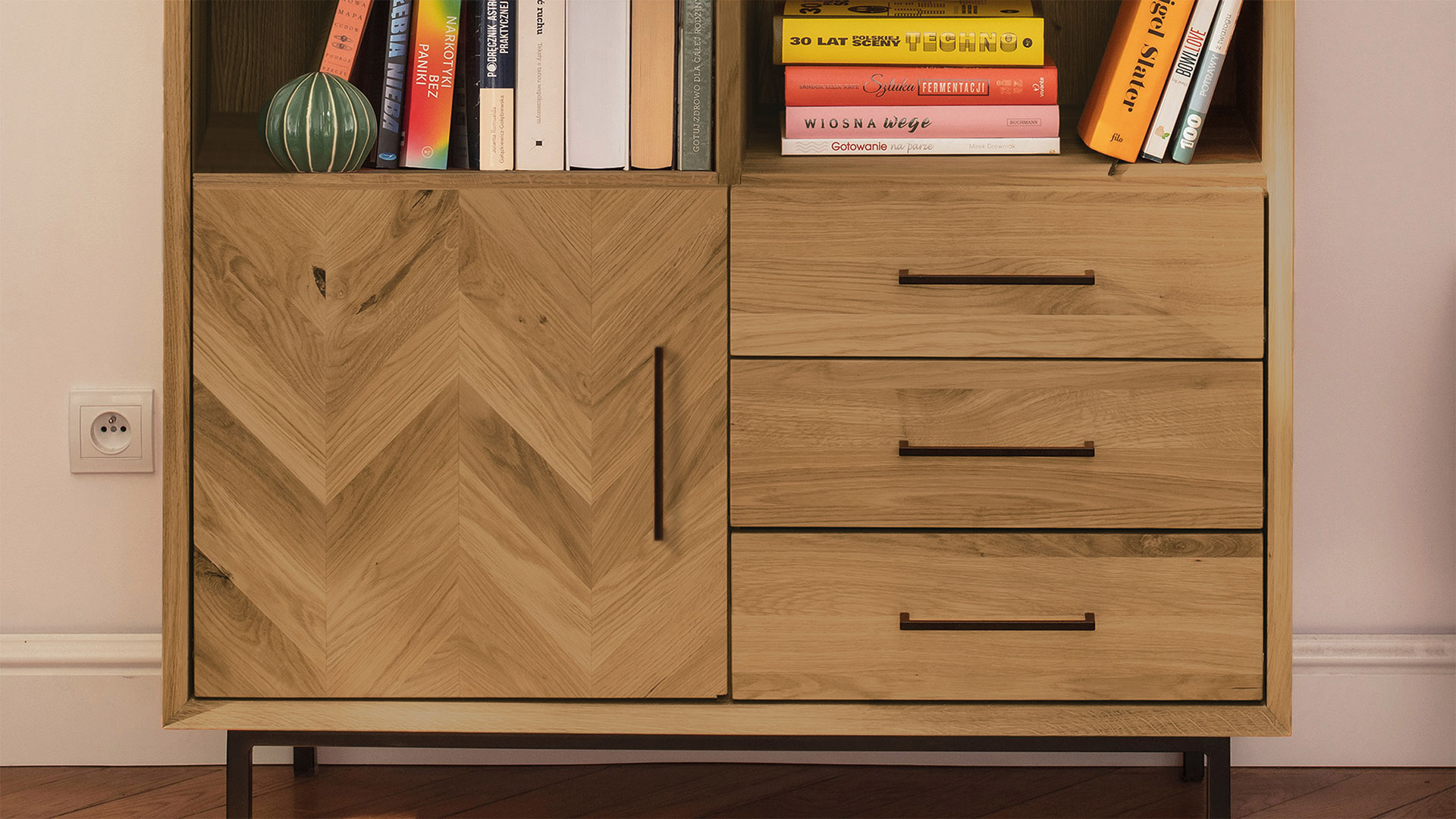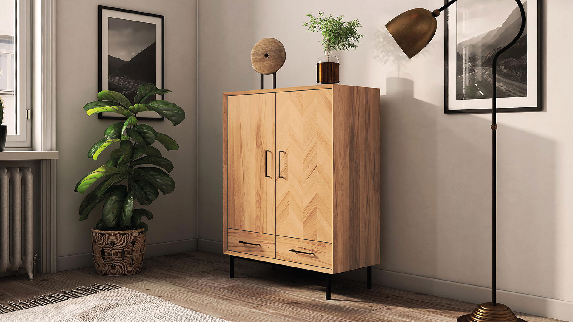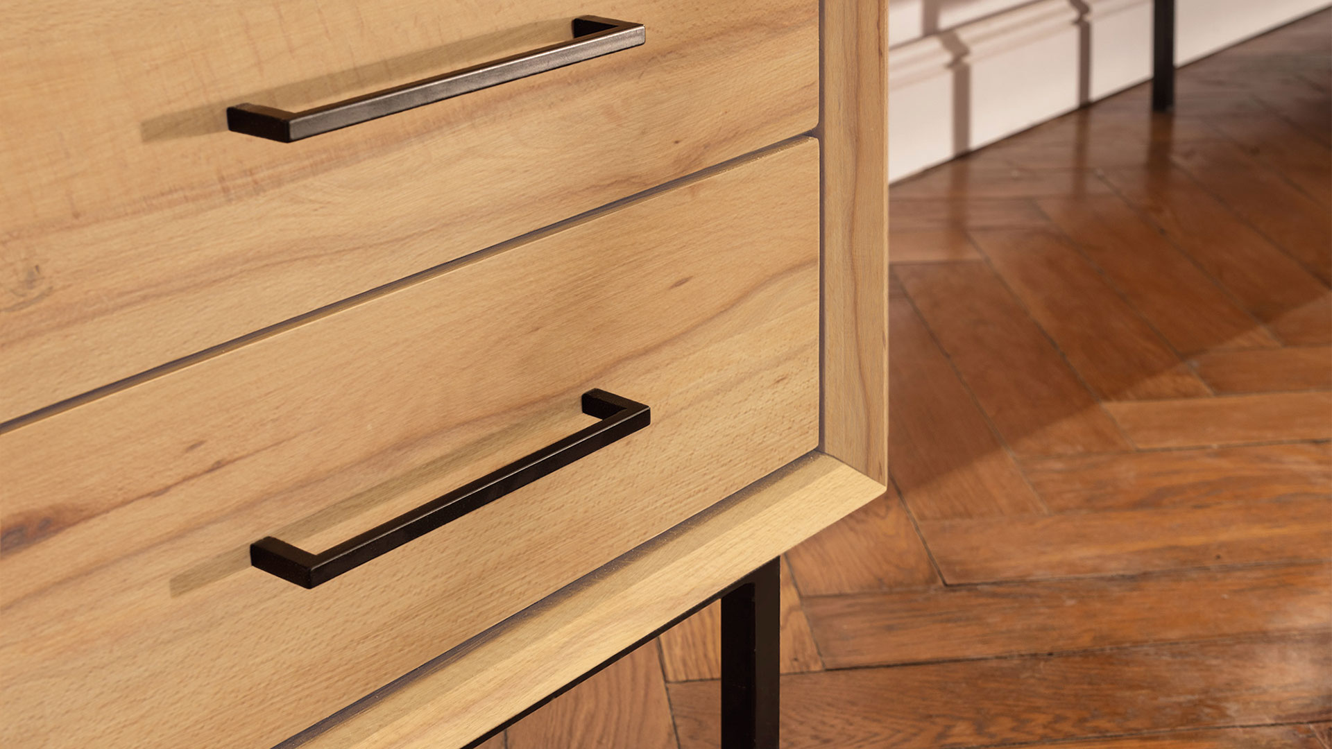"Parquetta" wird aus massiver Kernbuche oder Wildeiche gefertigt. Stilgetreu haben die schönen Möbelstücke puristisch schwarze Fußelemente aus Metall. Der Korpus ist sorgfältig auf Gehrung gearbeitet und hat nach innen abgeschrägte Kanten. Die Möbelfront ist somit leicht nach innen versetzt. Jeweils eine der Türen ist mit edlen Einlegearbeiten im Fischgrät-Muster geschmückt. Wählen Sie ganz nach Platzbedarf und persönlichem Geschmack Ihr Lieblingsstück.