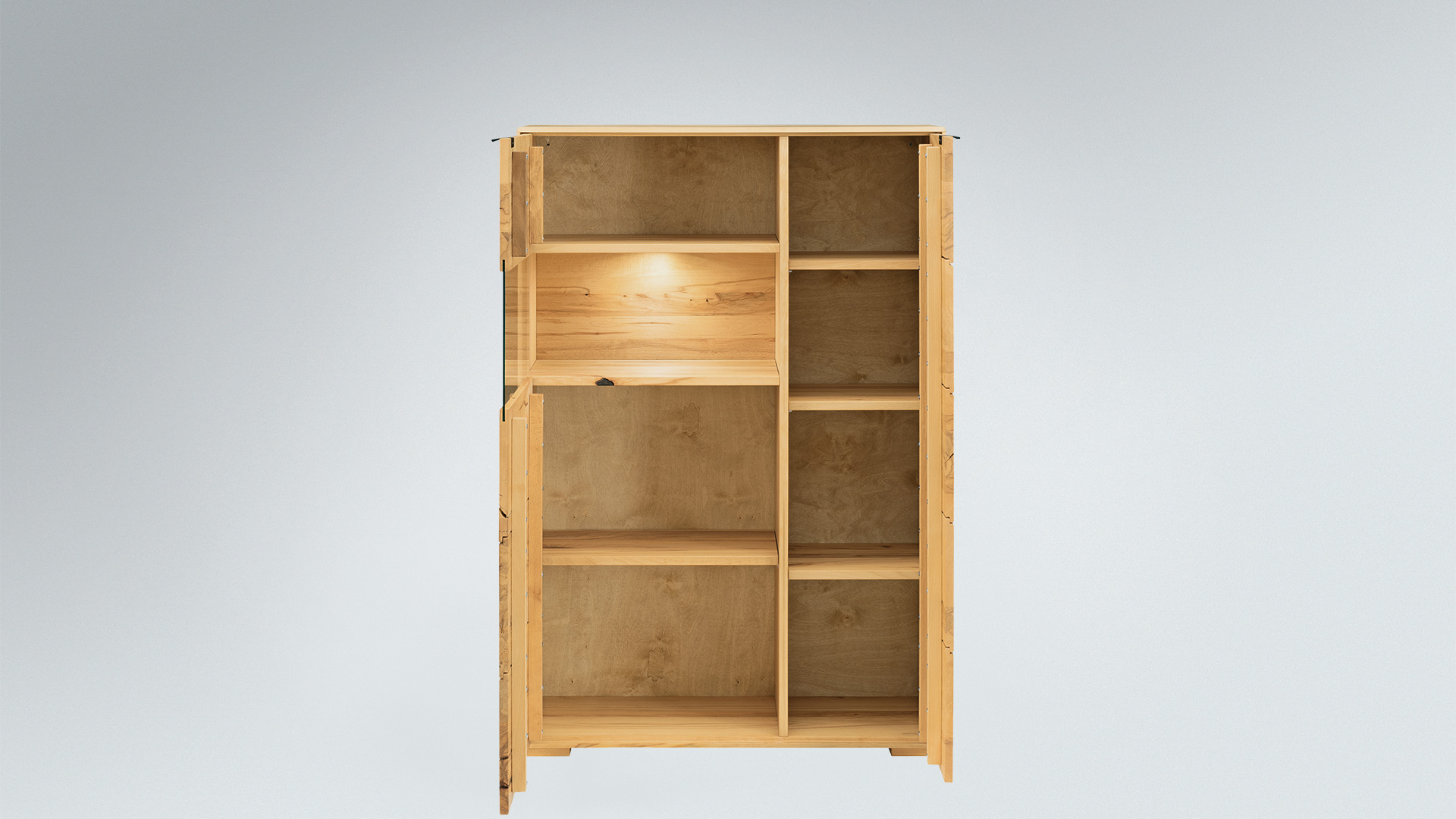 Die markanten, schwarzen Metallgriffe an Türen und Schubladen! Zusätzlich setzt die große Holzfläche das Massivholz gekonnt in Szene und zieht bewundernde Blicke auf sich. Die flachen Holzfüße sorgen bei diesem massigen Möbelstück elegant für etwas optische Leichtigkeit. Variante 01 bietet Ihnen unten 2 geräumige Schubladen. Oben garantiert 1 Schrankfach mit Glaseinsatz ausreichend Platz. Mit der breiteren Variante 02 erhalten Sie noch mehr Stauraum für Geschirr, Gläser & Co. Rücken Sie Ihre Lieblingsstücke hinter der Glasscheibe durch die Ausführung mit Beleuchtung ins richtige Licht und setzen Sie diese gekonnt in Szene.