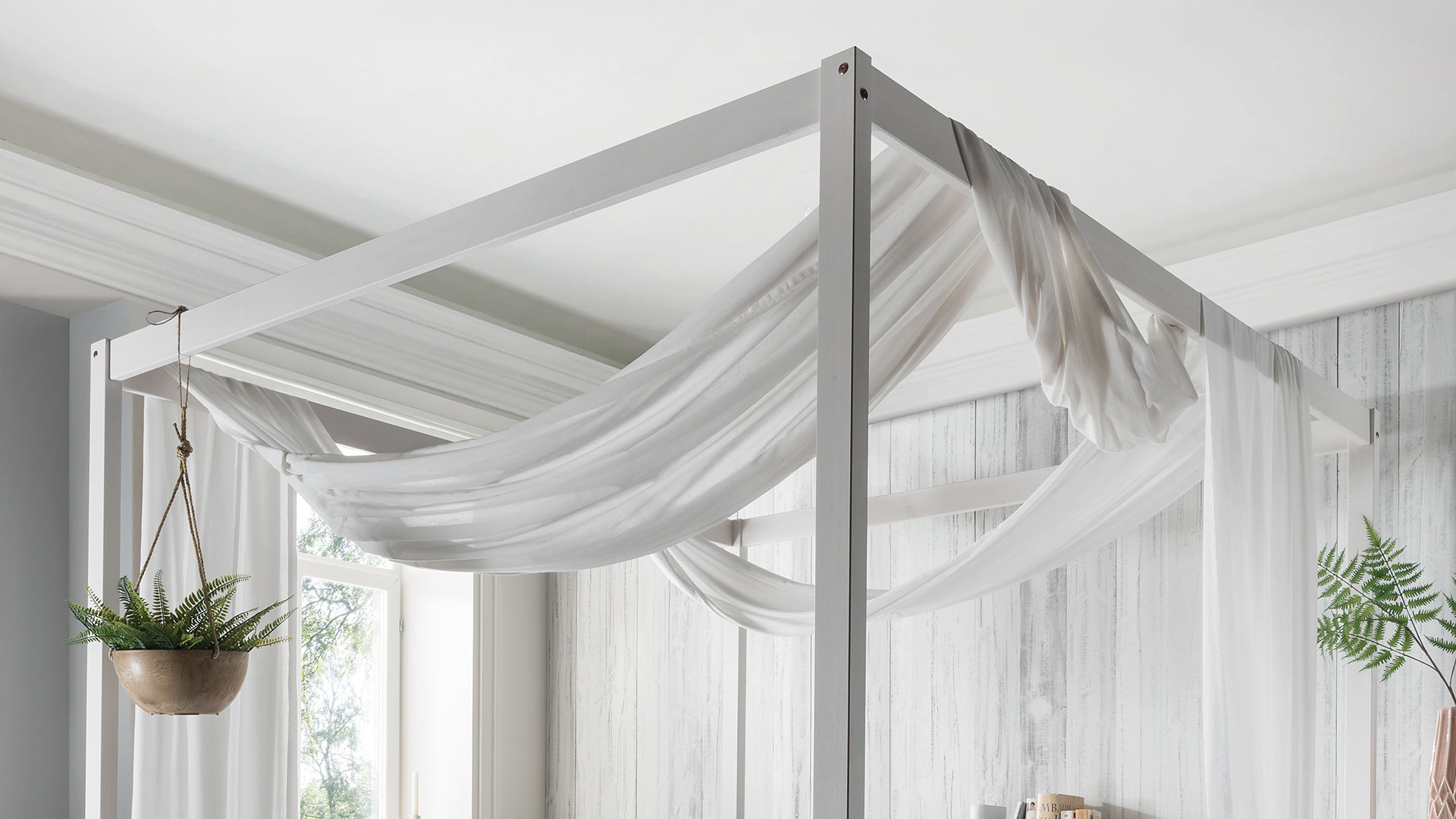 Ob luftig-locker drapierte Tücher oder ein umlaufender Vorhang für Ihre ganz private Kuschelhöhle - mit "Tusa" ist alles möglich! Die pfiffig abgeschrägten Füße bilden in der Verlängerung den Aufbau. So wirkt der Himmel nicht "aufgesetzt". Die bewusst schlanke Gestaltung in Kombination mit den unten schmal zulaufenden Füßen sorgt für eine leichte Optik. Damit liegen Sie voll im skandinavischen, modernen Trend.