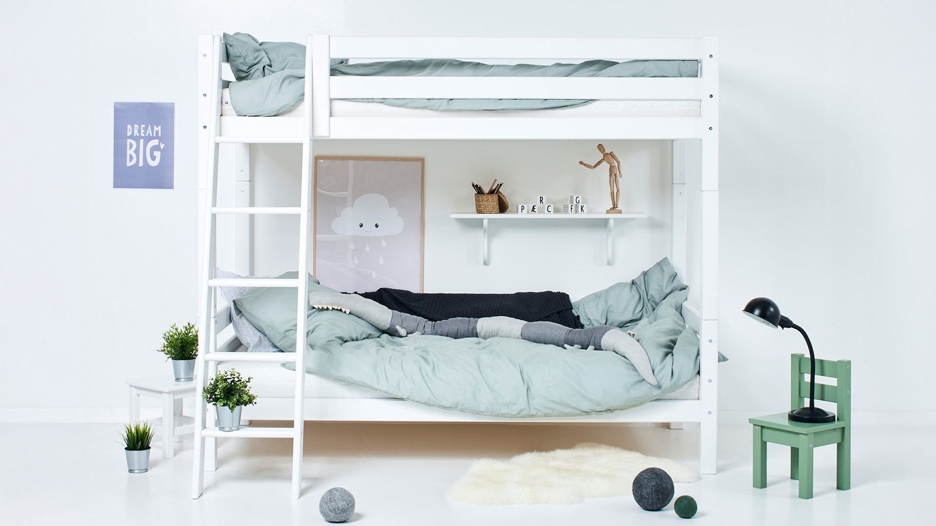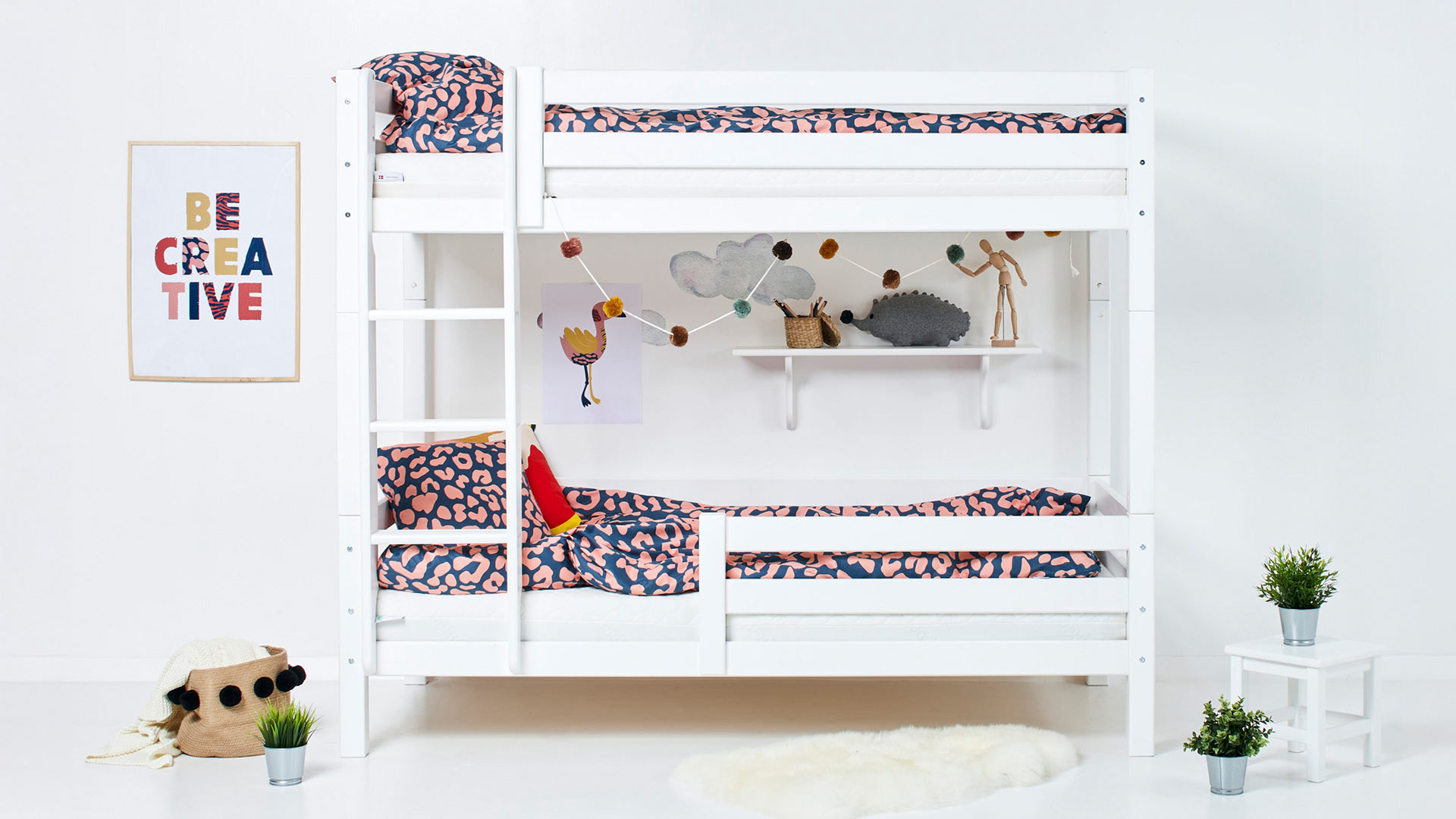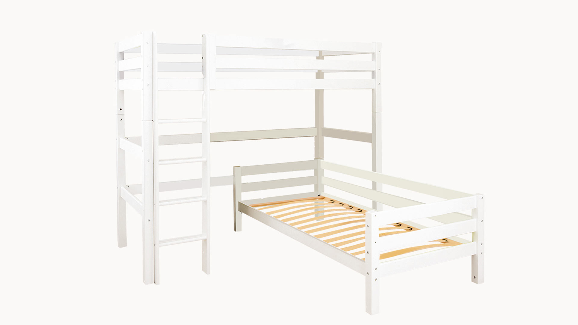 Dank der vielfältigen Varianten fügt sich das Hoch-Etagenbett nahtlos in verschiedene Raumkonzepte ein. Besonders praktisch ist die Ecklösung, bei der das untere Bett im Winkel aufgestellt wird. Außerdem ist das Etagenbett auch mit einer umlaufenden Absturzsicherung am unteren Bett erhältlich, die für zusätzliche Sicherheit sorgt – ideal für kleine wie größere Kinder.
