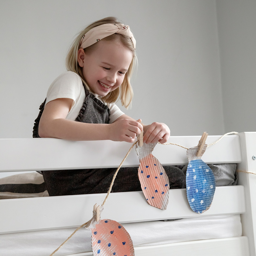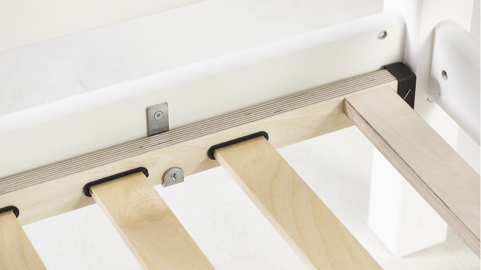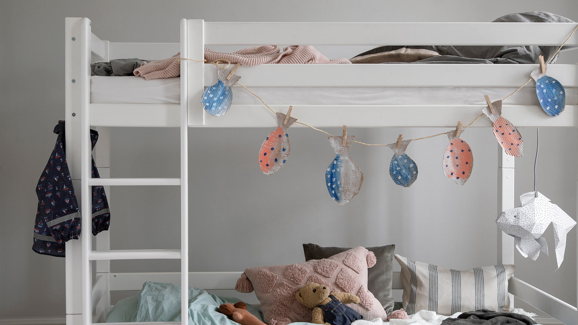 Dank der vielfältigen Varianten fügt sich das Hoch-Etagenbett nahtlos in verschiedene Raumkonzepte ein. Besonders praktisch ist die Ecklösung, bei der das untere Bett im Winkel aufgestellt wird. Außerdem ist das Etagenbett auch mit einer umlaufenden Absturzsicherung am unteren Bett erhältlich, die für zusätzliche Sicherheit sorgt – ideal für kleine wie größere Kinder.
