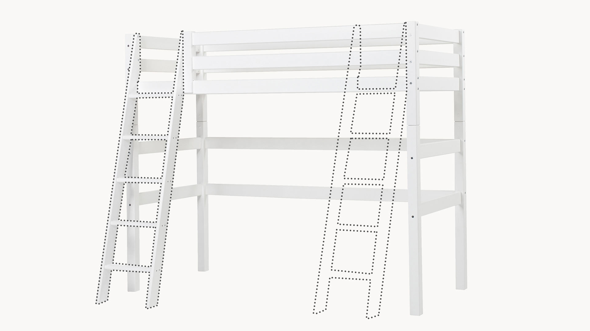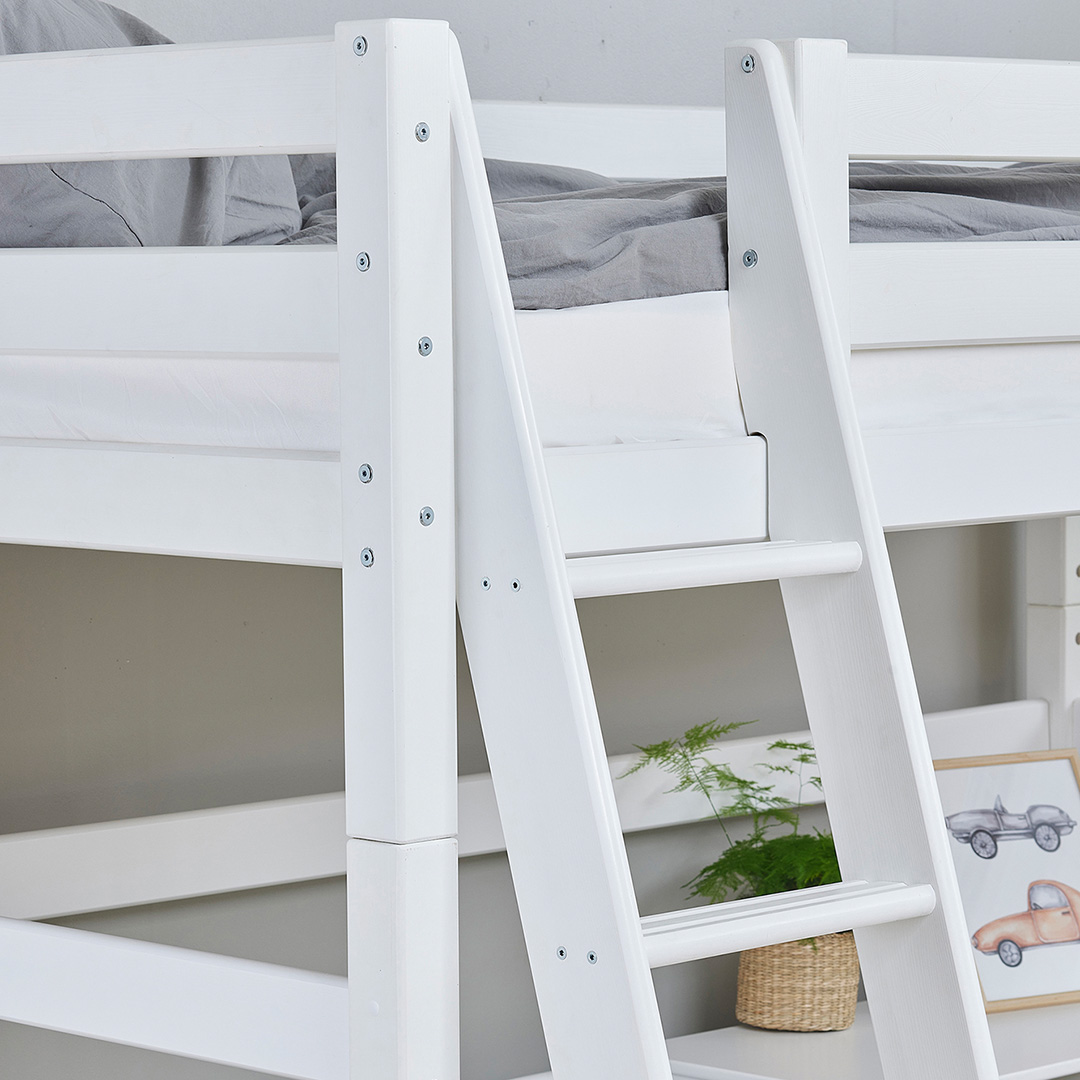 Hochbett "Ortholino" verbindet klares Design mit hoher Funktionalität und passt damit perfekt in das Jugendzimmer. Gefertigt aus massivem, weiß lackiertem Kiefernholz, bietet dieses platzsparende Bett nicht nur ein modernes und freundliches Ambiente, sondern auch die nötige Stabilität und Sicherheit für Heranwachende. Für das Extra an Schlafkomfort sorgt der flexible Lattenrost mit überwölbten Federleisten. Er passt sich dem Körper angenehm an und sorgt für sinnvolle Unterstützung und erholsamen Schlaf. "Ortholino" gibt es mit gerader Leiter oder bequemer, schräger Treppe. Die Stufen haben Rillen, die für sicheren Halt beim Auf- und Abstieg sorgen.