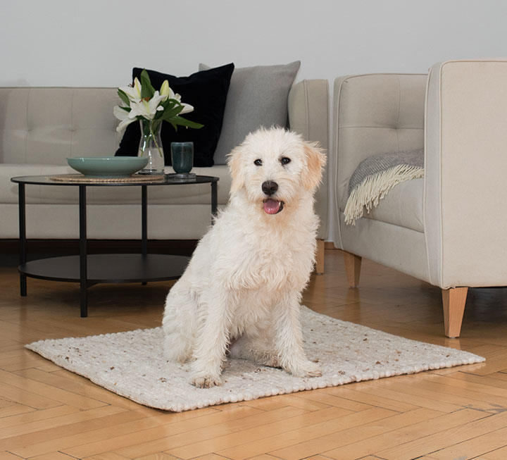 Achten Sie darauf, dass Ihre Hundedecke rutschfest ist. Auf einem glatten Boden sollte die Hundedecke beim Spielen und Toben nicht verrutschen. Das könnte Ihren Hund erschrecken oder er könnte sich verletzen. Aus diesem Grund haben unsere Hundesteppdecken eine rutschfest bedruckte Unterseite (GOTS-zertifiziertes Druckverfahren). Für unseren Schurwollteppich bieten wir einen Gleitschutz in der passenden Größe zur Hundedecke an. - Eine Hundedecke in Ihrer Lieblingsfarbe