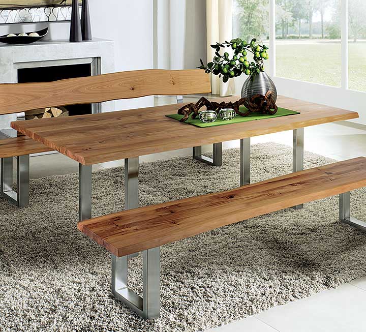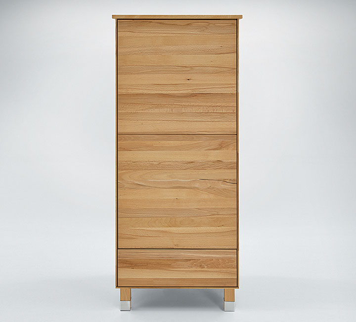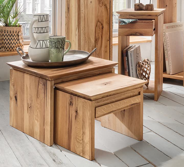 Die Holzwahl ist in erster Linie Geschmacksache. Möbel aus Kiefer sind ideal für den kleineren Geldbeutel. Weil Kiefer ein Weichholz ist, ist die Oberfläche aber etwas empfindlicher gegen Dellen und Kratzer. Massiv-Möbel aus Hartholz sind da wesentlich unempfindlicher. Für einen modernen Look bieten sich die markant gezeichneten Hölzer Wildeiche und Kernbuche an.