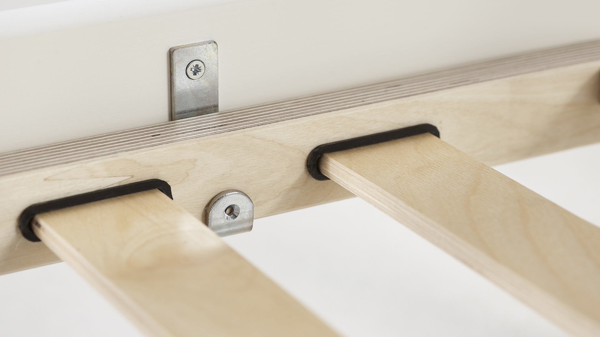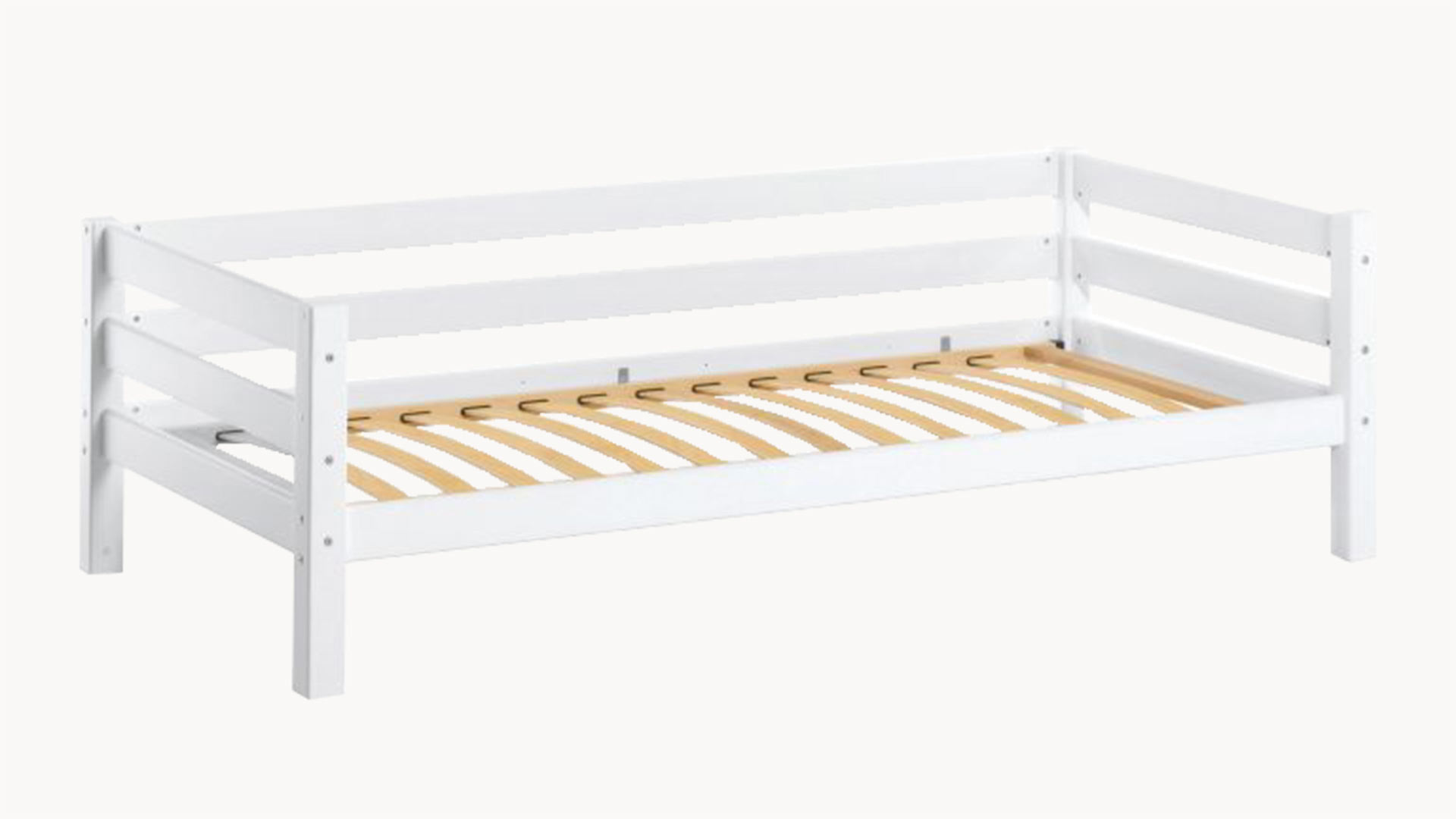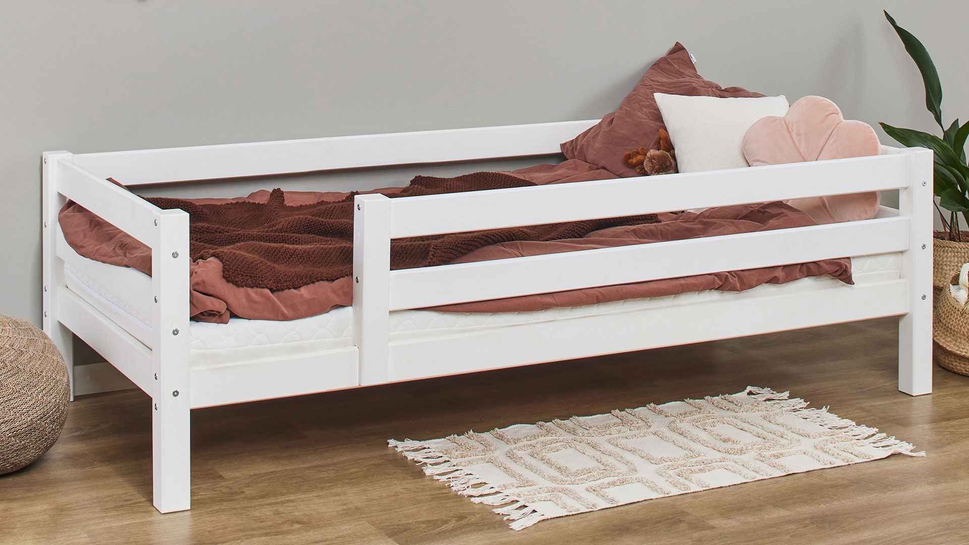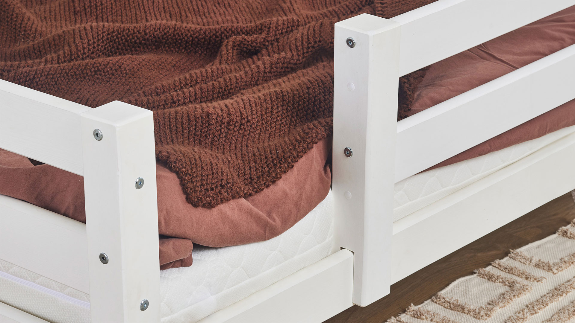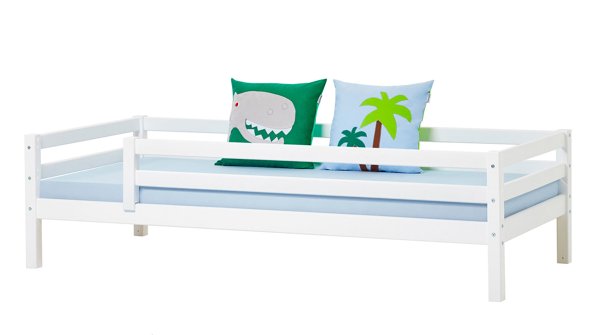 Die erste Variante bietet ein schlichtes Kopf- und Fußteil, das sich durch seine klare Linienführung harmonisch in jedes Kinderzimmer integriert. Wenn das Bett frei im Raum steht, ist der Einstieg von beiden Seiten möglich. Die zweite Variante fungiert als pfiffiges Kojenbett, das tagsüber mit ein paar Kissen im Handumdrehen zum gemütlichen Sofa wird. Die dritte Variante bietet für kleinere Kinder oder solche, die unruhig schlafen, die perfekte Lösung. Mit einem umlaufenden Rausfallschutz mit bequemem Ausstieg vorne sorgt das Kinderbett für zusätzliche Sicherheit. Schon kleine Kinder können sich hier sicher und geborgen fühlen. Und wenn Ihr Kind den zusätzlichen Schutz nicht mehr braucht, können Sie ihn einfach abmontieren.