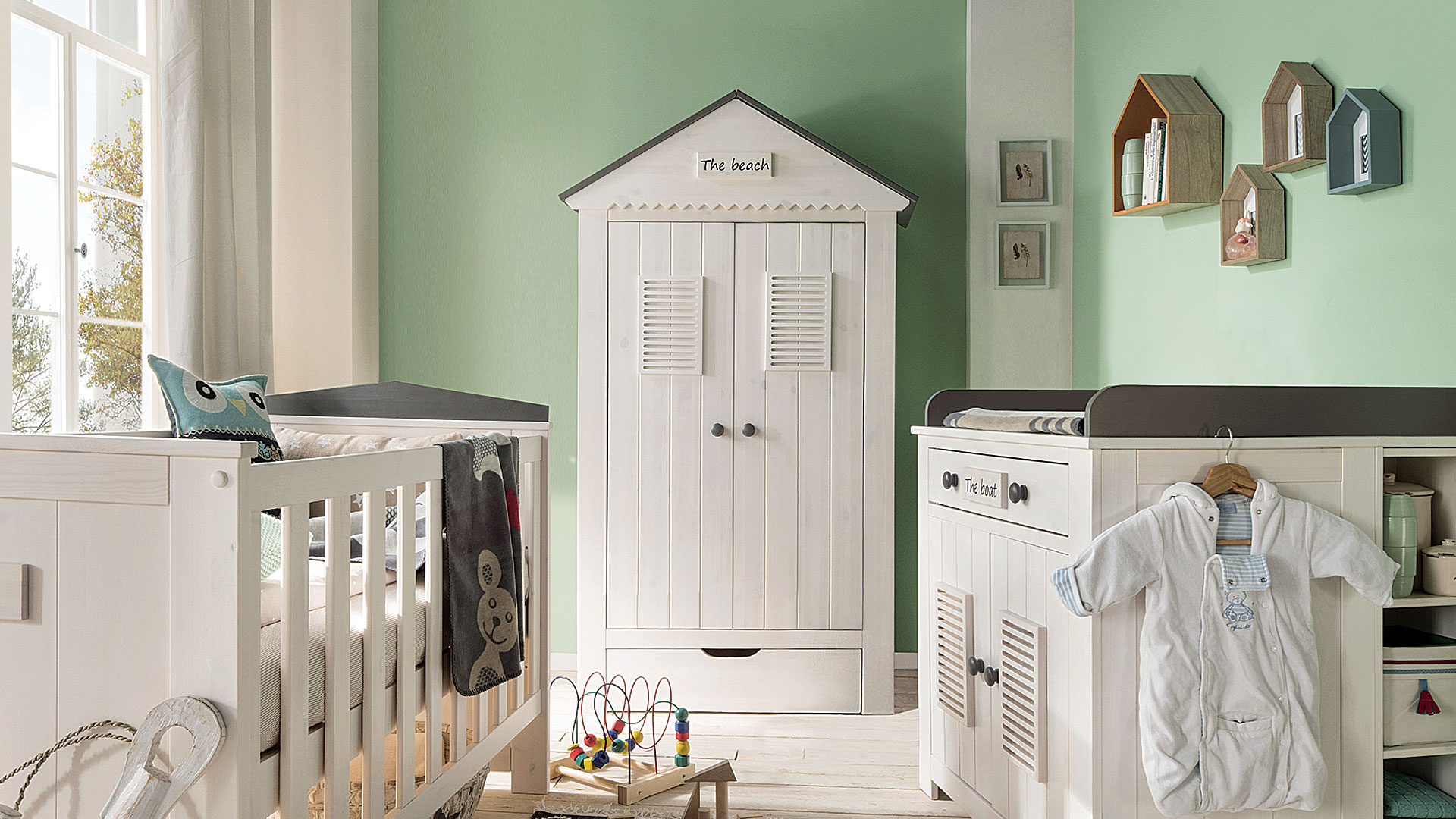 Kleiderschrank "Sunny" ist mit seinem Dachaufsatz ein echter Hingucker für Ihr Babyzimmer. Da kommt glatt Urlaubsstimmung auf.