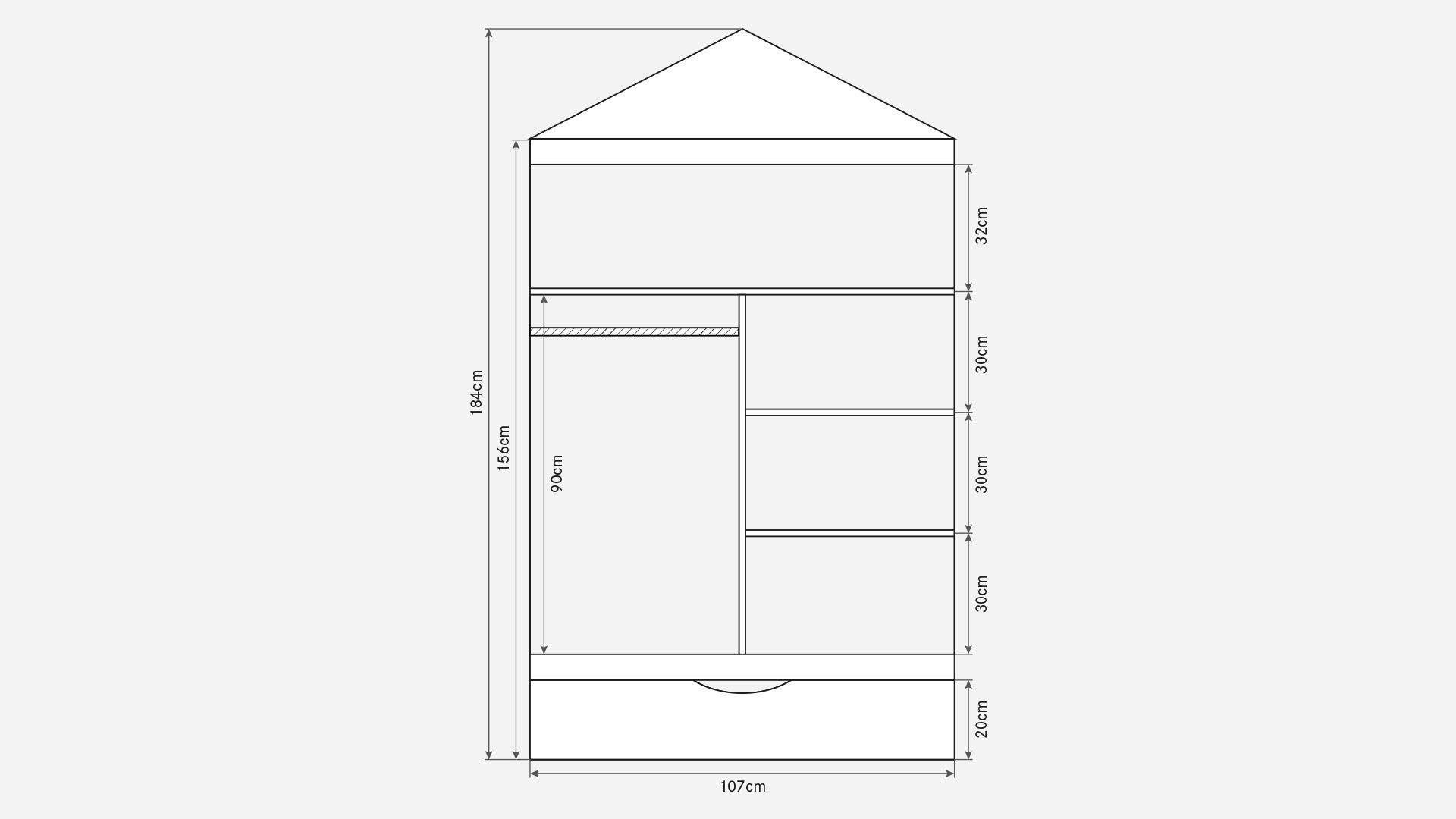 Das seitlich aufklappbare Dach bietet zusätzlichen, kleinkind-sicheren Stauraum. Es hebt sich durch die vorstehende Front mit Zackenrand dezent vom Kleiderschrank-Korpus ab. An der Dachfront befindet sich, wie auch bei der Wickelkommode und dem Kinderbett, ein Schildchen - hier mit der Aufschrift "The beach". Die Inneneinteilung ist an Kinderkleidung angepasst. Der geräumige Sockel-Schubkasten mit einer handlichen Griffmulde bietet weiteren Stauraum. Besonders praktisch: Die Schublade läuft auf Rollen und kann somit komplett herausgezogen werden. Ideal auch für Spielzeug!