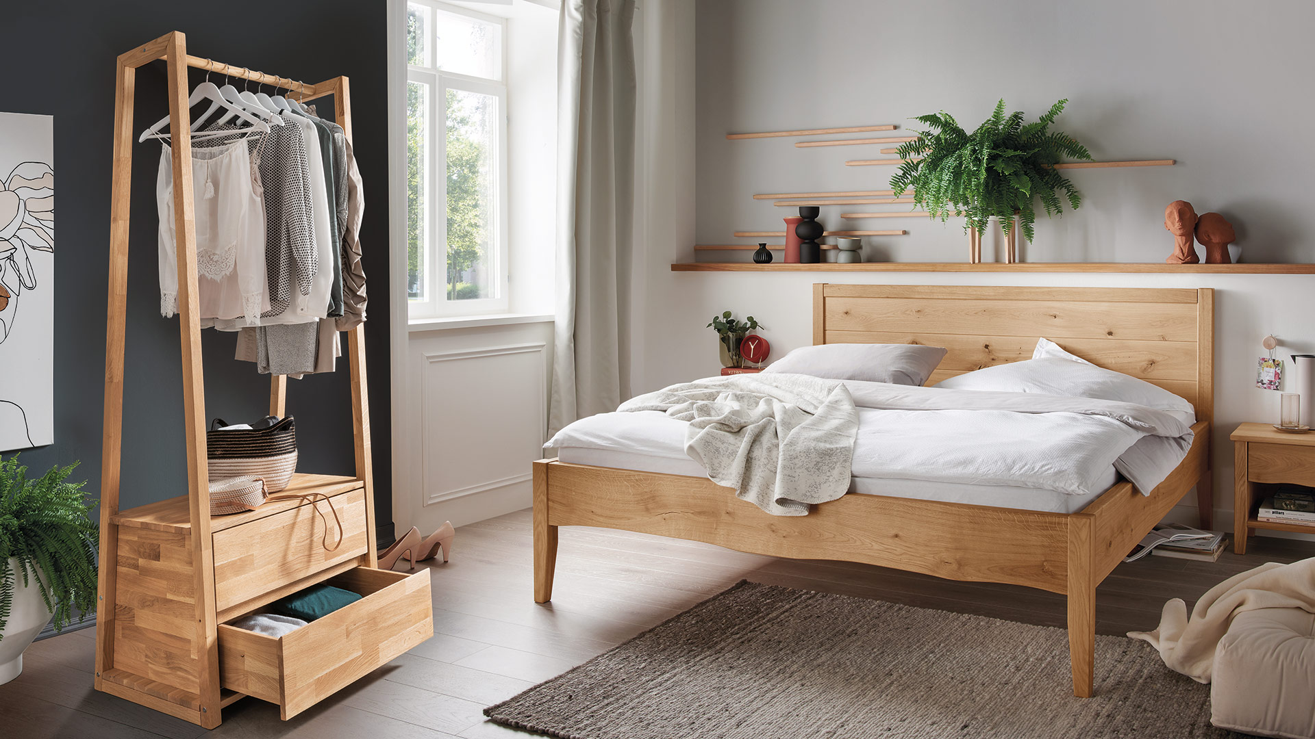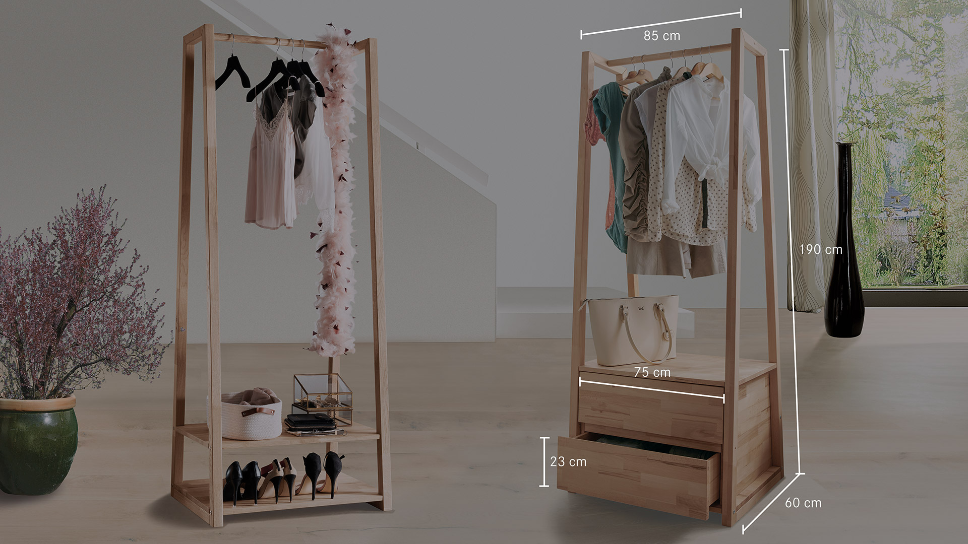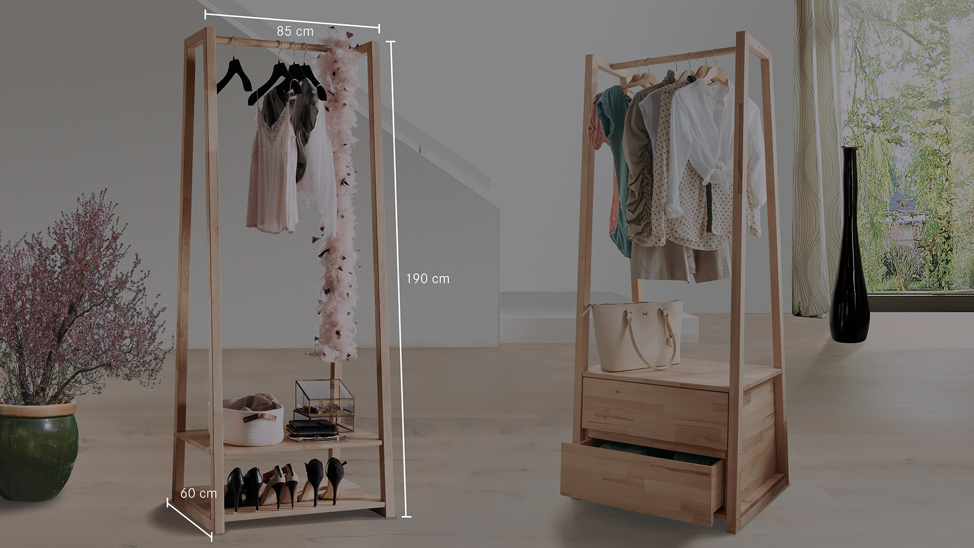 "Silencia" kümmert sich gerne um Ihre Garderobe, ist im Jugend- oder Gästezimmer ein moderner Kleiderschrank-Ersatz und steht im Kinderzimmer der Wäschekommode zur Seite. Der flexible Kleiderständer erleichtert Ihnen auch das Bügeln und nimmt Ihnen gerne die frisch geplättete Wäsche ab. Der elegante Massivholz-Kleiderständer ist wahlweise in Kernbuche oder Eiche erhältlich. Ob die offene Variante mit Ablage besser zu Ihrem Heim passt oder die pfiffige Lösung mit 2 Schubladen für Sie praktischer ist, entscheiden Sie selbst. Egal in welcher Ausführung - "Silenca" wird Ihr Zuhause bereichern.