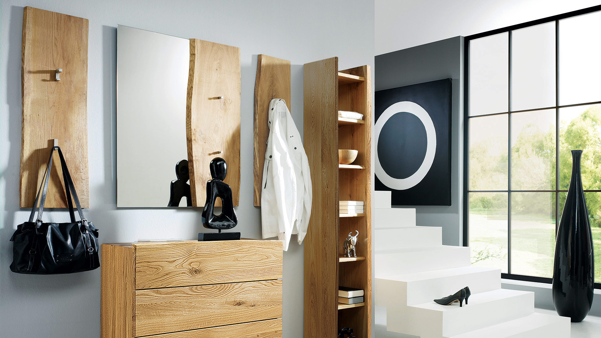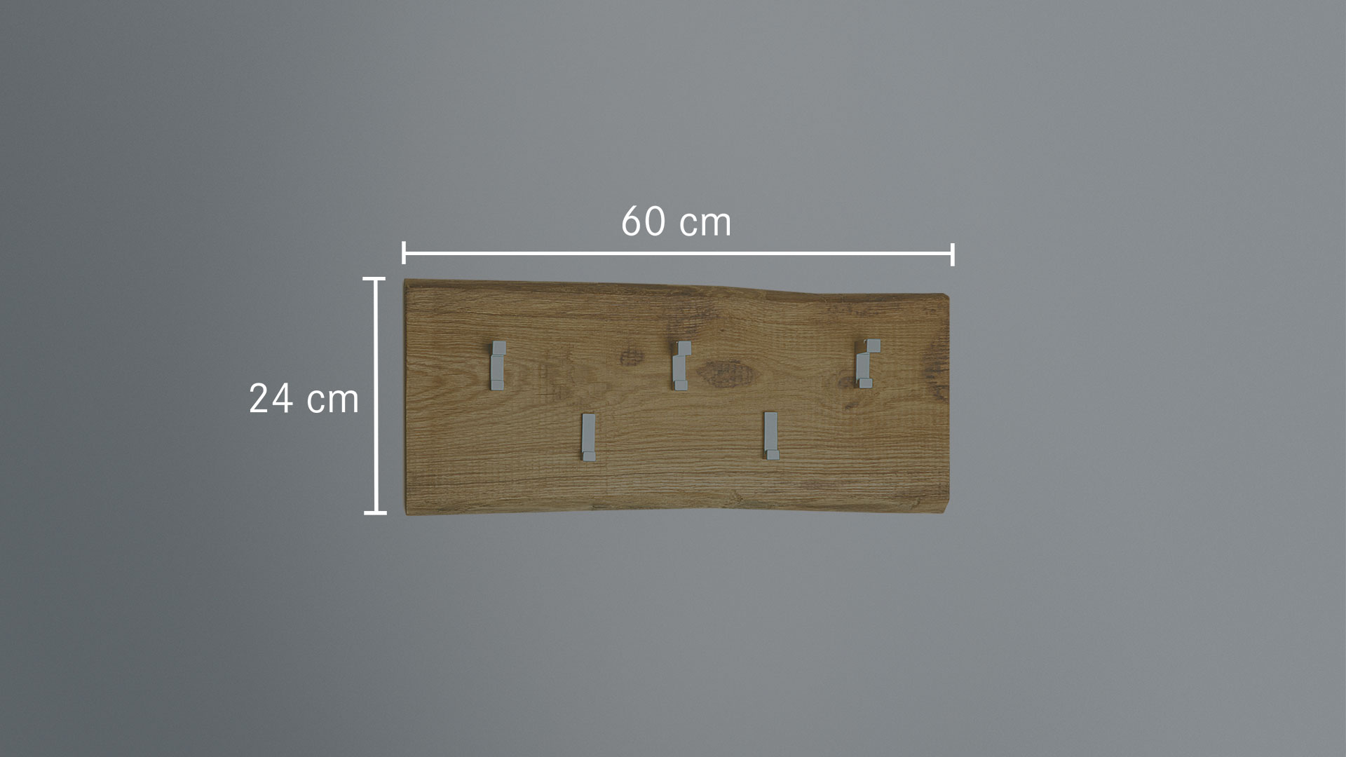 Holen Sie sich ein faszinierendes Stück massiver Eiche in Ihre Diele. Lassen Sie sich begeistern von dieser einzigartigen Klein-Garderobe, bei der für die Wandpaneele das Holz in rustikaler, der Natur nachempfundenen Form verwendet wird.