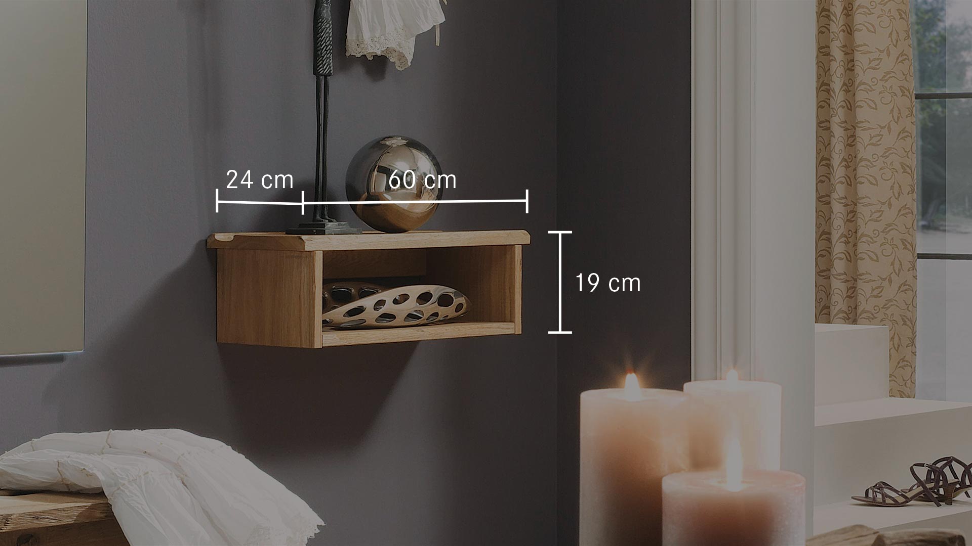 Glasböden und Metallelemente setzen moderne Kontraste zur rustikalen Basis. "Loca" sieht aber nicht nur gut aus. Auch Ihre Kleidung ist daran gut aufgehoben. Praktische Ablagen für Autoschlüssel und Co. runden das edle Garderoben-Konzept ab.