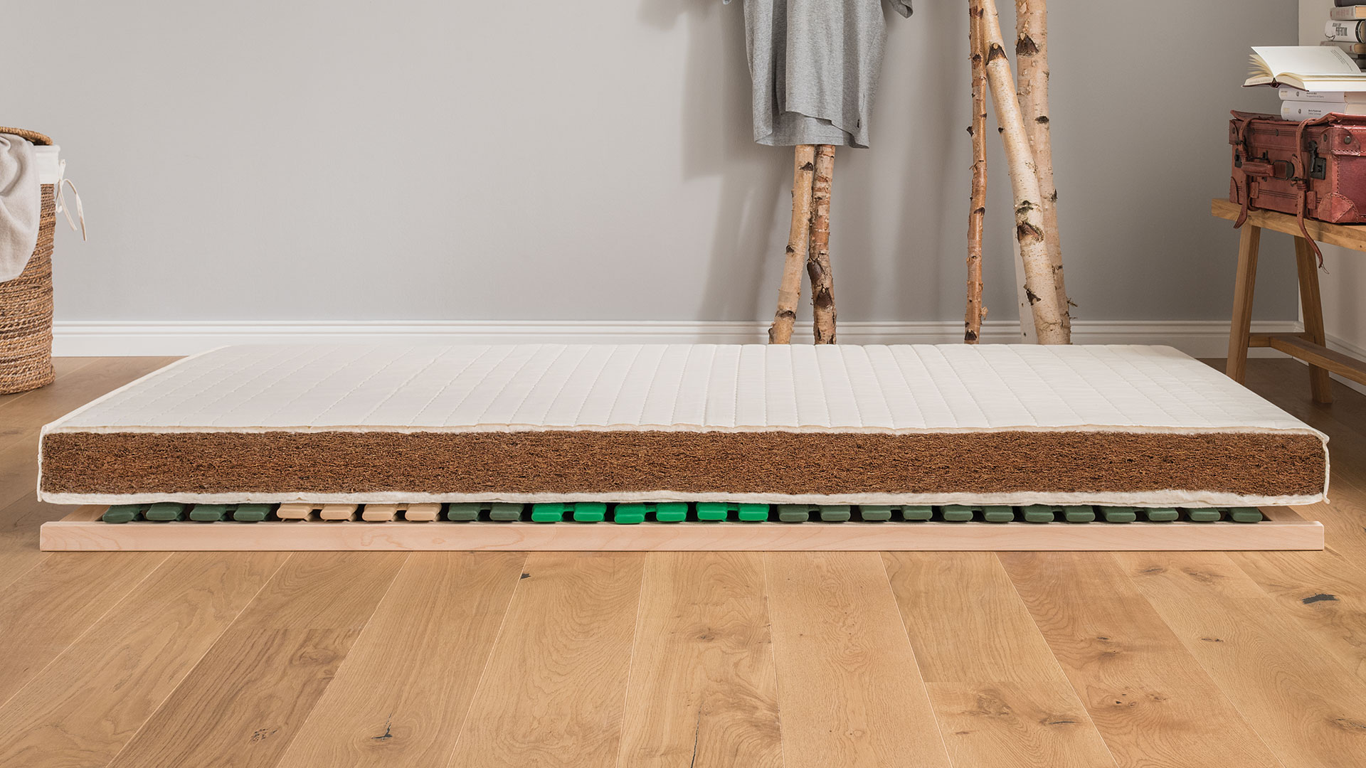 Unsere beiden größeren Kinder schlafen beide auf dieser Matratze. Hier haben wir das gute Gefühl, dass sie gesund liegen. Der Kleine bekommt die Matratze auch, wenn er in ein größeres Bett umzieht.Kokos-Jugendmatratze "Coconut"