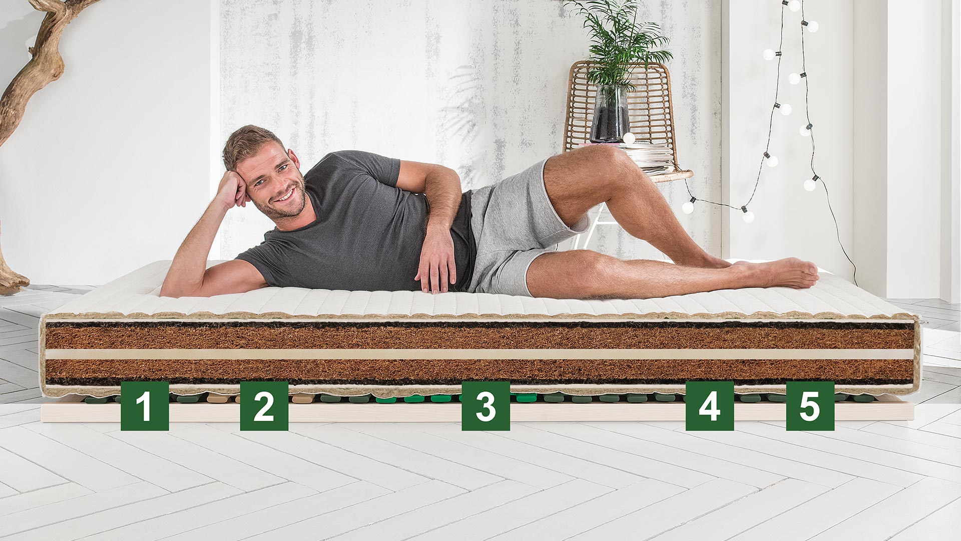 Die beiden 7 cm hohen Matratzenschichten bestehen aus latexierten Kokosfasern. Die Latexierung verleiht dem Kokos zusätzliche Elastizität.