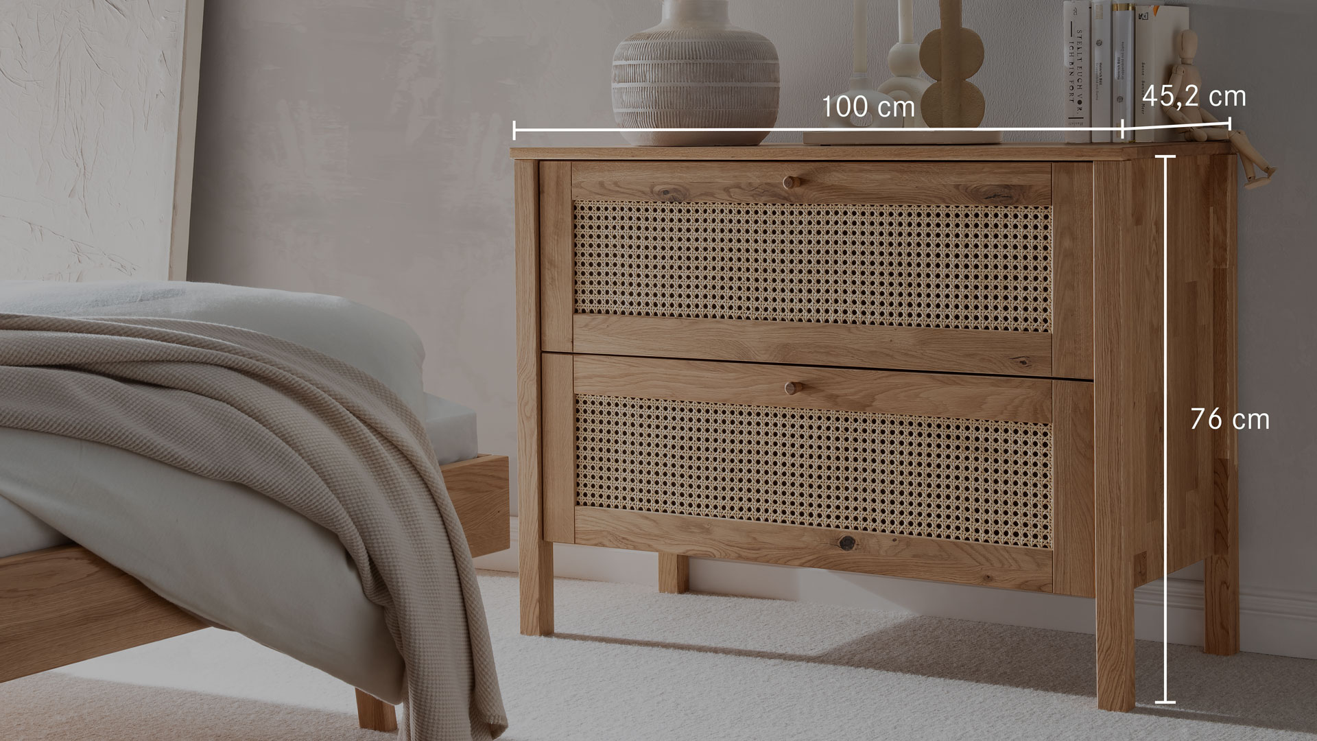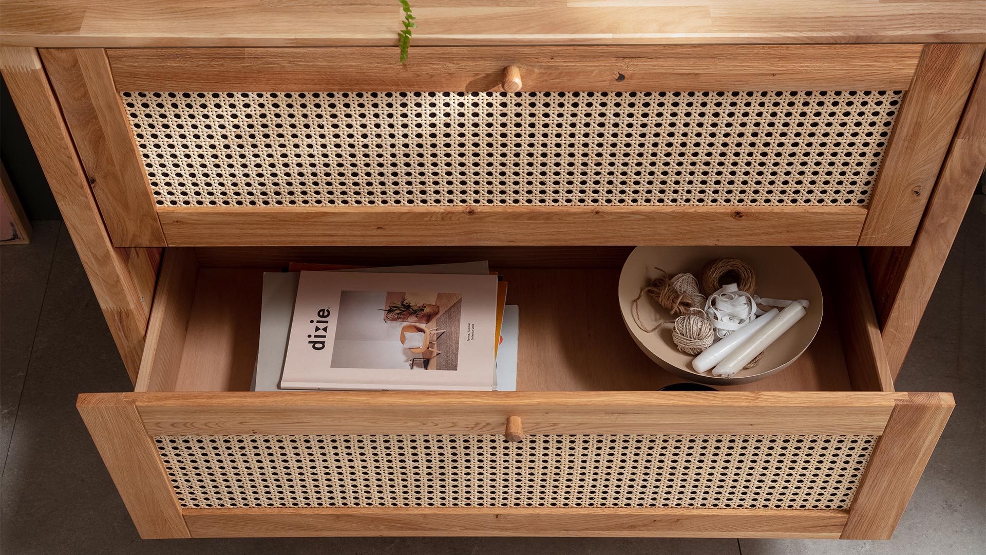Die beiden geräumigen Schubladen bieten derweil viel Platz für Ihre alltäglichen Dinge. Dank der eleganten Holzgriffe und den hochwertigen Beschlägen mit Soft-Close-Funktion ist alles schnell, schön und sicher eingeräumt.