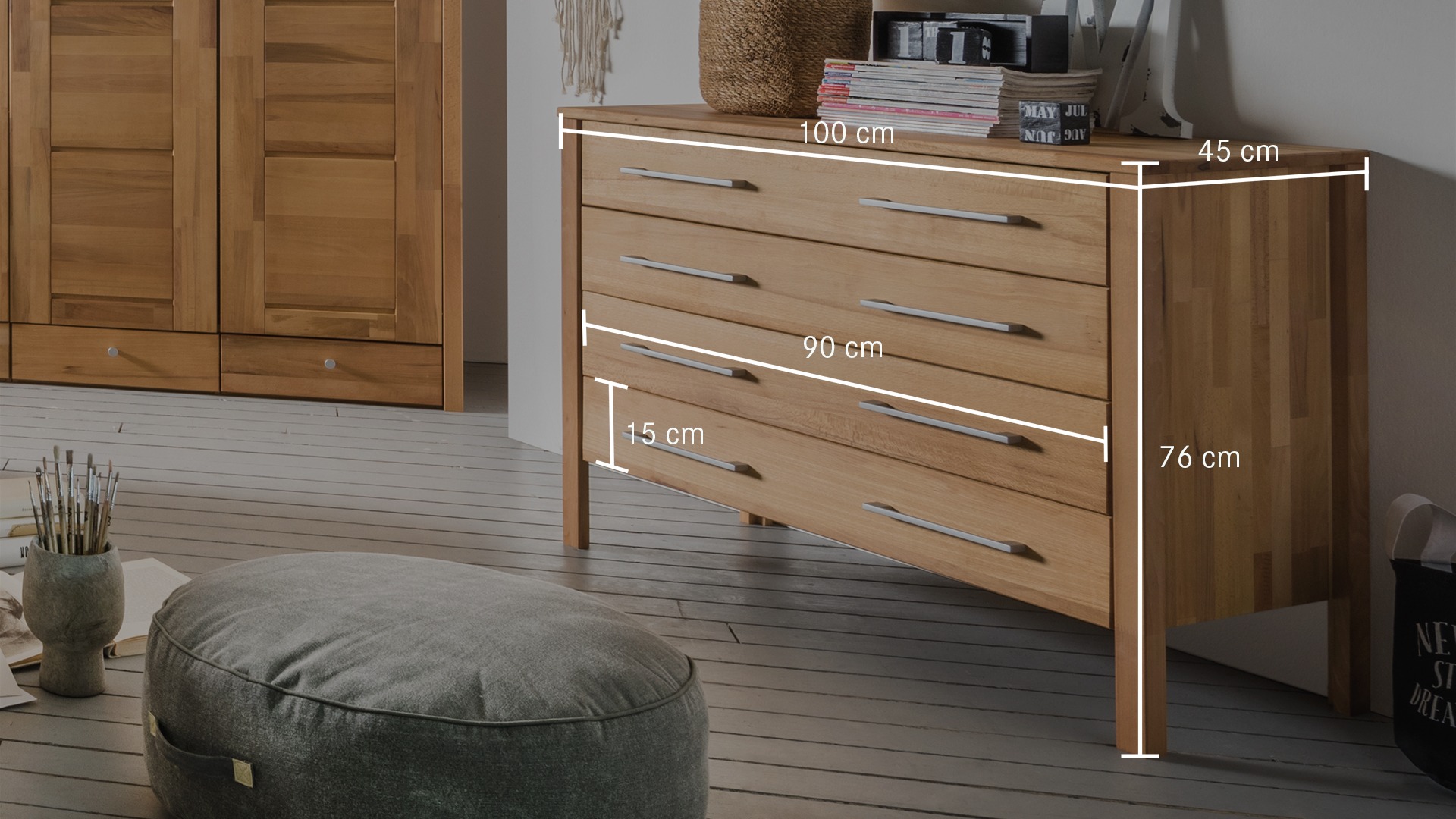 Die markanten Metall-Griffe machen diese Kommode zu einem modernen Blickfang. Das lebhafte Kernbuchenholz komplettiert die imposante Erscheinung. Bei diesem pfiffigen Ordnungshelfer sorgen vier breite Schubladen für äußerst viel Stauraum. Die zeitlose Gestaltung und die hochwertige Verarbeitung garantieren nicht nur im Jugendzimmer natürlichen Charme, sondern machen dieses Programm auch zu einer Bereicherung für die spätere Wohnung.