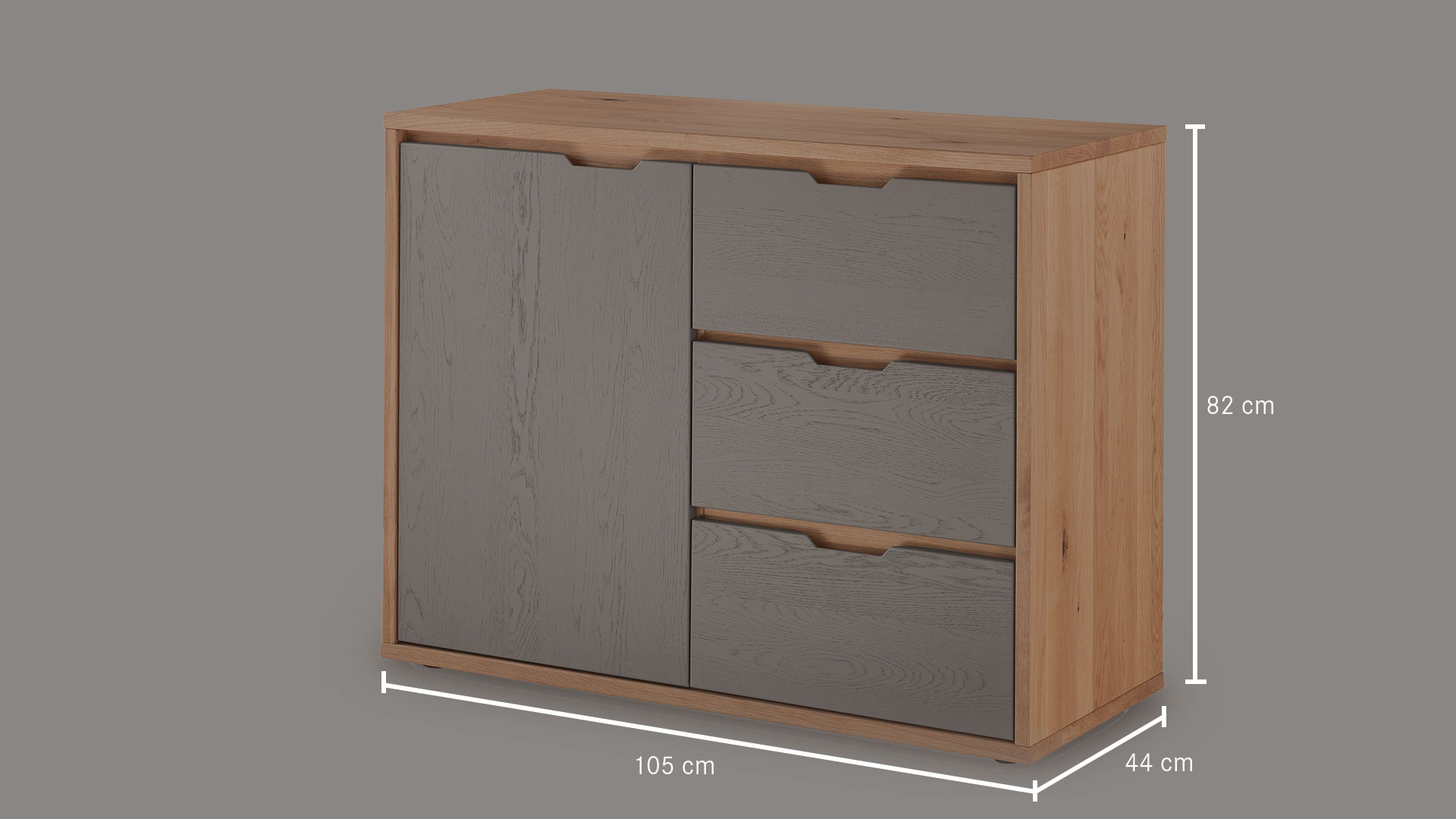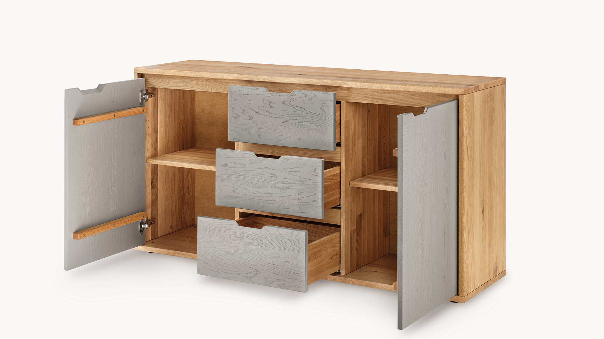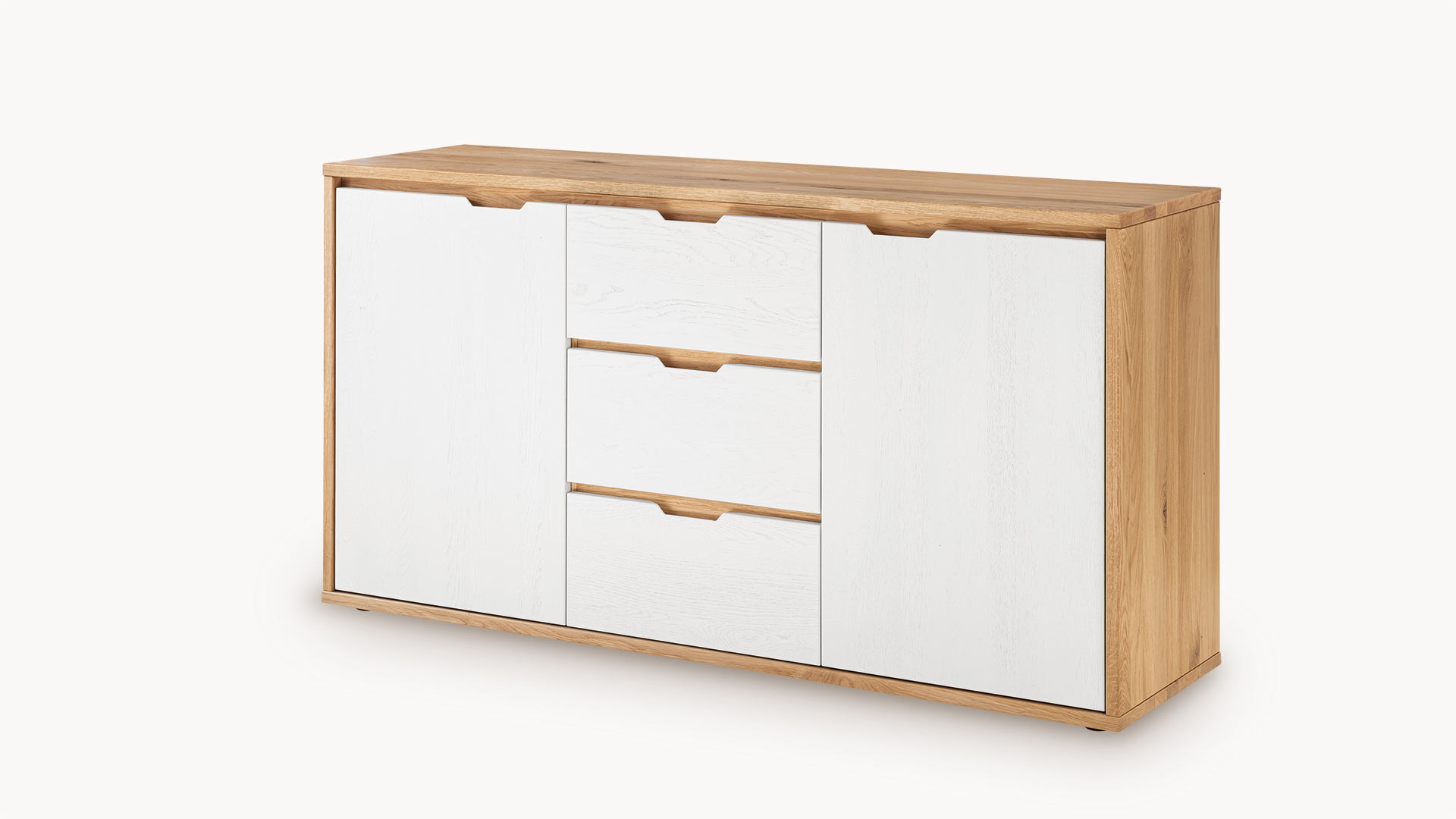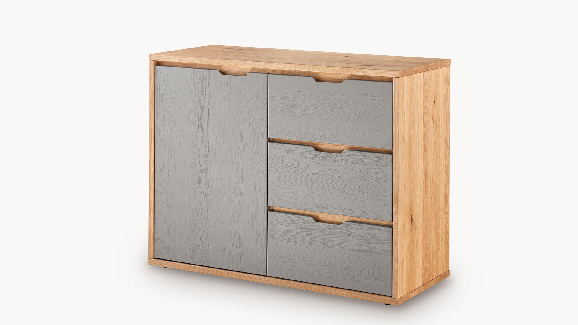 Kommode "Gravia" bringt klassische Formgebung und natürliche Materialien in harmonischen Einklang. Ihr Korpus aus naturfarbener Wildeiche strahlt Wärme und Ruhe aus, während die wahlweise grau oder weiß gehaltenen Fronten einen stilvollen Farbkontrast setzen - dezent, modern und doch markant.