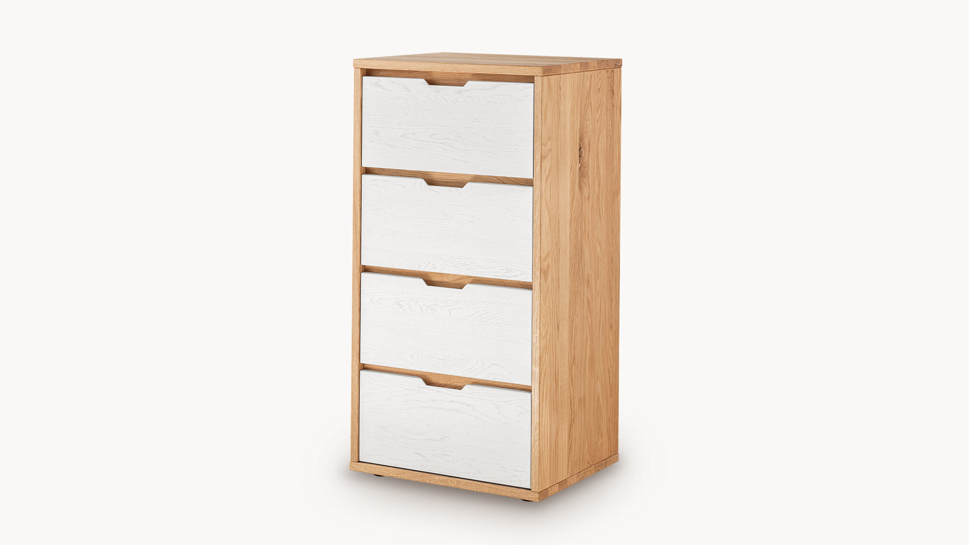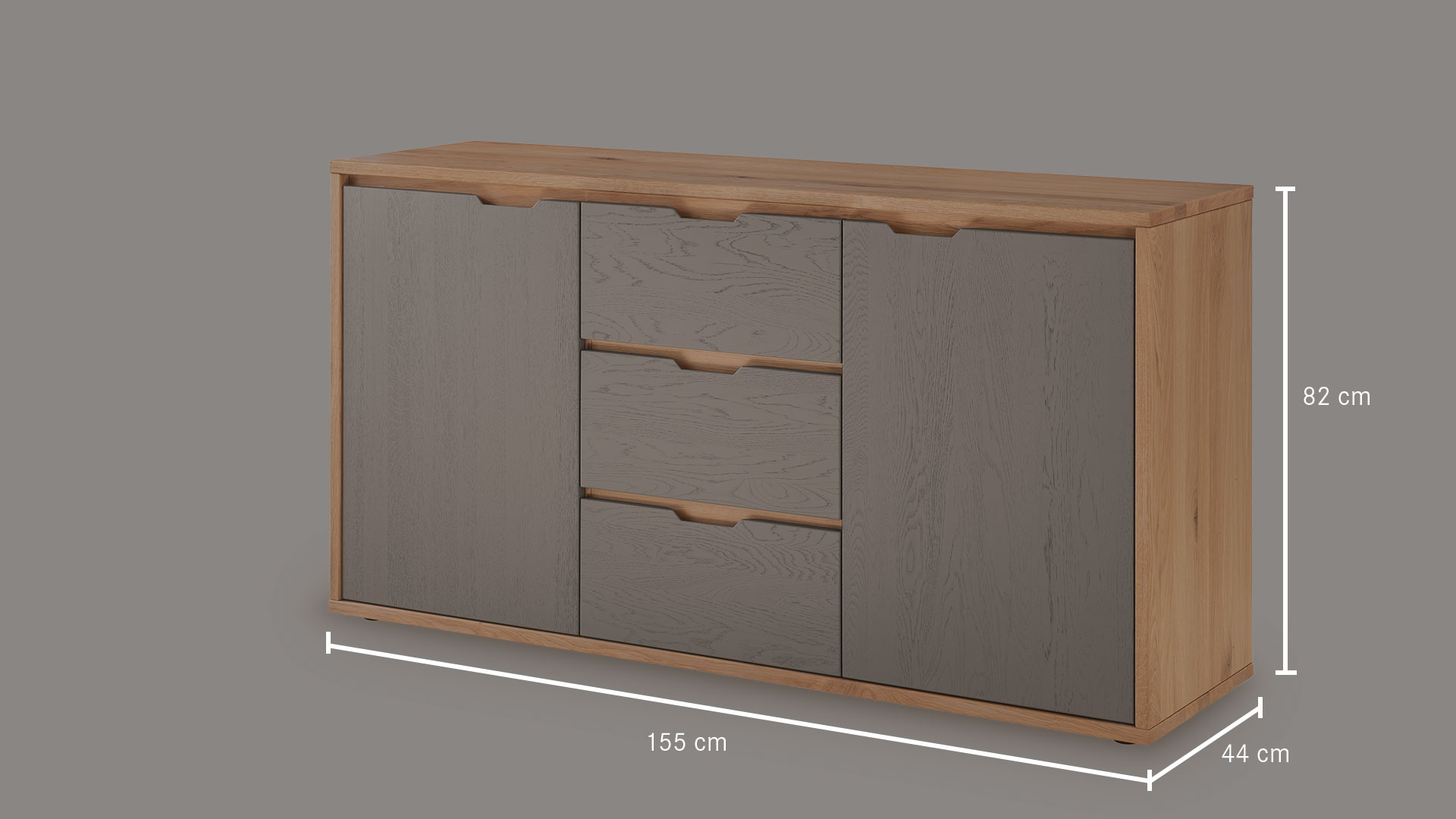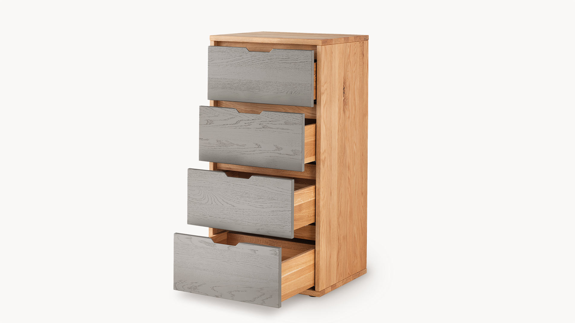Kommode "Gravia" bringt klassische Formgebung und natürliche Materialien in harmonischen Einklang. Ihr Korpus aus naturfarbener Wildeiche strahlt Wärme und Ruhe aus, während die wahlweise grau oder weiß gehaltenen Fronten einen stilvollen Farbkontrast setzen - dezent, modern und doch markant.