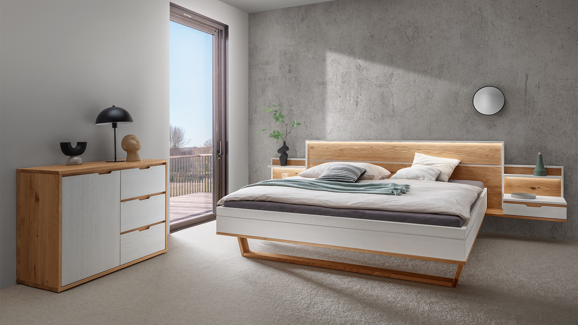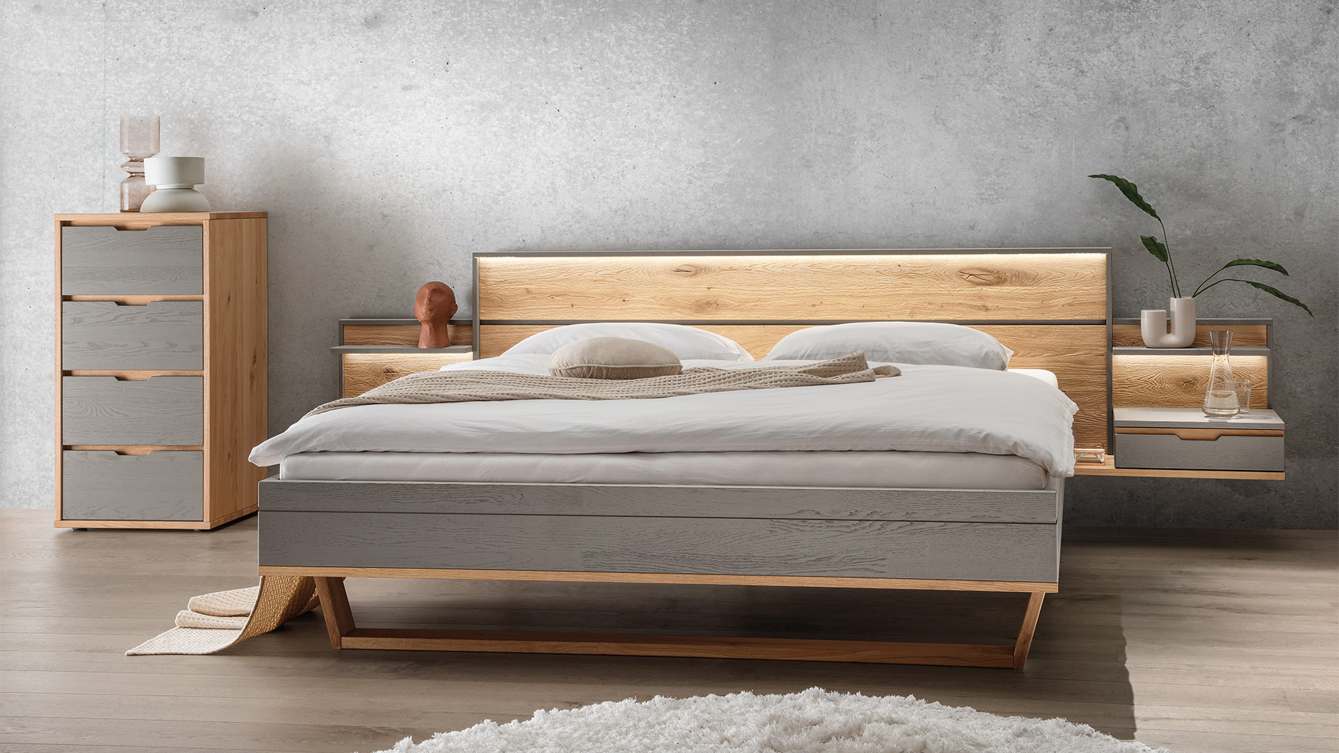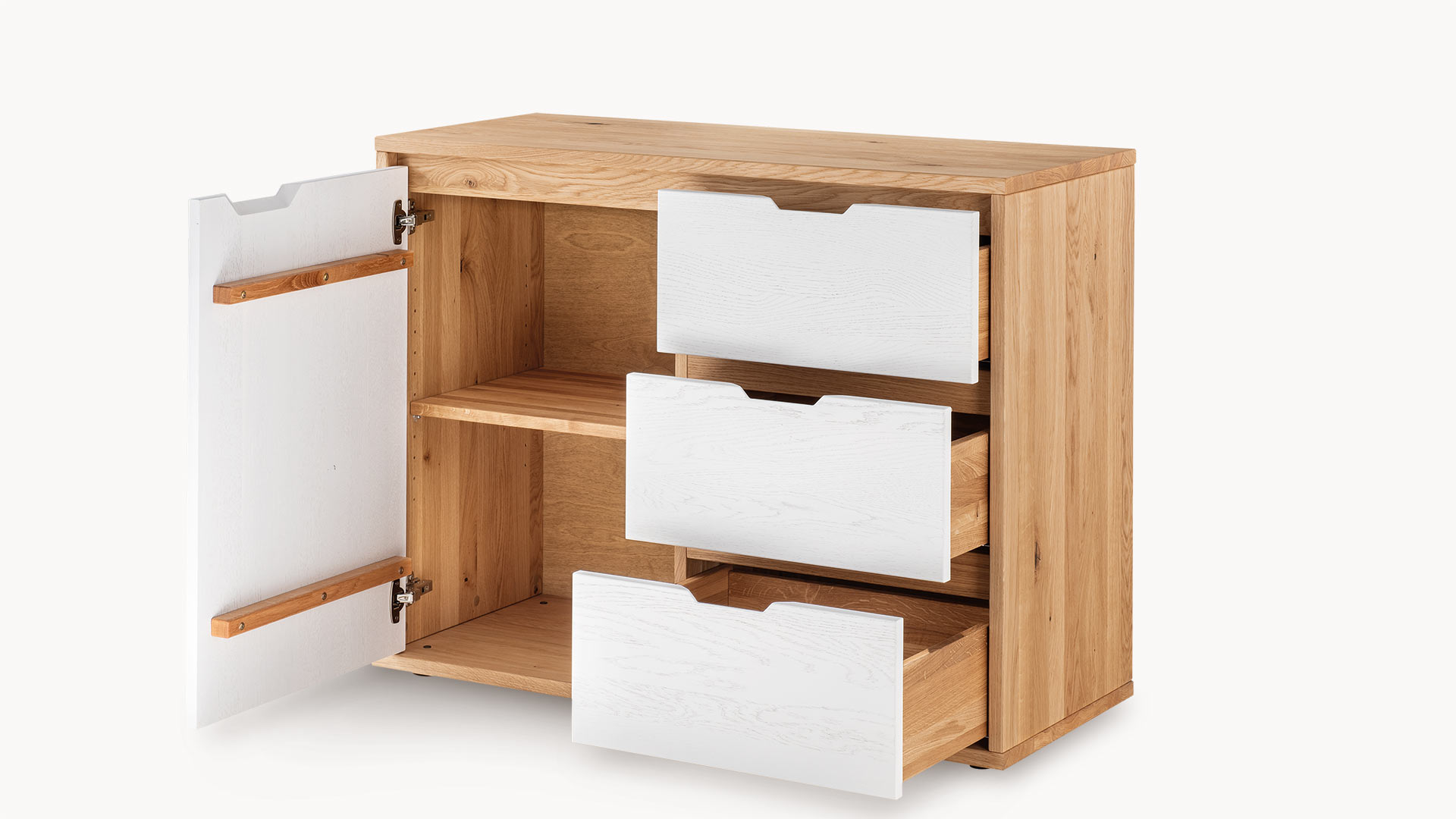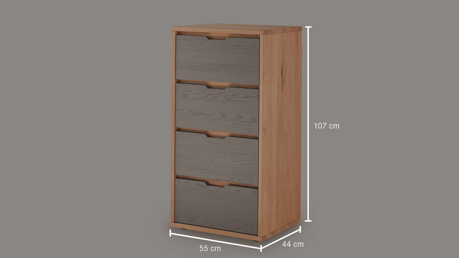 Kommode "Gravia" bringt klassische Formgebung und natürliche Materialien in harmonischen Einklang. Ihr Korpus aus naturfarbener Wildeiche strahlt Wärme und Ruhe aus, während die wahlweise grau oder weiß gehaltenen Fronten einen stilvollen Farbkontrast setzen - dezent, modern und doch markant.