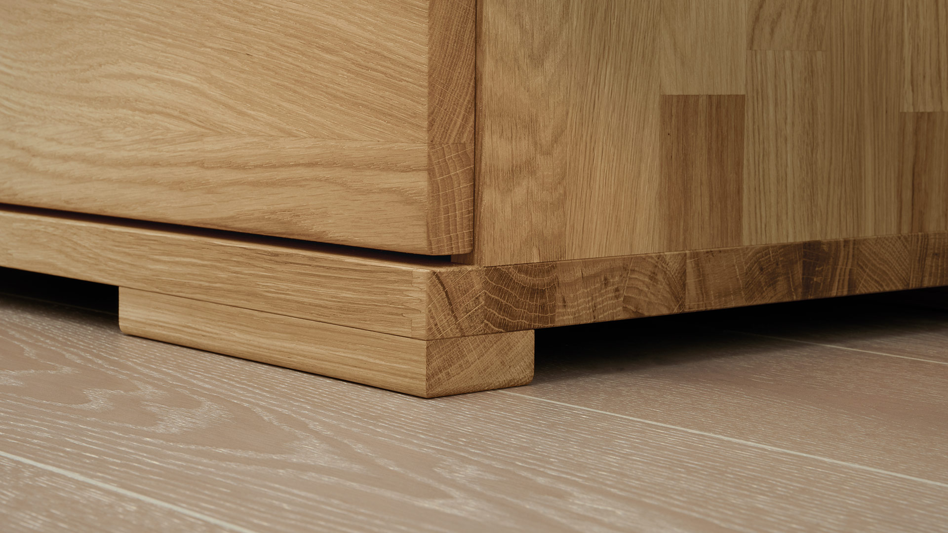 Um die klare Optik der Kommode nicht zu stören, haben die Möbeldesigner auf hervorstehende Griffe verzichtet. Die Türen und Schubladen lassen sich an dezenten Griffmulden öffnen, die sich perfekt in das unaufgeregte Gesamtbild einfügen. Softclose-Dämpfer an den Türen und Schubladen gewährleisten das sanfte Schließen ohne Knall. Die praktische Kommode steht auf breiten, aber flachen Schrankfüßen, die perfekt zum Gesamtbild passen.