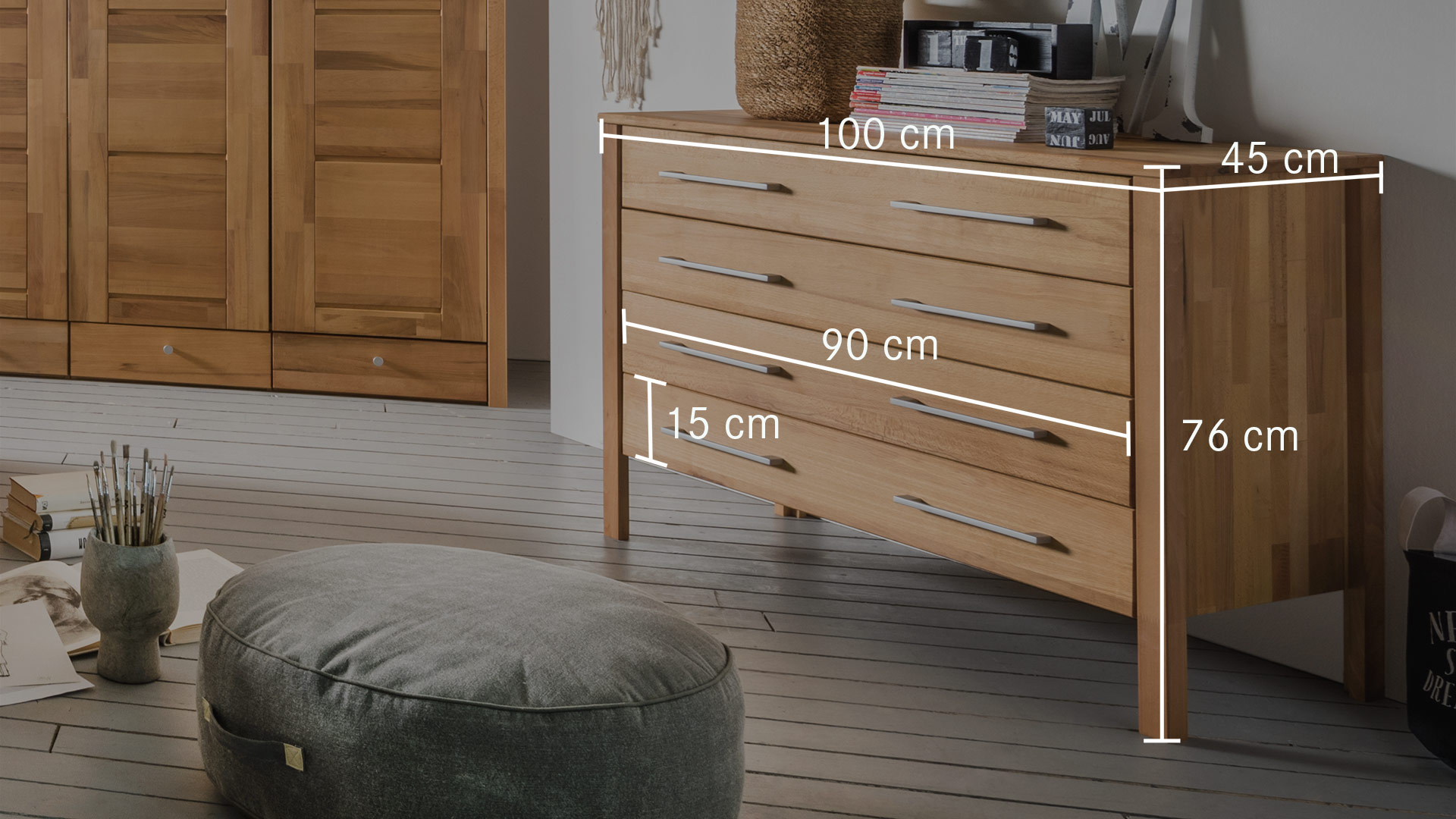 ... vier breite Schubladen warten darauf, von Ihnen befüllt zu werden und Ihre Schätze für Sie bereitzuhalten. Freuen Sie sich auf Ihren neuen Ordnungshüter aus lebhaftem Kernbuchenholz.