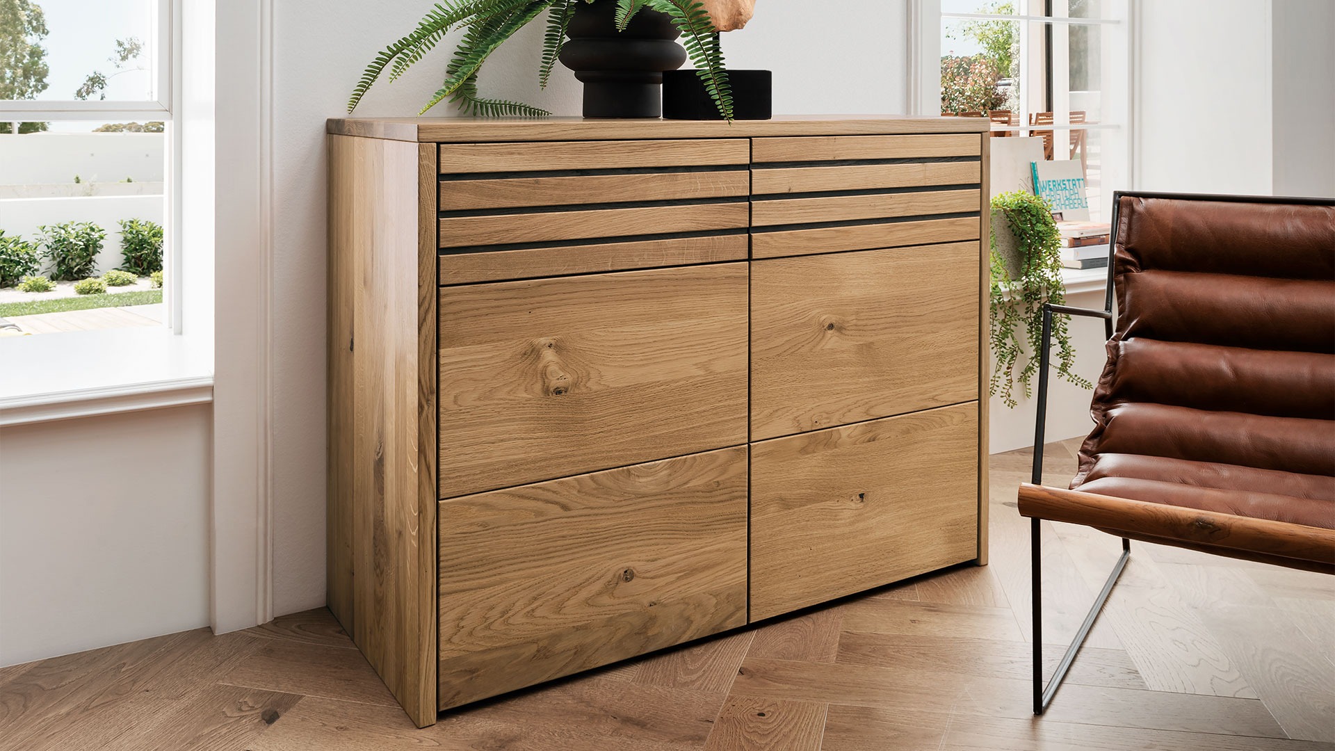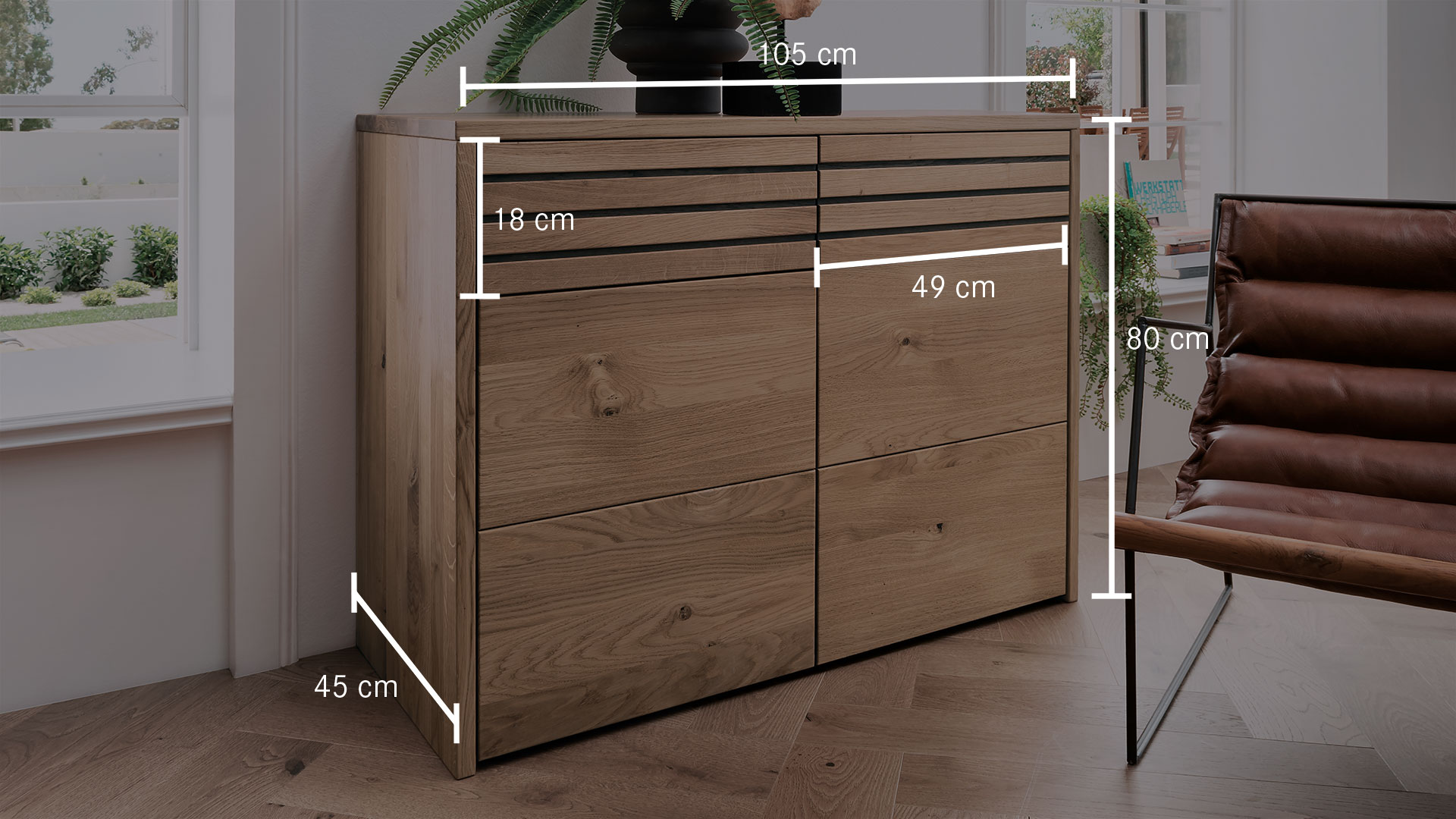 Natürlich in den zwei Schubladen und hinter den beiden Türen! Dieses Schmuckstück macht sich übrigens auch hervorragend in Ihrer Diele oder hält im Esszimmer das Geschirr für Sie bereit. Durch die Kombination der raffinierten Schubladen und dem einzigartig gemaserten Wildeichenholz entsteht ein wahres Kunstwerk. Lust auf noch mehr Abwechslung bekommen? Mit weiteren Möbeln aus der unkonventionellen Serie "Neras" schaffen Sie sich einen Wohn(t)raum, der Sie jeden Tag aufs Neue begeistert!