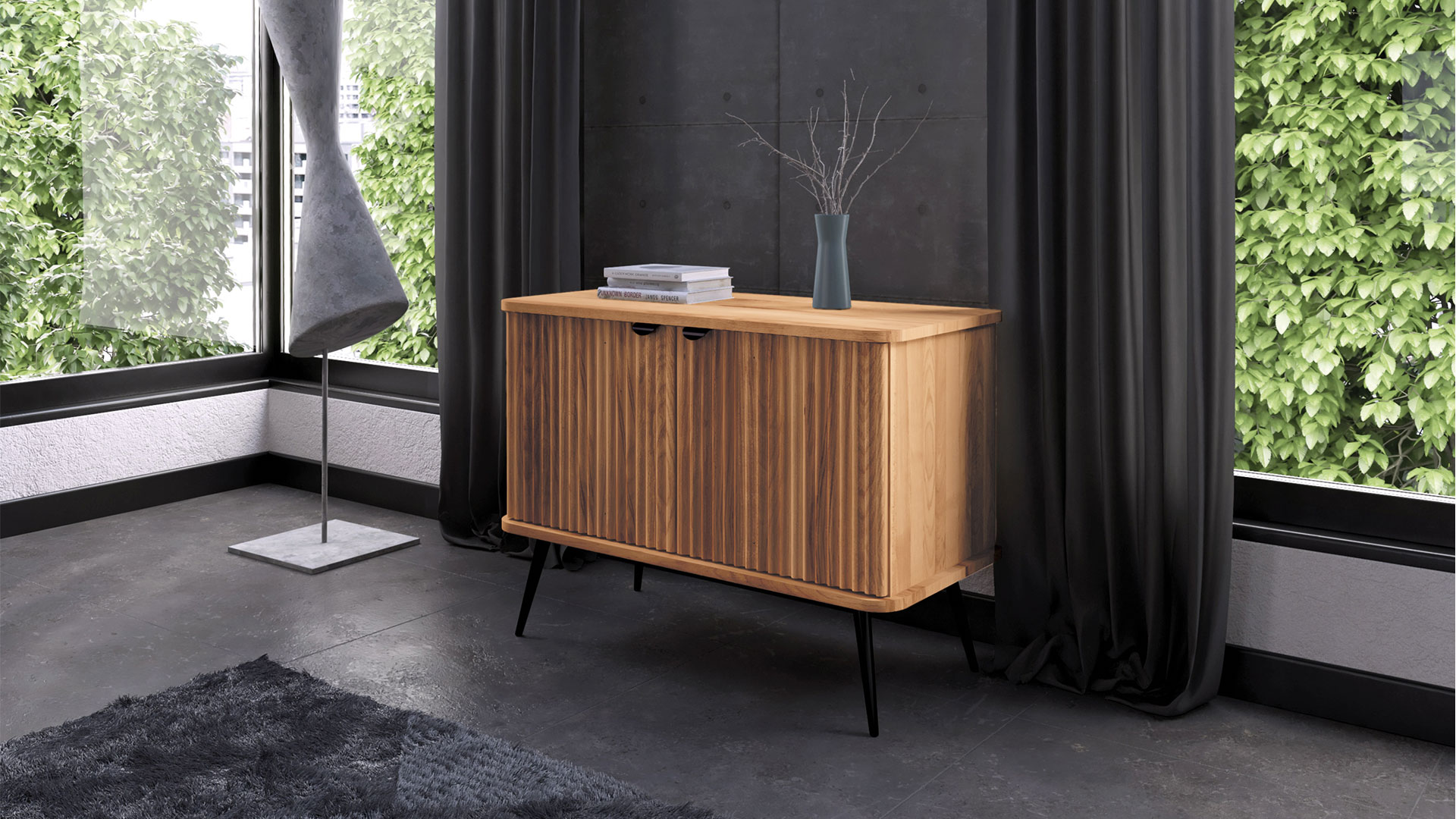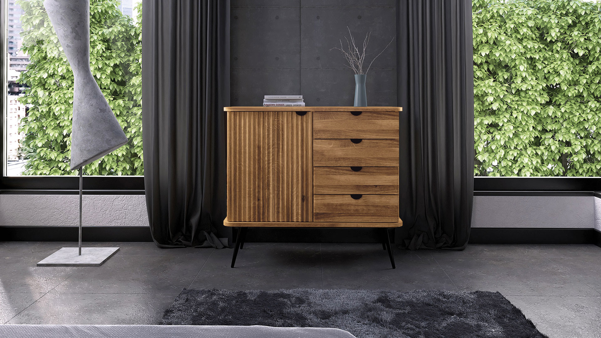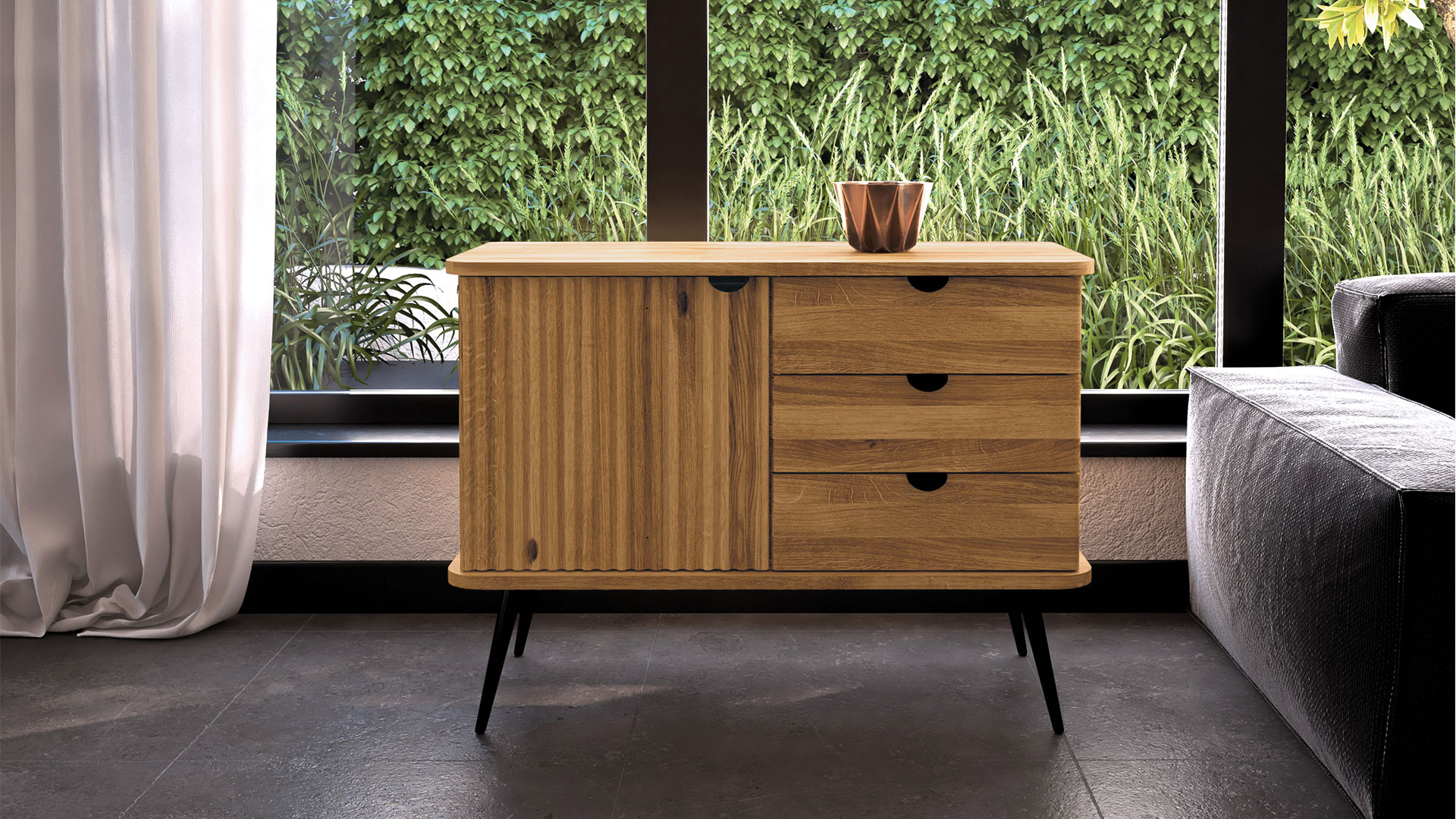 Die Kommode "Ondas" überzeugt durch ihre Schranktüren mit Wellen-Relief. Dieses schafft in Verbindung mit der Maserung des massiven Wildeichen- oder Kernbuchenholzes ein einmaliges Aussehen, das Sie verzaubern wird.