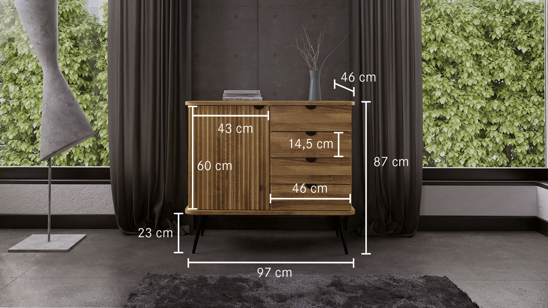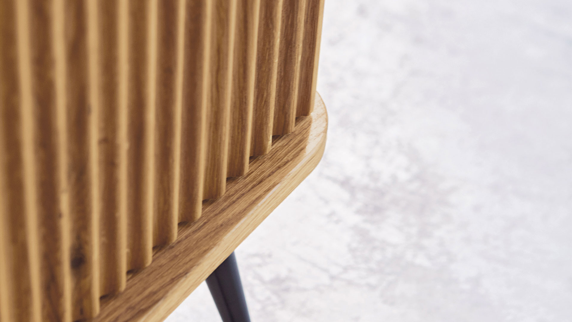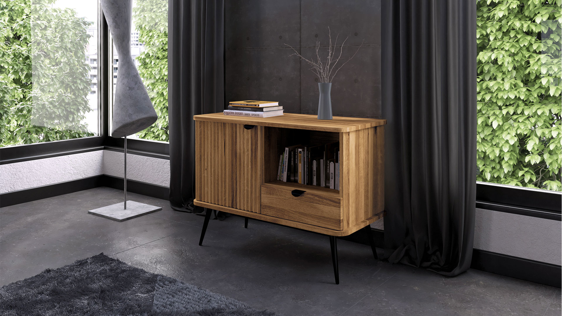 Die Kommode "Ondas" überzeugt durch ihre Schranktüren mit Wellen-Relief. Dieses schafft in Verbindung mit der Maserung des massiven Wildeichen- oder Kernbuchenholzes ein einmaliges Aussehen, das Sie verzaubern wird.