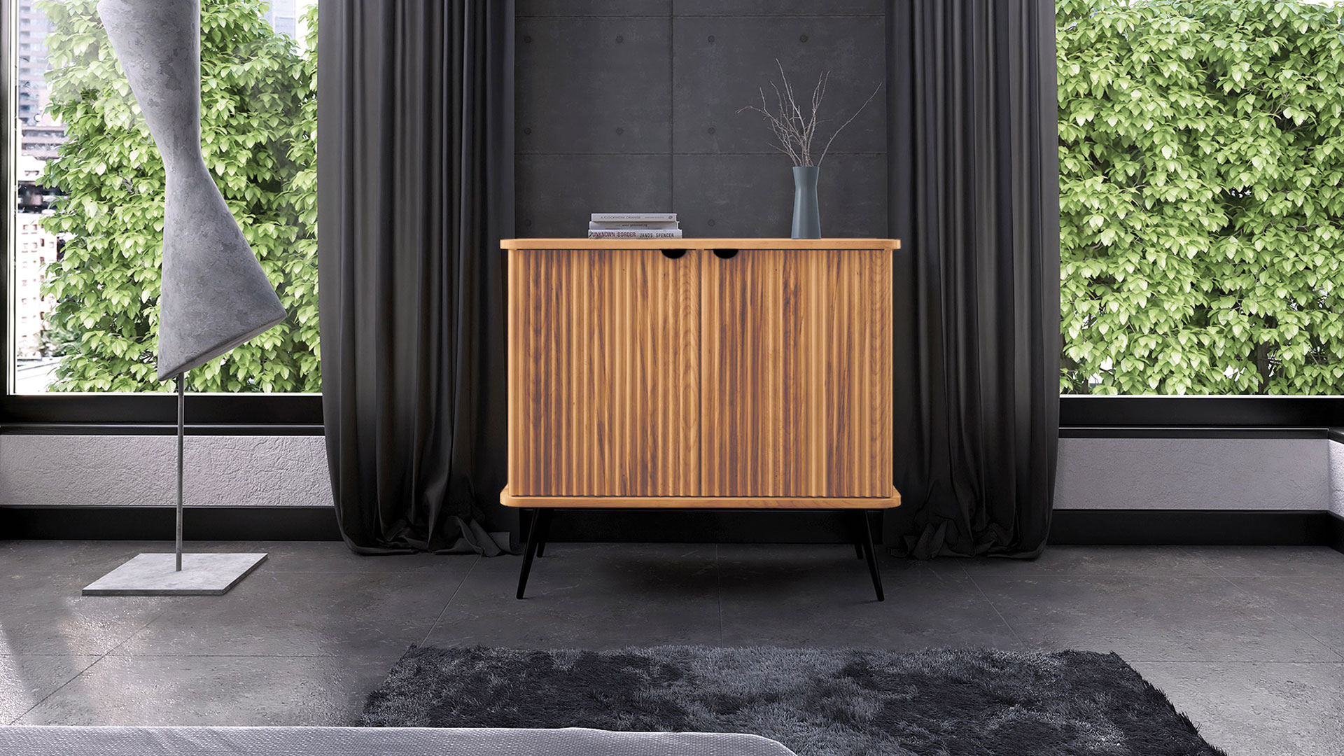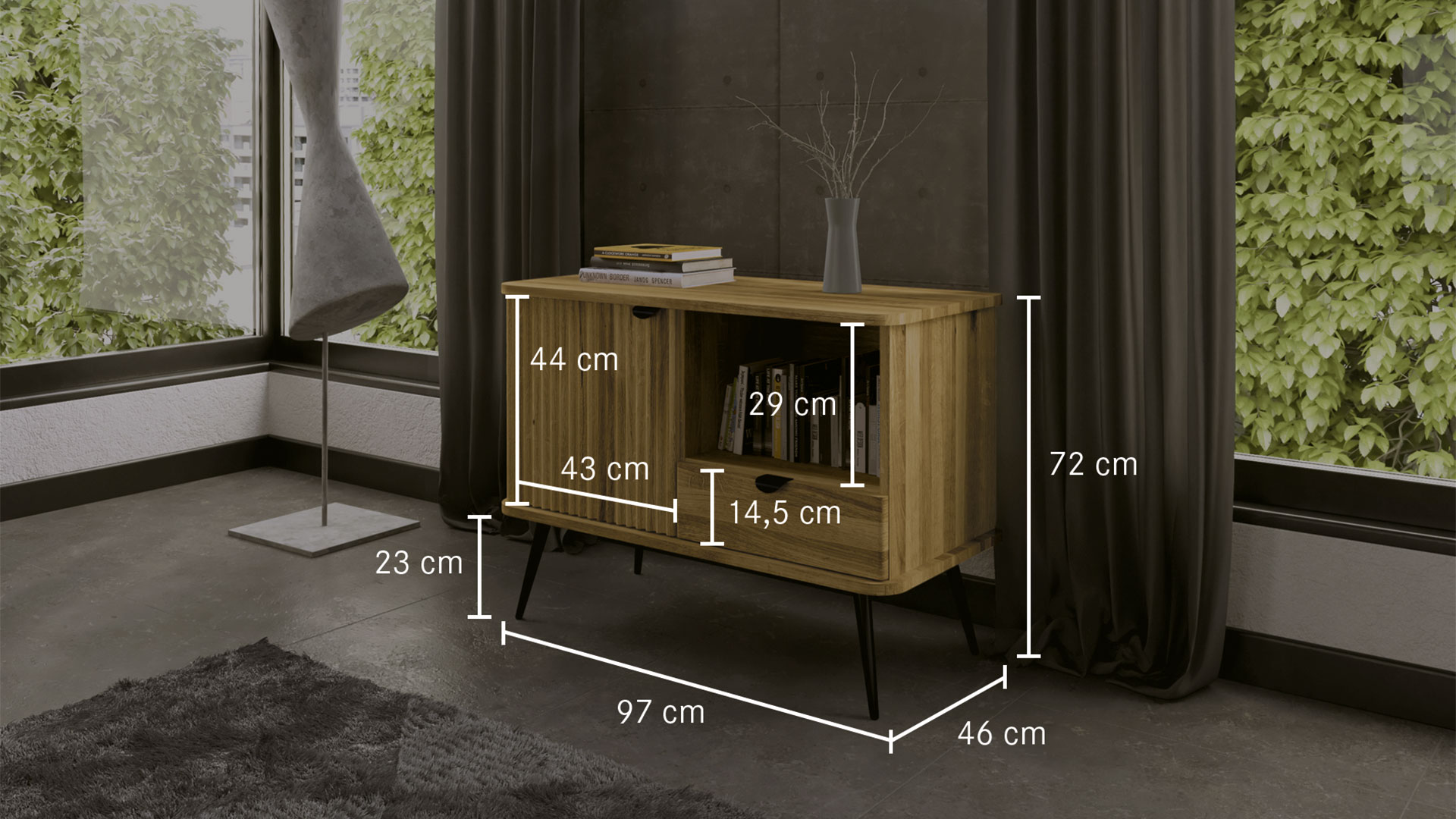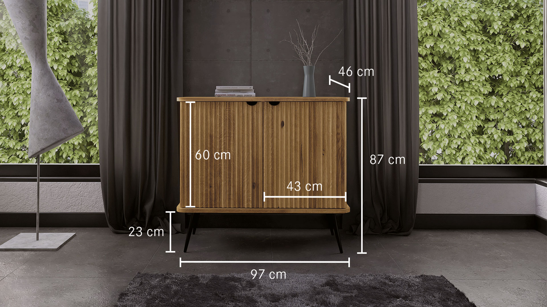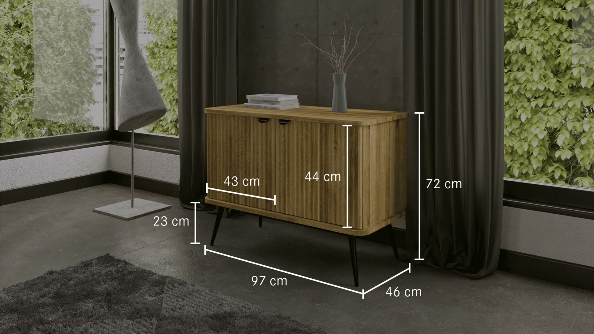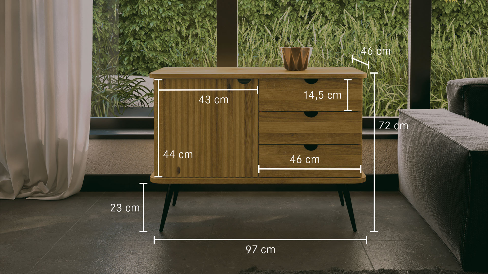 Die abgerundeten Kanten des Holzes und die leicht schräg verlaufenden Füße aus schwarzem Metall unterstreichen den edlen Retro-Look der Kommode. Die schwarzen Metallgriffe sind am oberen Ende der Schubladen oder Schranktüren angebracht und geben dem Gesamtbild weitere optische Akzente. "Ondas" ist in 5 Varianten erhältlich und freut sich auf einen Platz in Ihrem Zuhause.