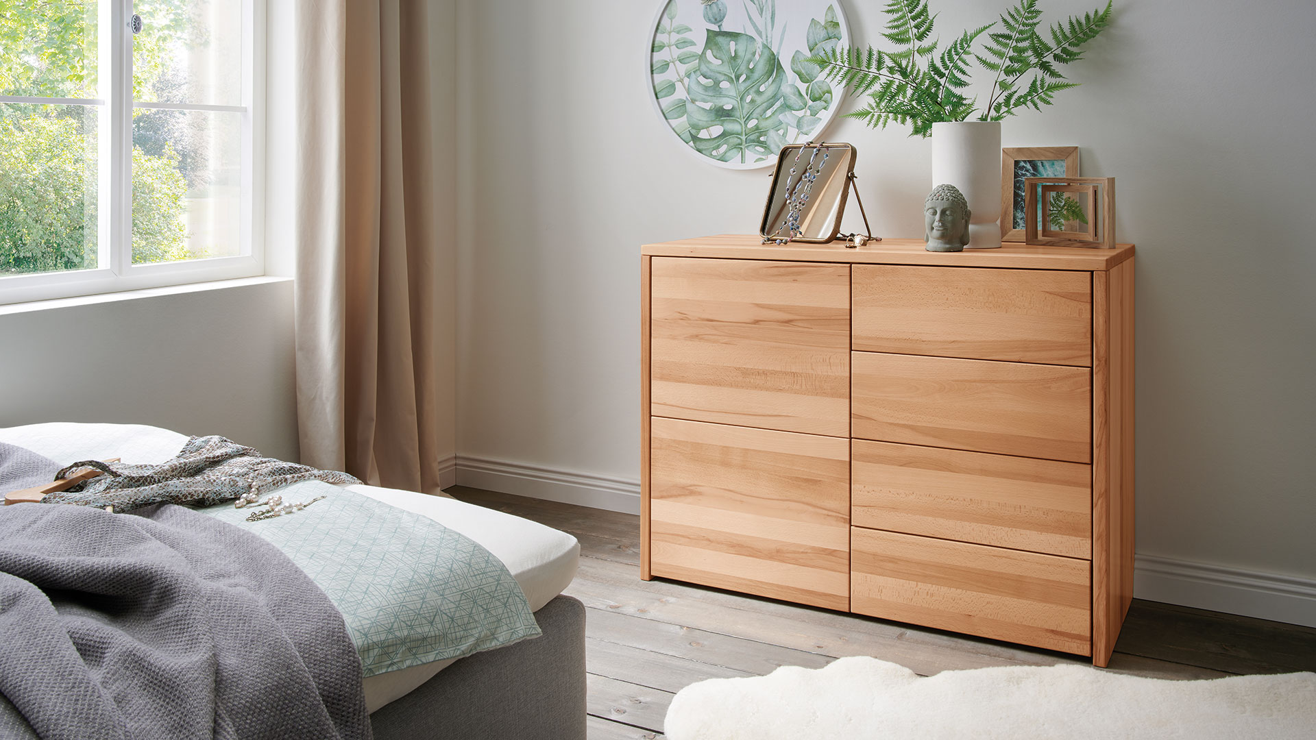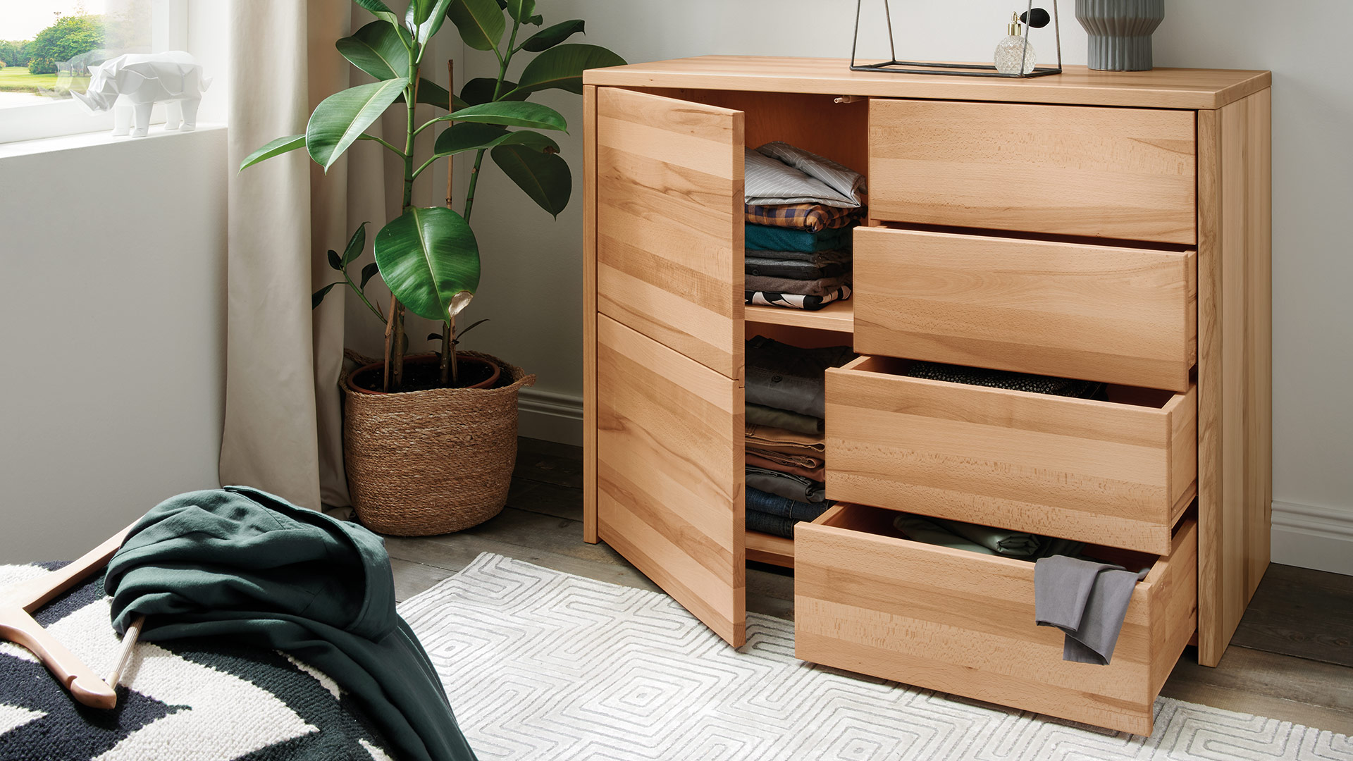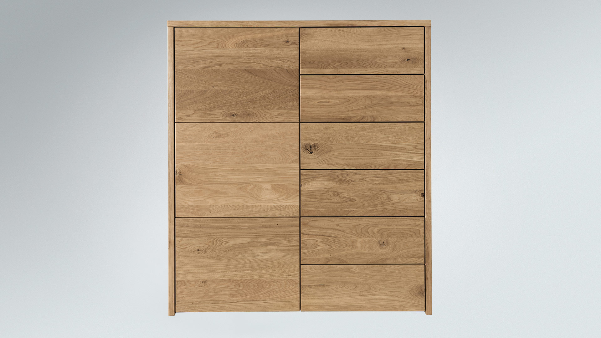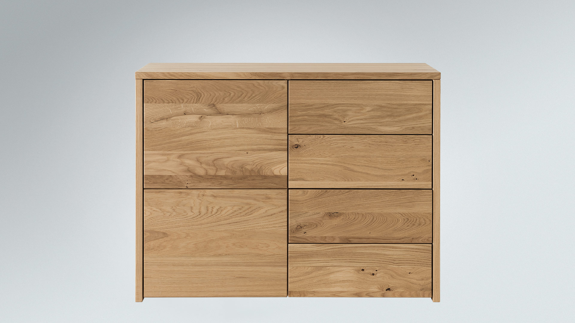 Um die klare Linie zu unterstreichen! Auch die dezenten Querfugen kommen so perfekt zur Geltung. Schubladen und Türen sind mit einer Tip-On Funktion versehen und öffnen auf leichten Druck. Ob in Kernbuche mit geschwungener Maserung oder Wildeiche mit markanter Zeichnung - Kommode "Selva" stellt den Charakter dieser lebhaften Hölzer perfekt in den Vordergrund. Wir bieten Ihnen dieses vielseitige Massivholzmöbel in 3 praktischen Varianten an. Genau das Richtige für Ihr Schlafzimmer, die Diele oder Ihren Essbereich!