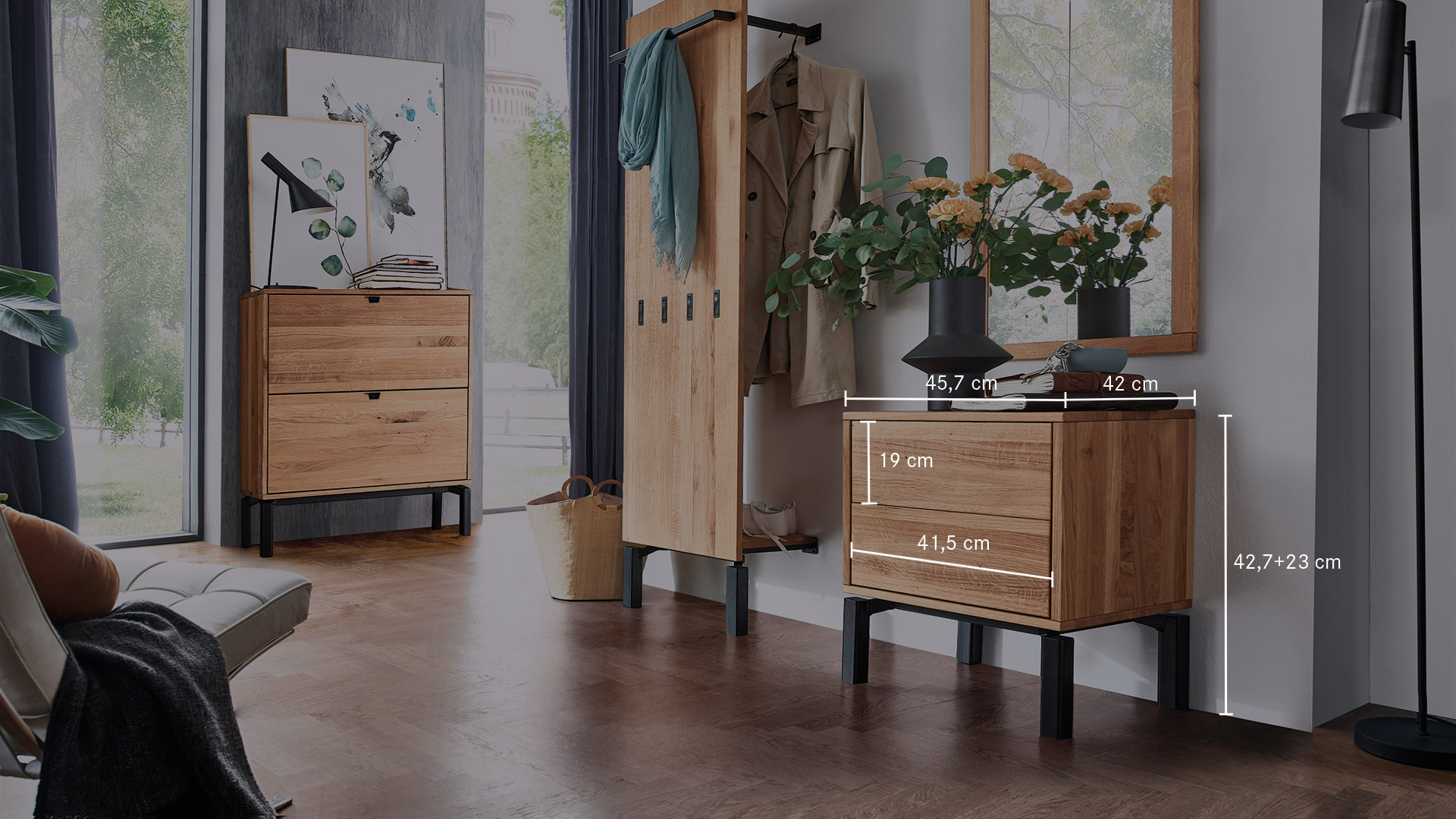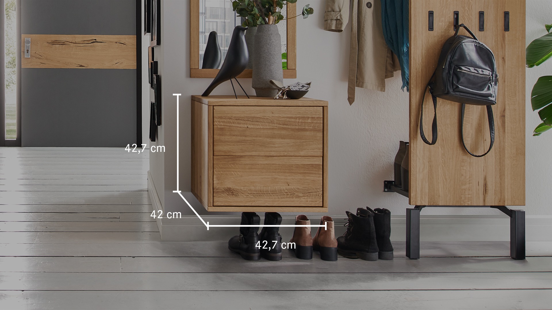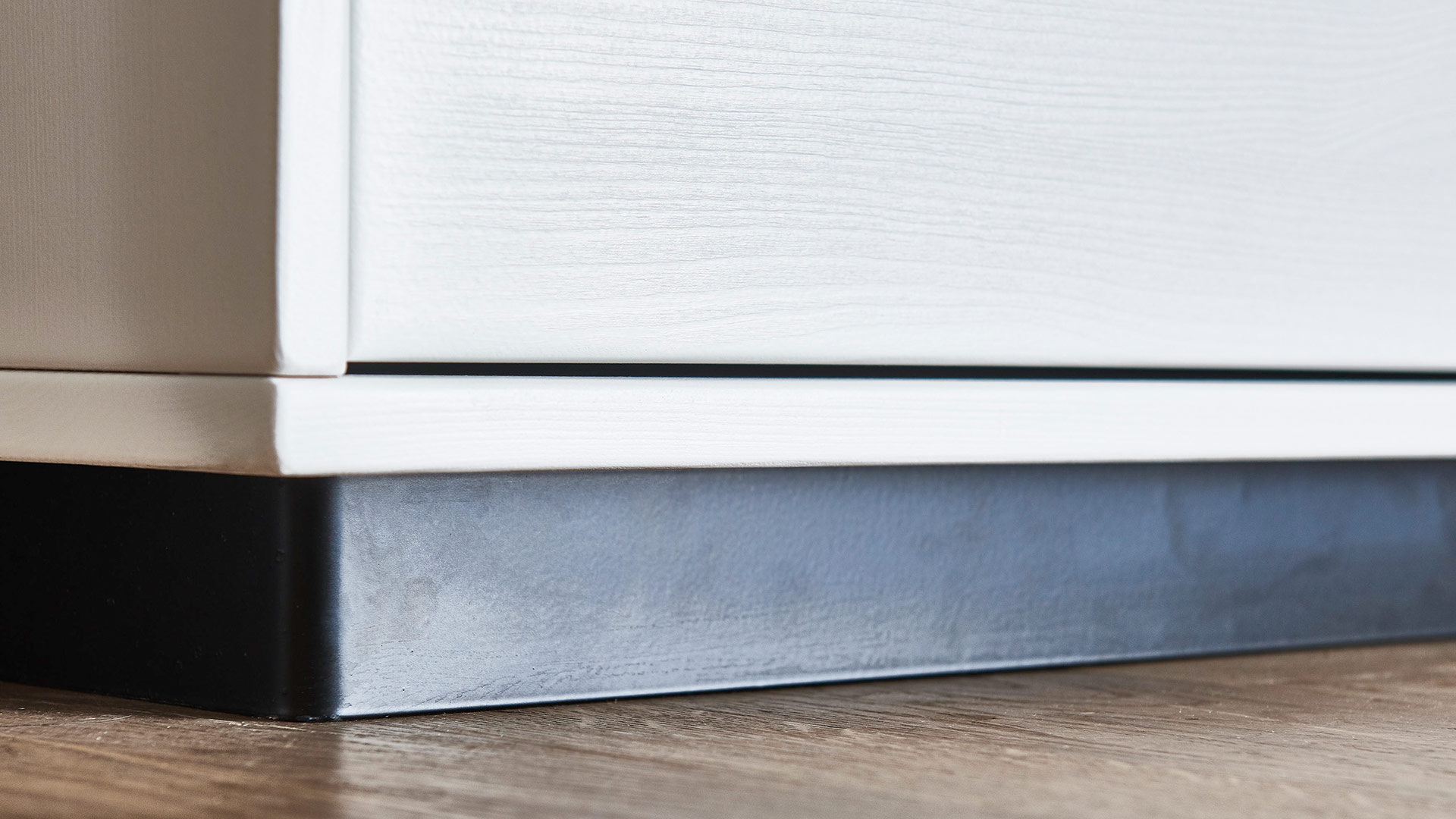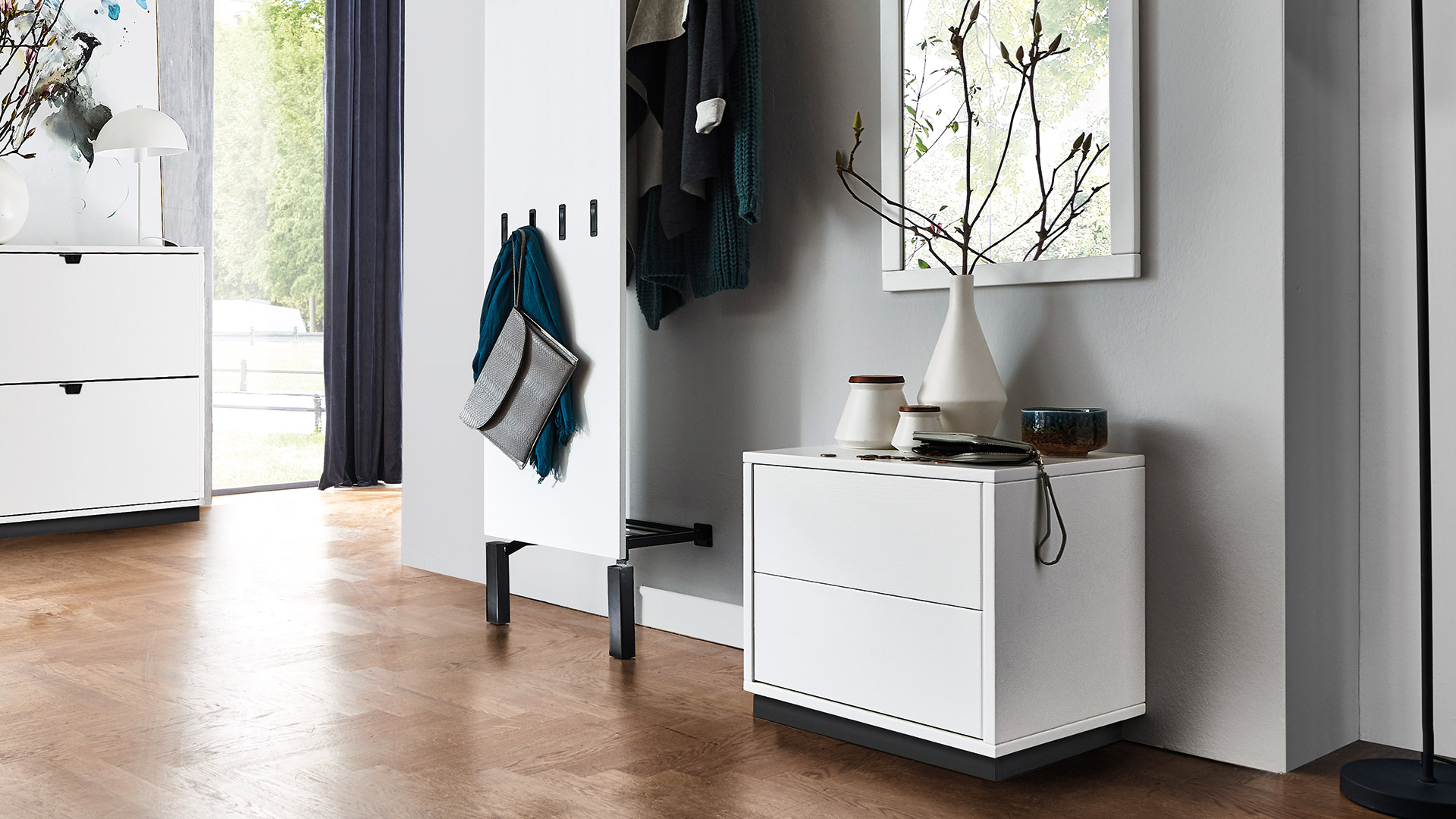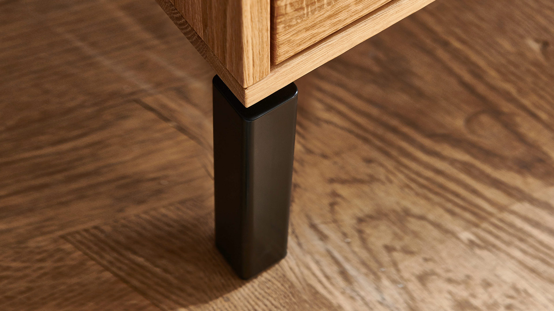 Dann hängen Sie die Kommode doch einfach an die Wand! Praktischer Vorteil dieser "schwebenden" Kommode: Staubsauger und Wischer gleiten mühelos unter den Schrank. Schmutz hat somit keine Chance. Sie können "Vestido" aber auch Bodenhaftung geben. Wählen Sie dazu aus 3 raffinierten Fußlösungen aus schwarzem Metall.