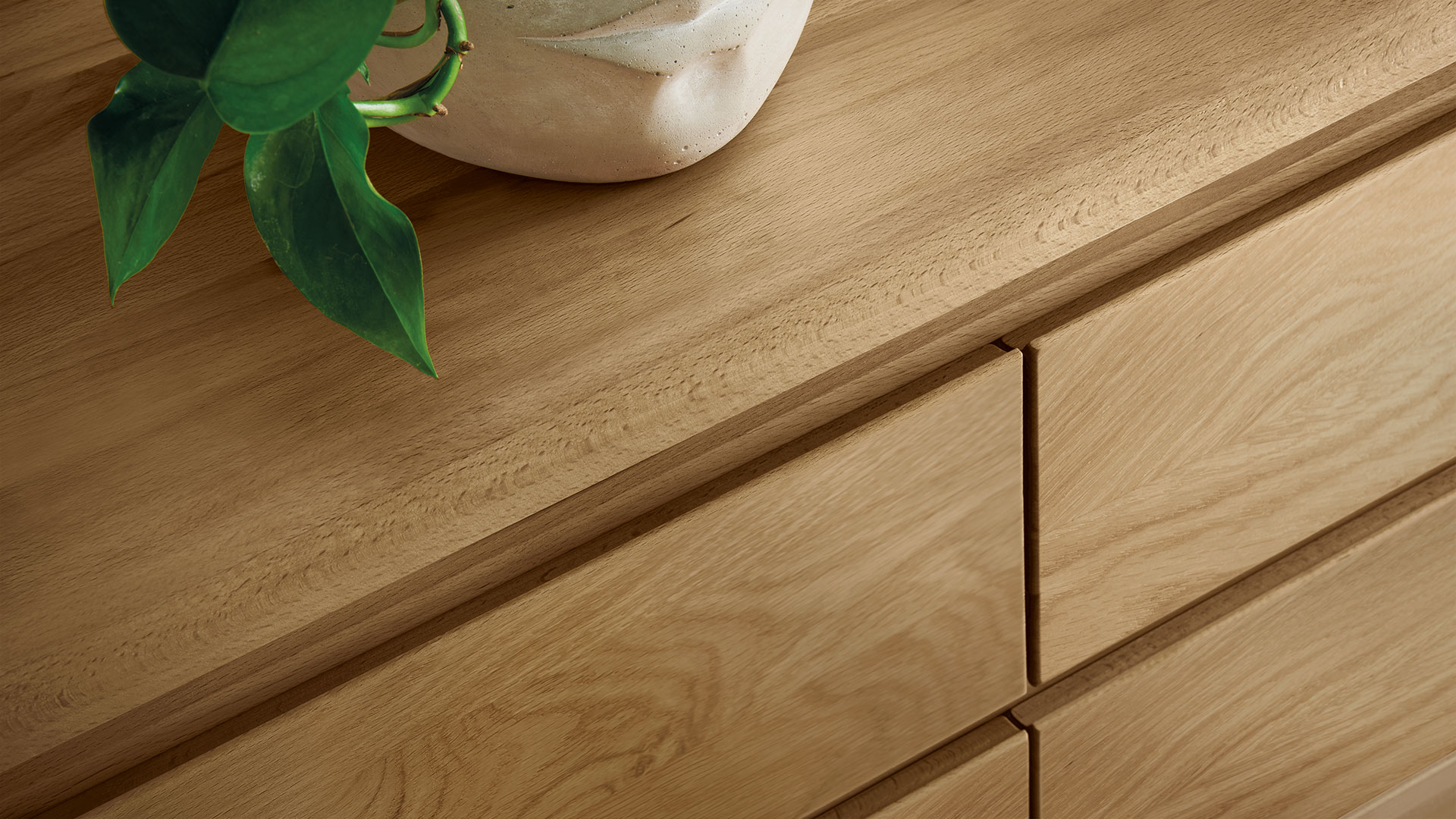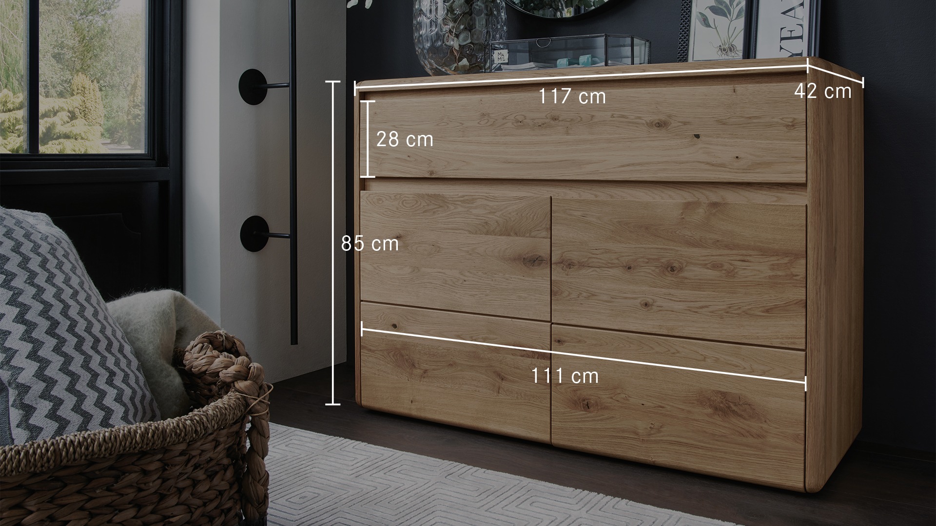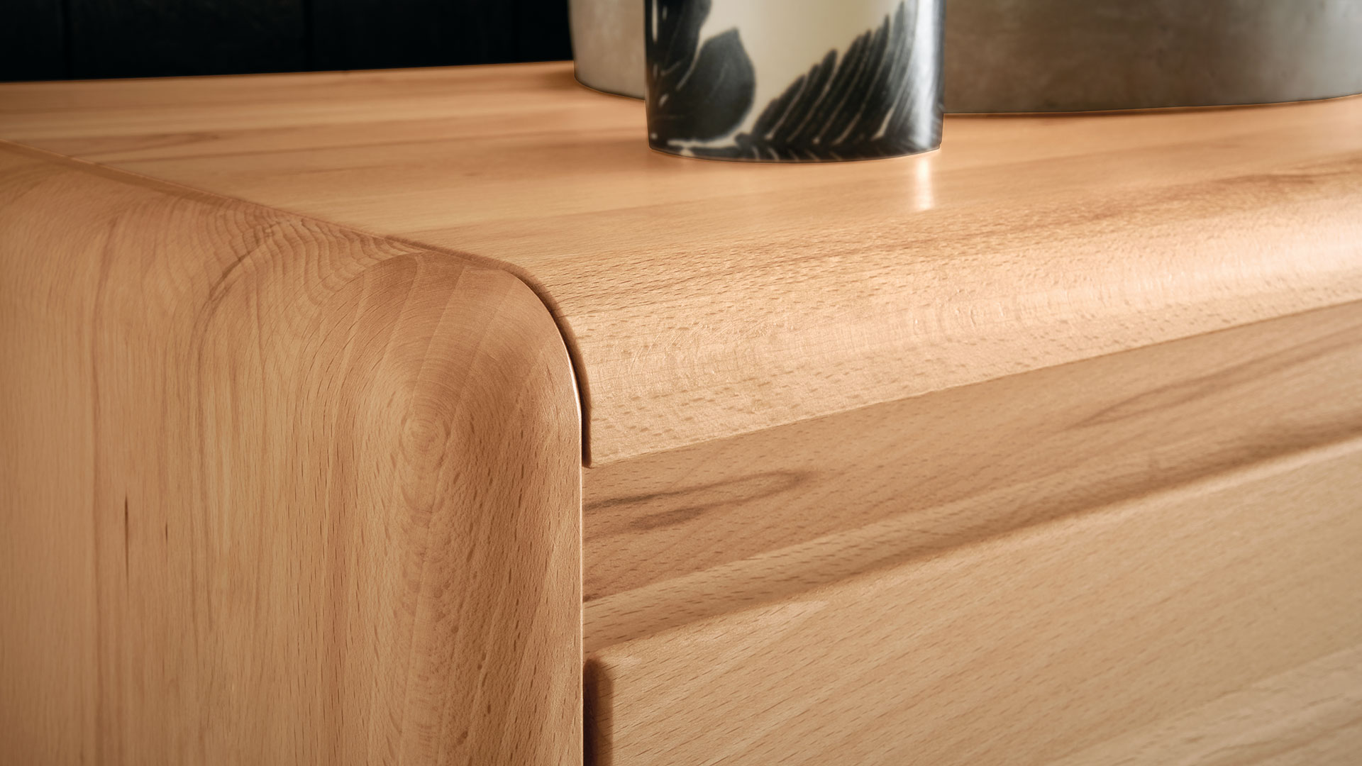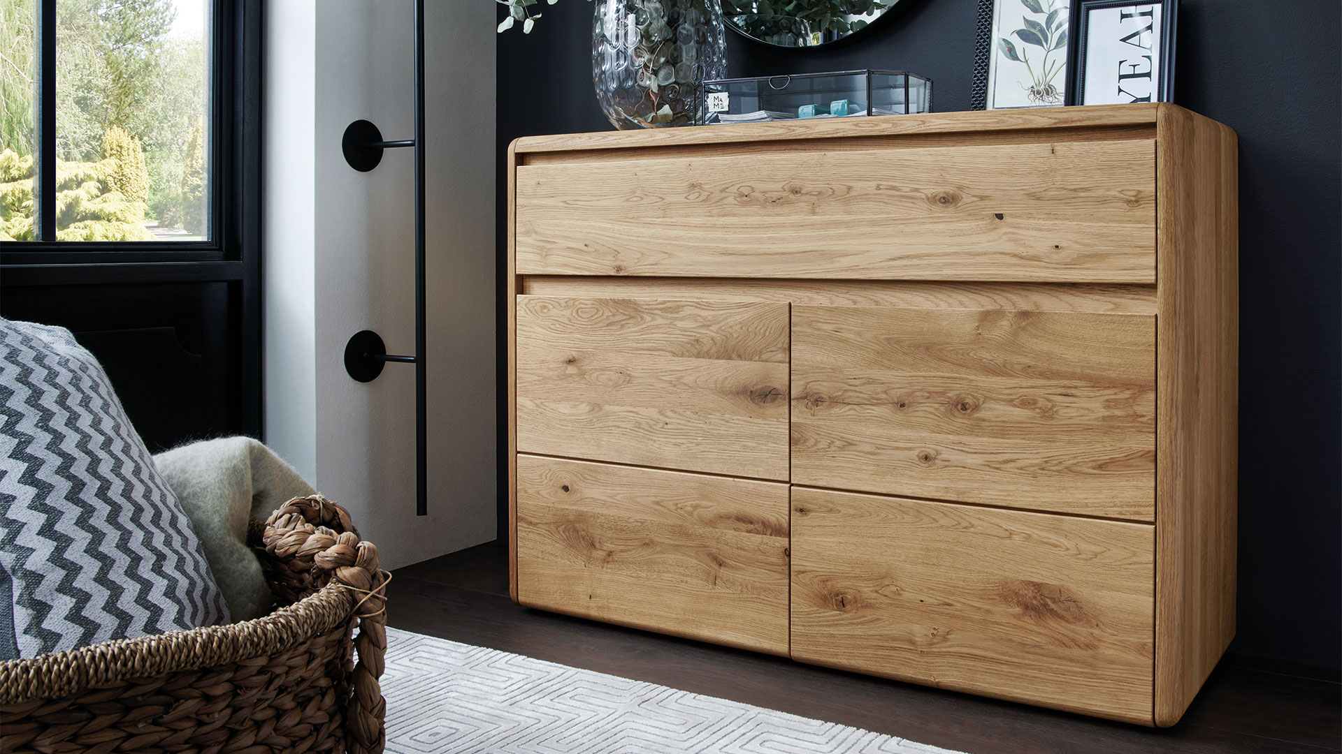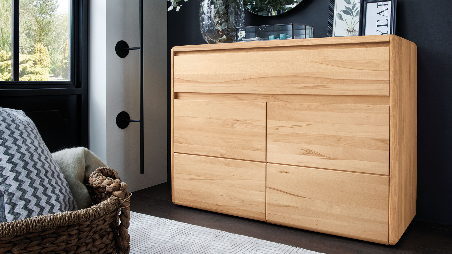 Dank der eingebauten Dämpfung schließen die Türen und Schubladen sanft und fast lautlos. Die schöne Kommode schmeichelt dem Auge und verlockt immer wieder dazu, die sorgfältig ausgearbeiteten Rundungen mit der Hand nachzufahren. Die Fronten sind passend zu den klaren Formen glatt gestaltet und mit dezenten Griffleisten versehen.