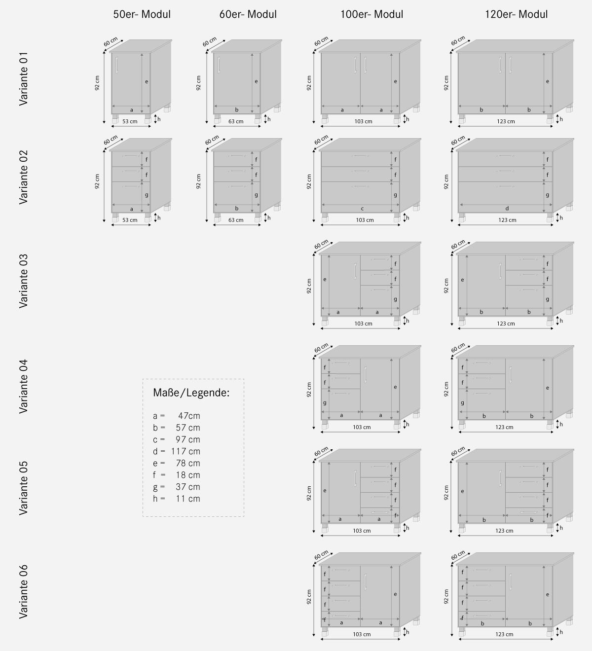 Kombinieren Sie die durchdachten Module Ihrer "Culinara" ganz nach Bedarf und Raumsituation zu Ihrer ganz individuellen Traumküche. Diese praktische Modul-Übersicht hilft Ihnen dabei.