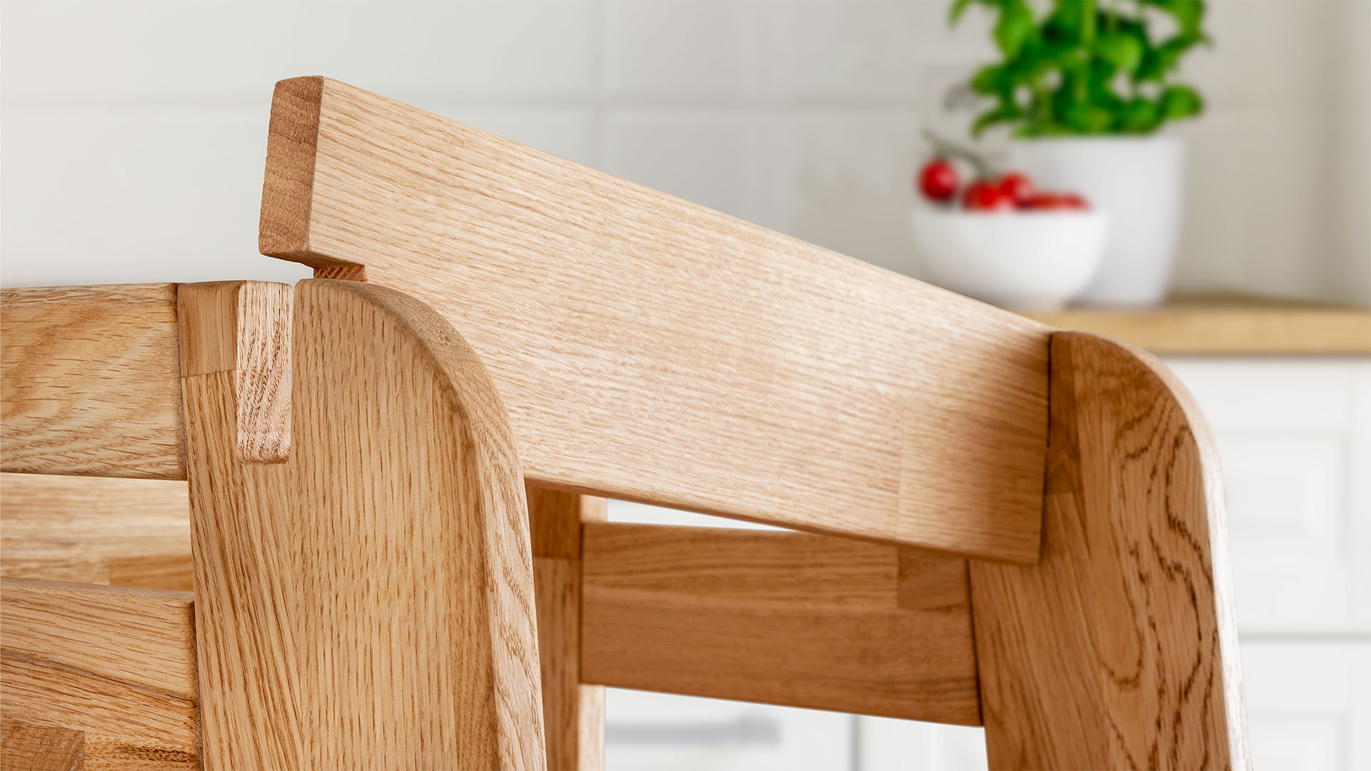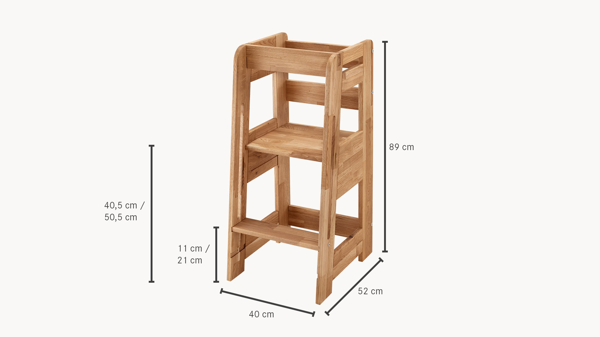Lernturm "Toretta" gibt es aus massivem Eichen- oder Buchenholz, mit geölter Oberfläche und in Buche auch weiß-lackiert. Die Stufe und Stehfläche lassen sich jeweils auf 2 Höhen anbringen, sodass der Lernturm mitwächst. Wenn Ihr Kind dann größer ist, kann der Lernturm zu einem Hochstuhl umgewandelt oder auch als praktischer Beistell- oder Nachttisch verwendet werden. So wird der Lernturm "Toretta" zu einem langlebigen Begleiter, mit dem Ihr Kind über die Jahre das Wunder des Alltags hautnah miterleben kann.