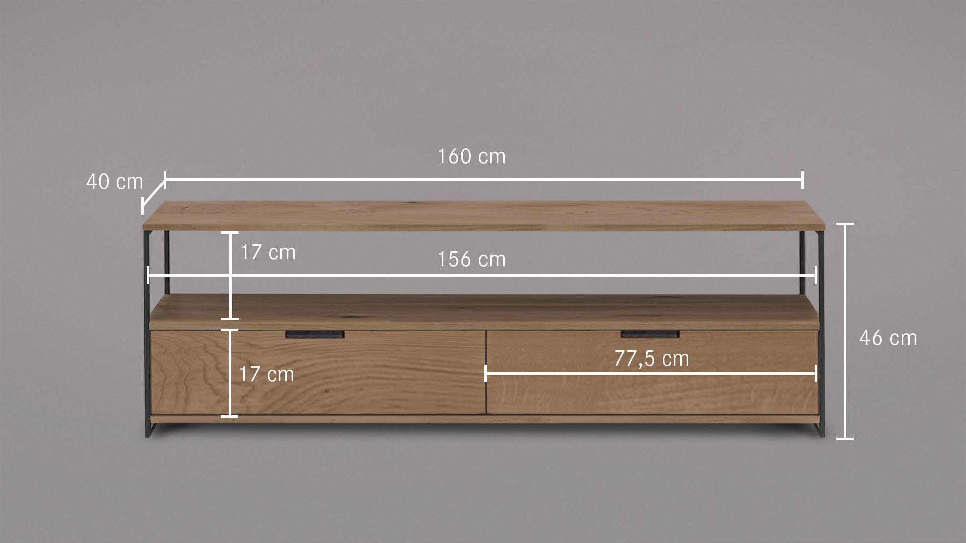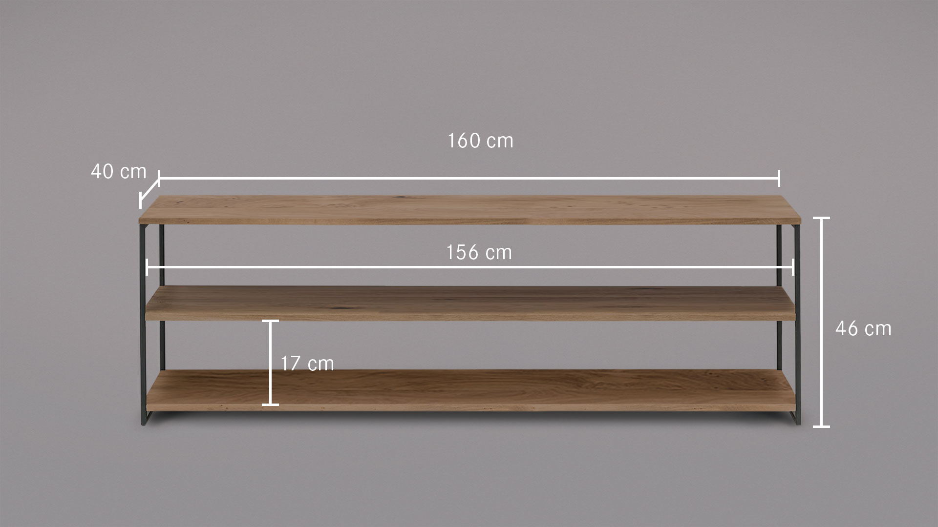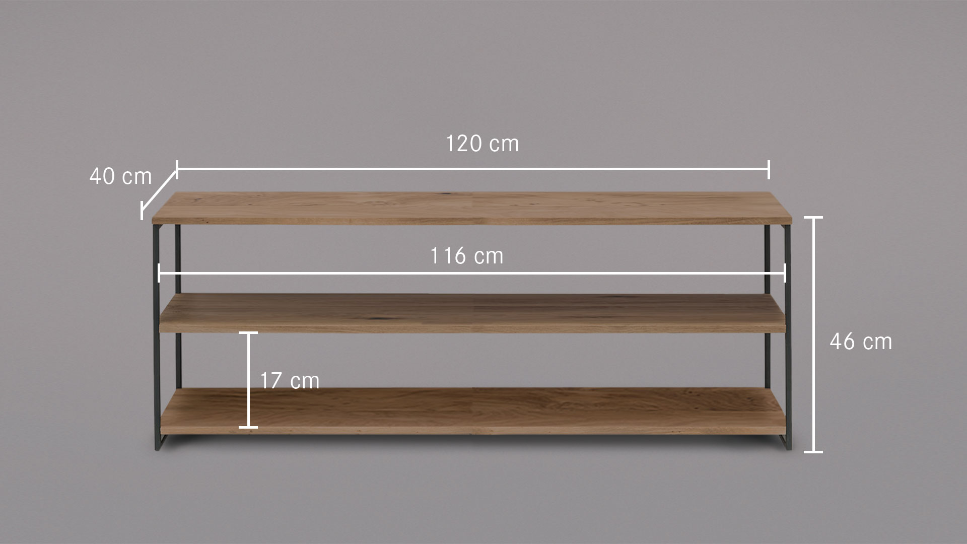 Markant gemasertes Wildeichenholz trifft auf kühlen Schwarzstahl. Die minimalistische Gestaltung ohne Seitenteile und ohne Rückwand wirkt leicht und macht zudem die Kabelführung ganz einfach. Die Fachböden sind an den Ecken ausgespart und werden von außen sichtbar angeschraubt. Sie scheinen fast im Rahmen zu schweben.Wählen Sie zwischen 2 offenen Varianten in unterschiedlicher Breite und 1 Variante mit 2 Schubladen und einem offenen Fach. "Anca" erhalten Sie exklusiv nur bei allnatura.