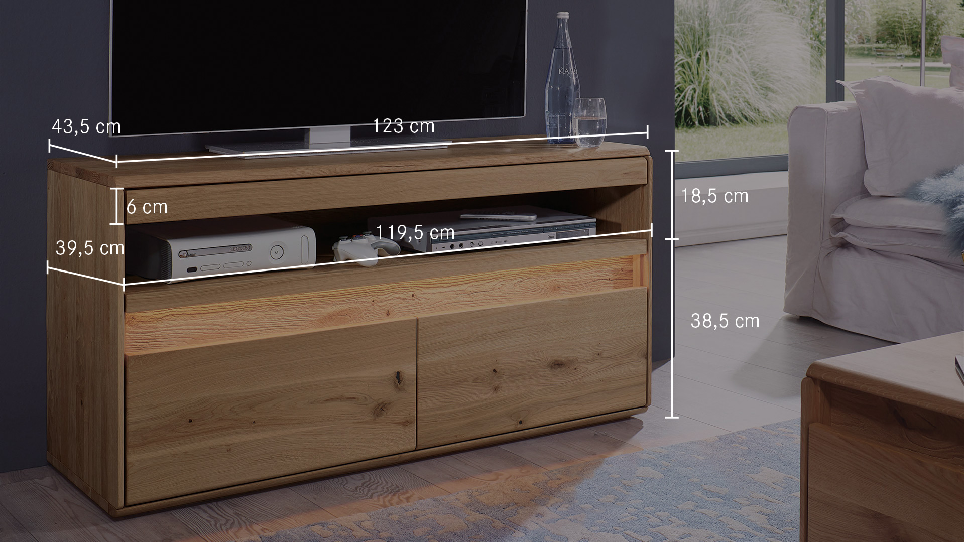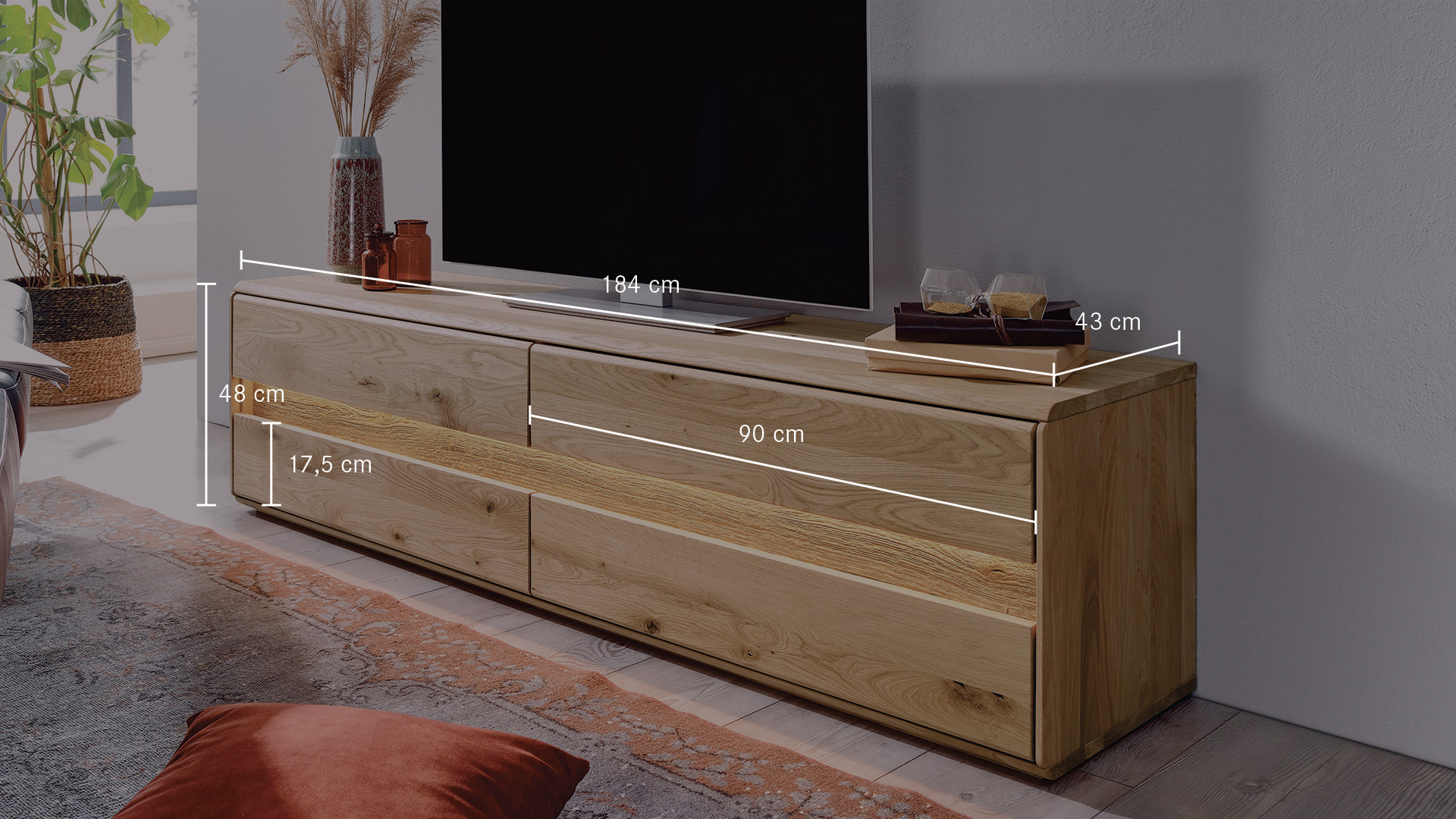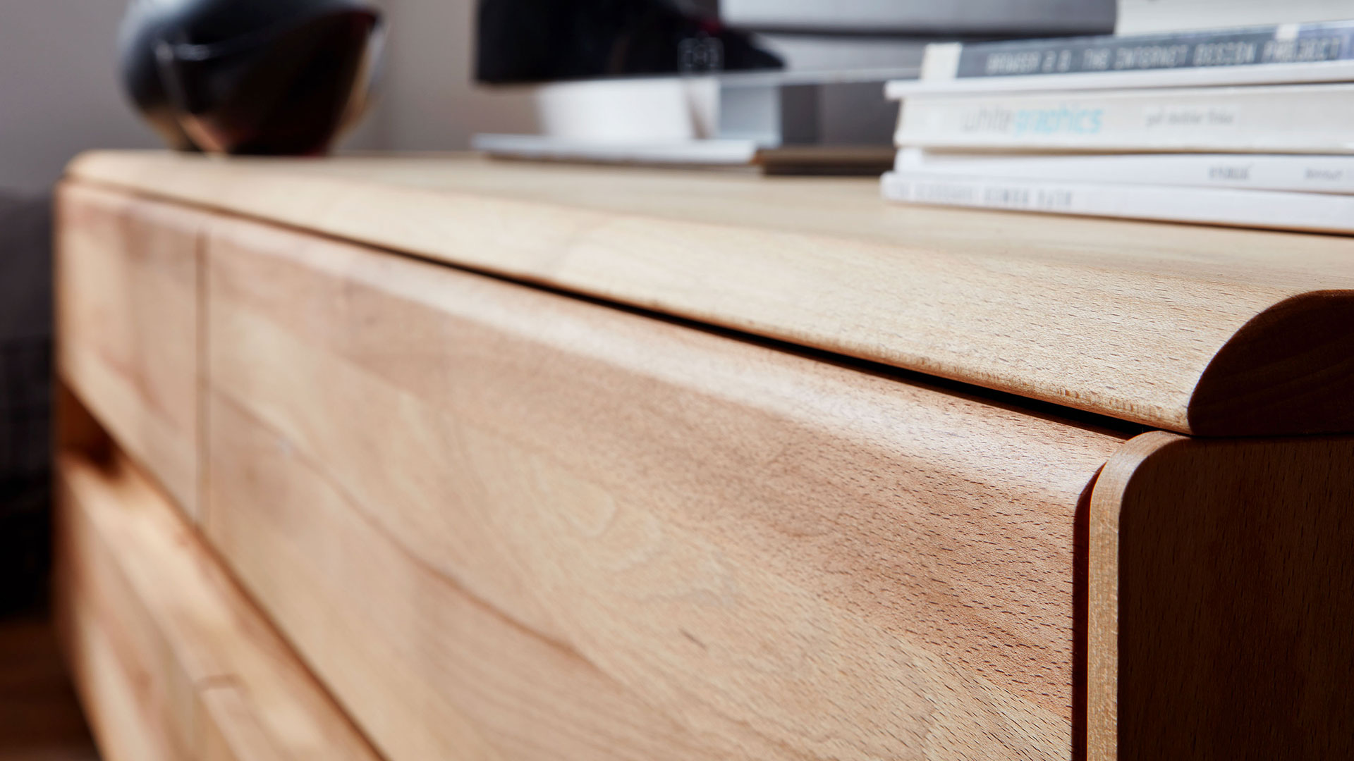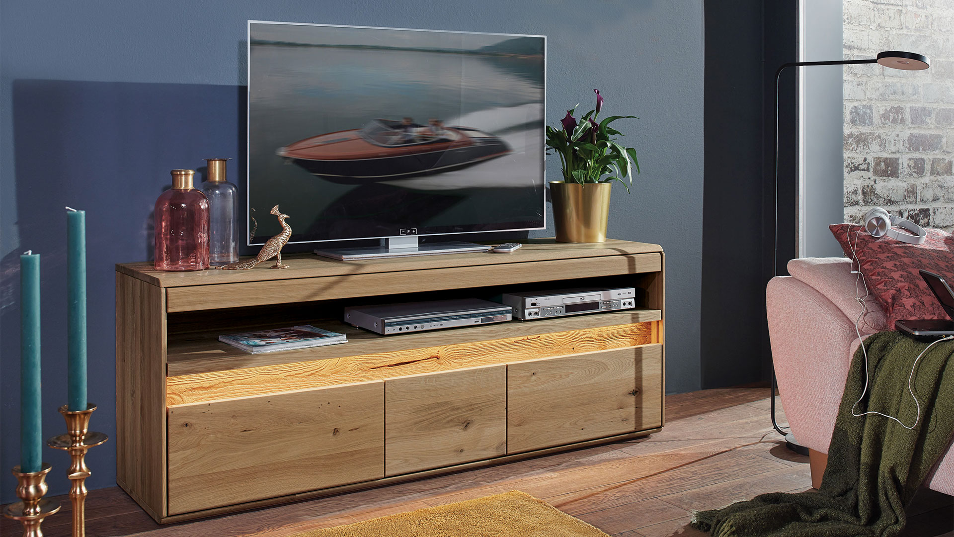 Dieses Möbelprogramm hält noch ein attraktives Highlight für Sie bereit. Sichtbare Rückwände und etwaige Applikationen sind aus gebürstetem Massivholz. Hier wird das Holz mit einer Bürste in Faserrichtung bearbeitet. Weiche Holzteile werden dabei sanft abgetragen und nur die härtere Maserung bleibt übrig. So entsteht eine plastische Oberfläche, die besonders natürlich wirkt und Ihnen eine einzigartige Haptik beschert. Je nach Variante bietet Ihnen "Bassano" offene Fächer, Türen oder Schubladen. Verstauen Sie hier komfortabel Filme, Dokumente und Bedienungsanleitungen. Durch die luxuriöse Softclose-Funktion schließen die Türen und Schubladen äußerst geräuscharm. Das Highlight bildet die integrierte Beleuchtung, welche die faszinierende Holz-Applikation atemberaubend in Szene setzt. Das lebhafte Kernbuchen- oder edle Wildeichenholz bringt natürlichen Charme in Ihr Zuhause. Verwirklichen Sie mit Programm "Bassano" Ihren ganz persönlichen Wohntraum