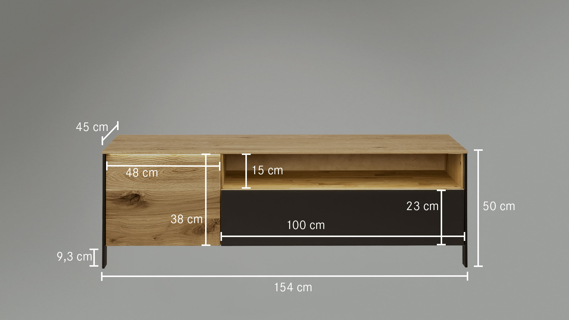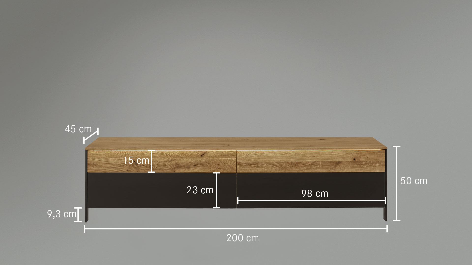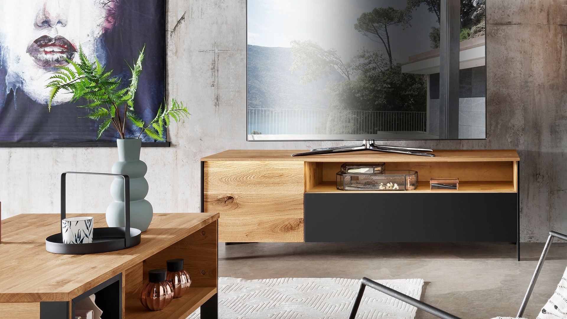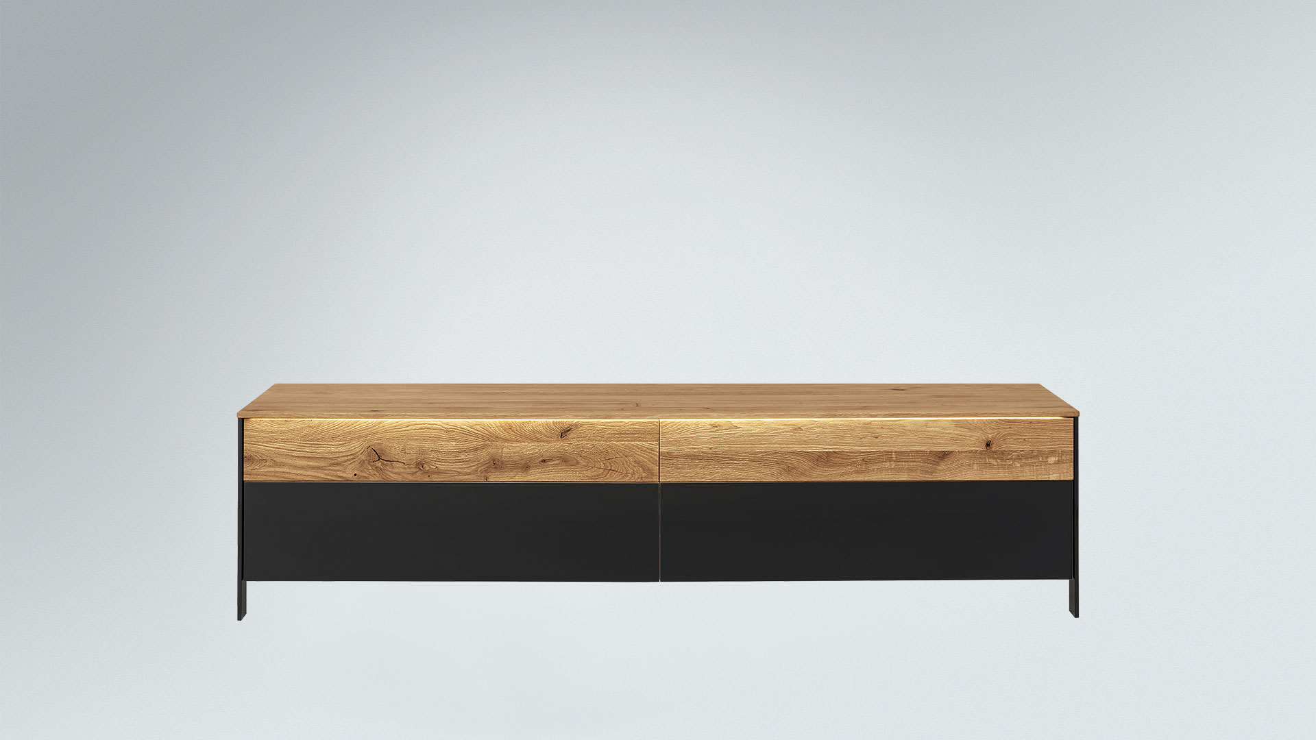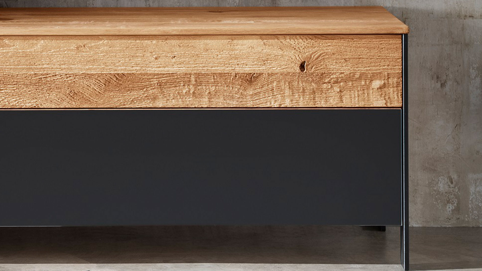 Es gibt viele weitere Details, die das Design von "Fira" so einzigartig machen. Die schlanken Füße aus schwarz lackiertem Holz geben dem Lowboard ein optisch leichtes Aussehen. Die Schubladen und Schrankfächer haben eine praktische Tip-On-Funktion und kommen daher ganz ohne Griffe aus, was den reduzierteren Industrie-Stil noch weiter unterstreicht. Durch die sorgfältig geschroppten Holz-Paneele erhalten die Schubladen und Schrankfächer eine spannende Hoch-Tief-Struktur. Im Kontrast dazu stehen die glatten Glasblenden in elegantem Anthrazit. "Fira" bringt Gegensätze gekonnt zusammen und schafft so ein einmaliges Design, das in Ihrem Zuhause urbanen Flair versprüht.