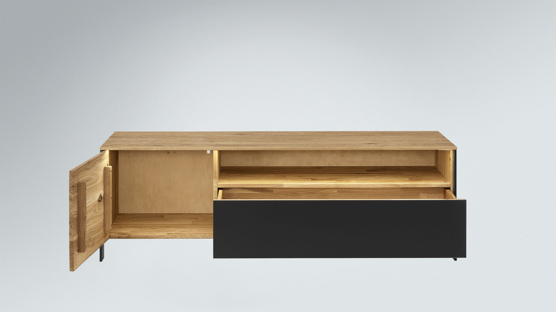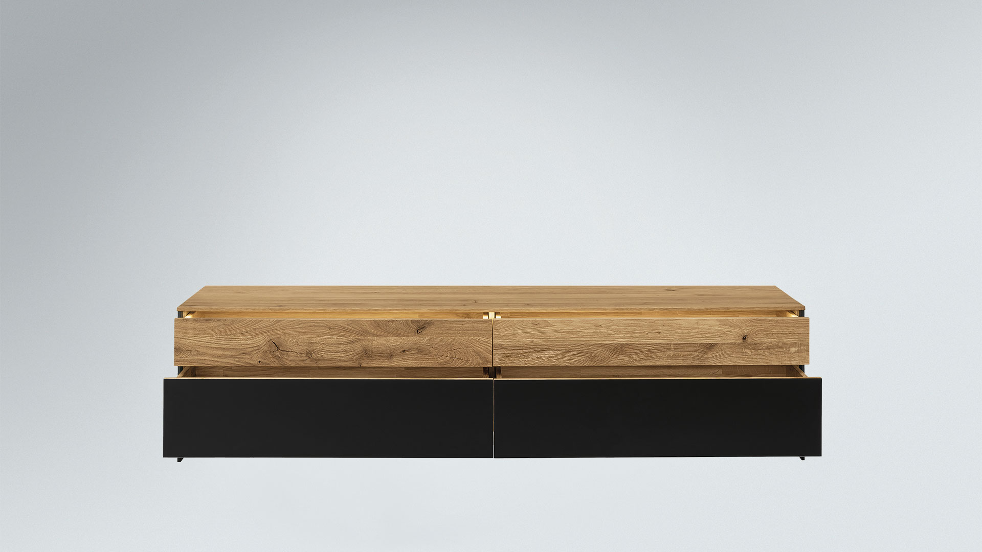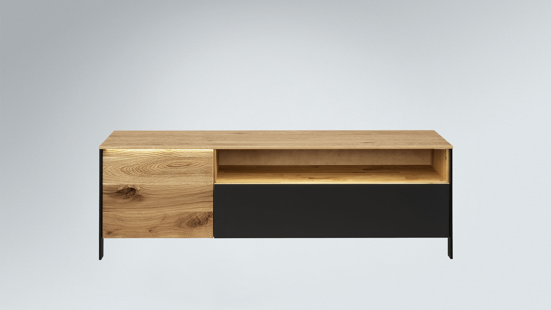 Das Lowboard bietet Ihnen verschiedene Möglichkeiten, Ihre Multimedia-Geräte und Zubehör zu verstauen. Wenn Sie ein offenes Fach für zum Beispiel Ihren Blu-Ray-Player und ein etwas höheres Schrankfach für weitere Schätze brauchen, entscheiden Sie sich für Variante 01. Möchten Sie hingegen Ihre Geräte geschützt in Schubladen verstauen, dann ist Variante 2 mit den 4 leichtgängigen Schubladen eine ideale Wahl.