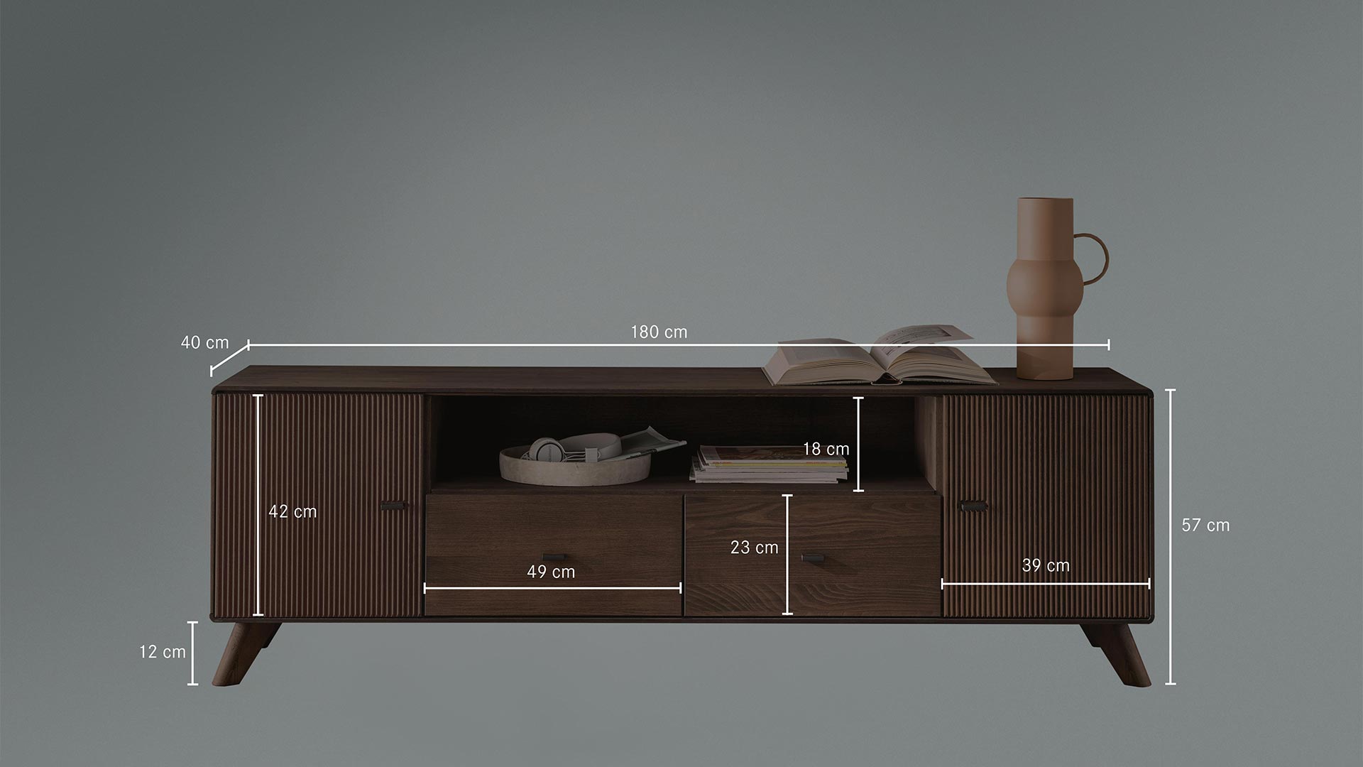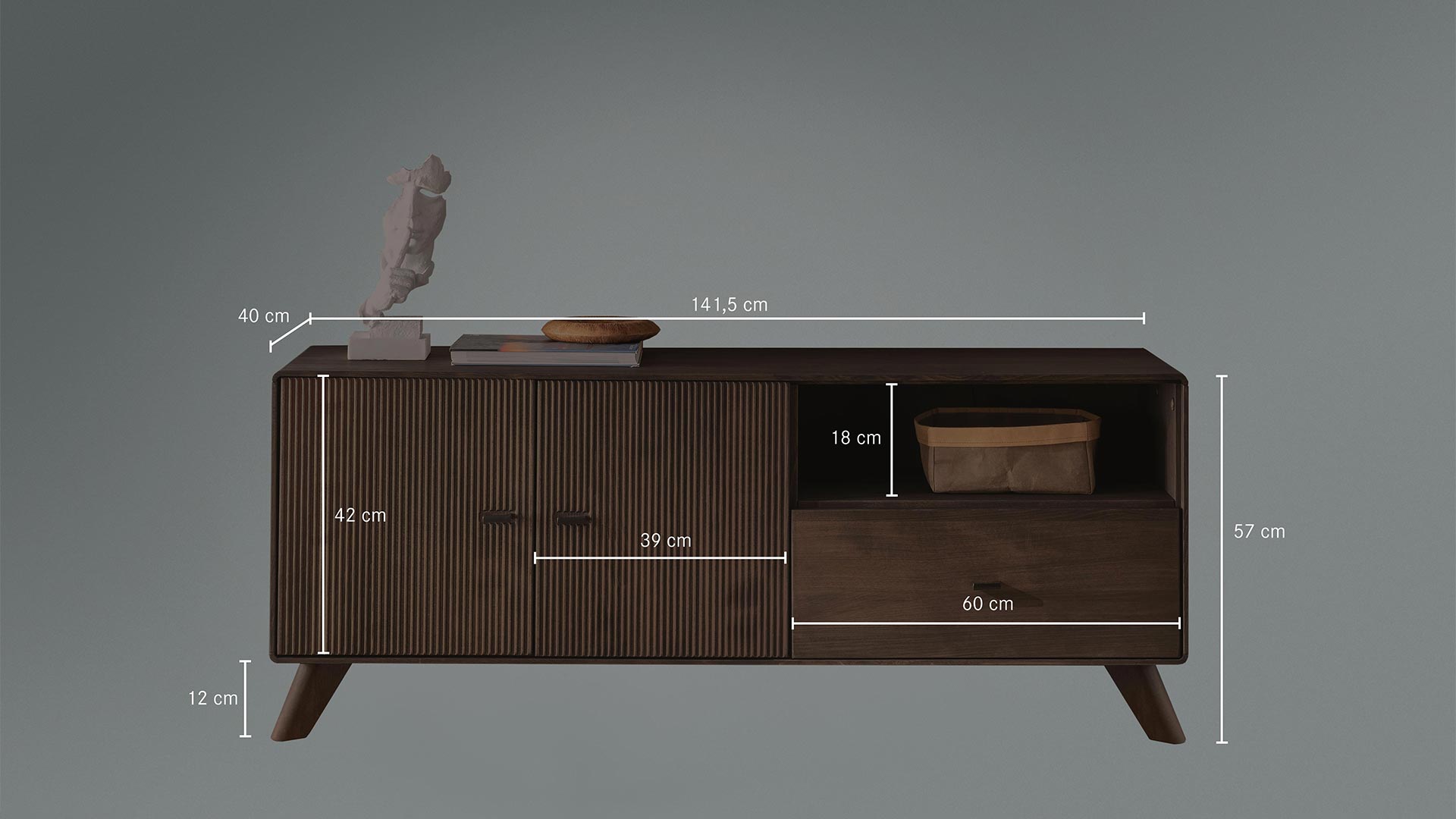 Das Lowboard "Lado" fügt sich harmonisch in Ihr Wohnzimmer ein und bietet die perfekte Kombination aus stilvollem Design und praktischer Funktion. Das massive Kernbuchenholz mit seinem warmen Tabak-Finish verleiht dem Möbelstück ein sehr wohnliches Flair, während die feinen Riffelungen an den Türen und die schräg angesetzten Füße moderne Akzente setzen. Die sanft abgerundeten Kanten unterstreichen die harmonische Formgebung