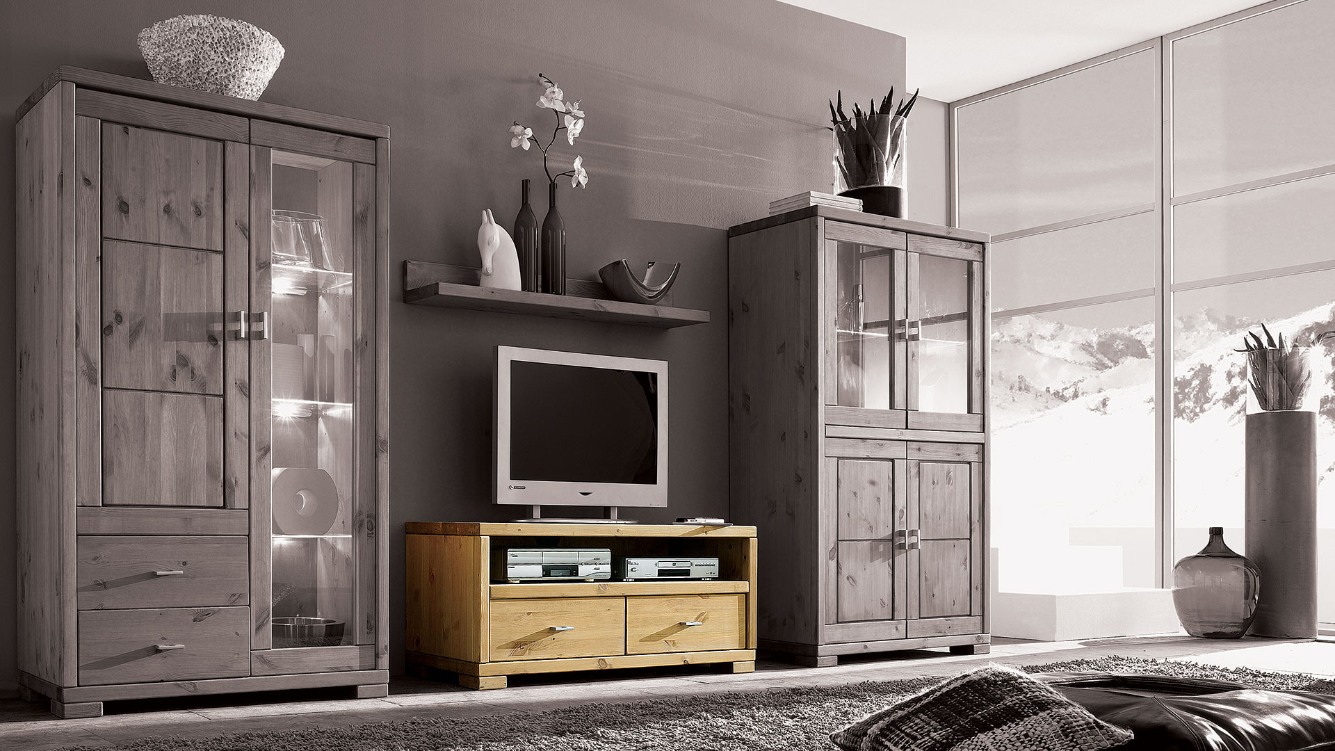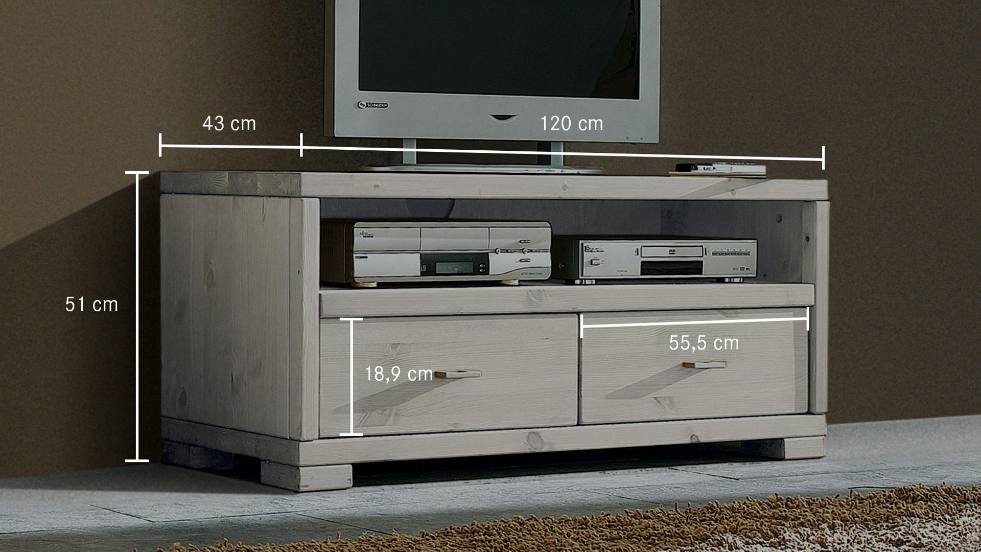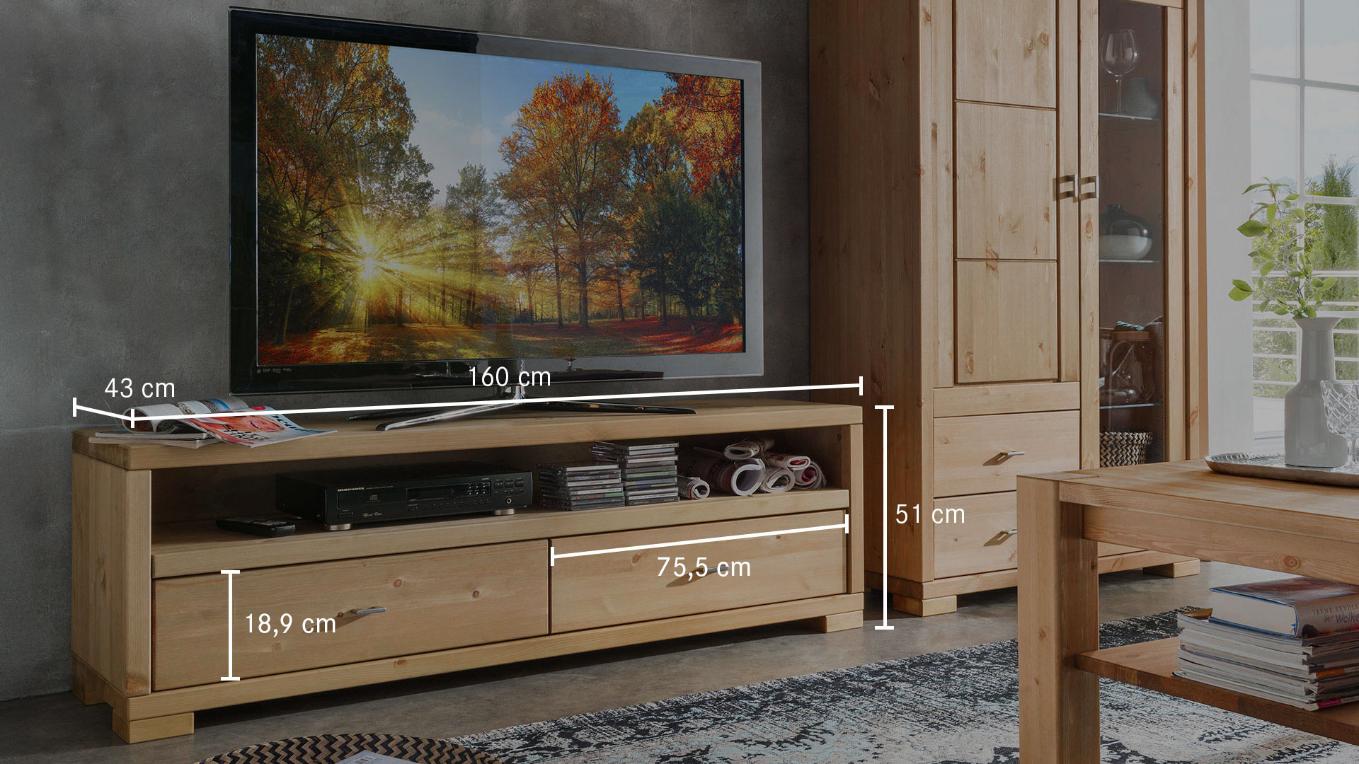 In der Rückwand ist bereits ein praktischer Kabelauslass vorhanden. Zudem können Sie jegliches Zubehör, wie Fernbedienungen, Kopfhörer, DVDs und dergleichen in den 2 geräumigen Schubladen mit Vollauszug verstauen. Die Schubladen des Lowboards "Mascella" lassen sich an formschönen Metall-Griffen öffnen, die vor allem auf der warmen, gelaugt/geölten Oberfläche einen kühlen, metallischen Akzent setzen. Nicht minder attraktiv präsentieren sich die stilvollen Griffe auf der weiß-lasierten Kiefer.