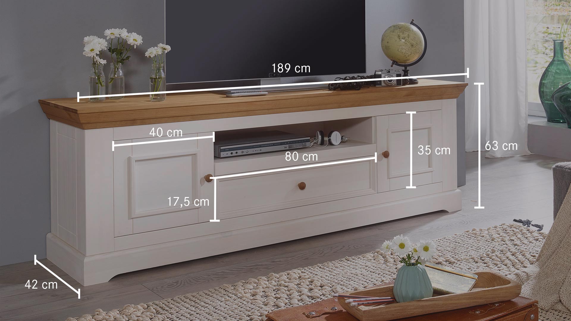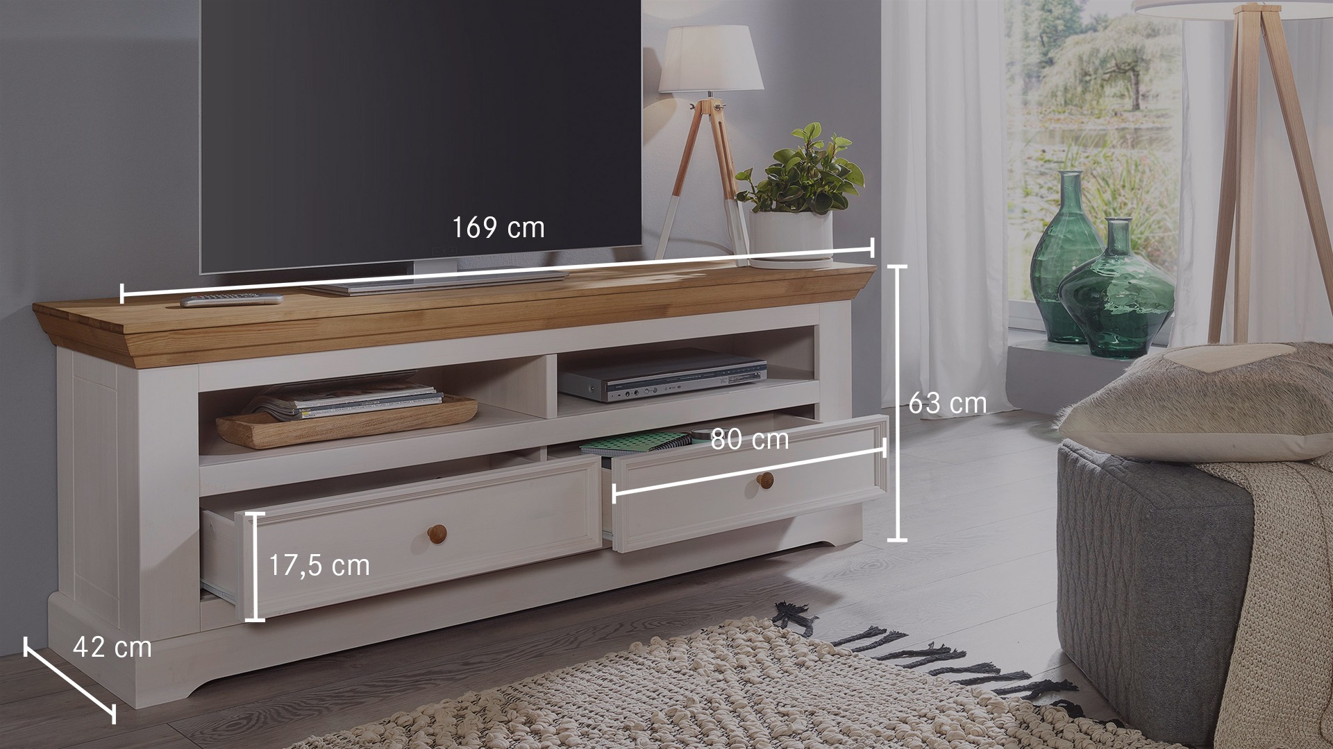 Das liebevoll und detailliert im Landhausstil gestaltete TV-Möbel setzt auch einen wohnlichen Kontrapunkt zum eher nüchtern kühlen Ambiente von Fernseher & Co. Dabei lässt die Ausstattung keine Wünsche offen. Die Rückwände der Regalfächer sind mit Kabelauslässen versehen und in den Schubladen und Schrankelementen ist viel Platz für Zubehör. "Molina" ist in 2 Breiten erhältlich. Wählen Sie Ihr neues Lowboard passend zur Breite Ihres Fernsehers. Das gemütliche Lowboard wird aus massivem Kiefernholz gefertigt und ist sorgfältig weiß oder anthrazit gewachst. Die Deckplatte mit ihrem aufwändig profilierten Kranz ist eichefarbig lasiert - ebenso wie die handschmeichelnden Knopfgriffe der Schubladen und Türen. Dezent in Kassettenoptik gehaltene Seitenteile und ein markanter, ausgestellter Sockel runden das wohnliche Gesamtbild ab.