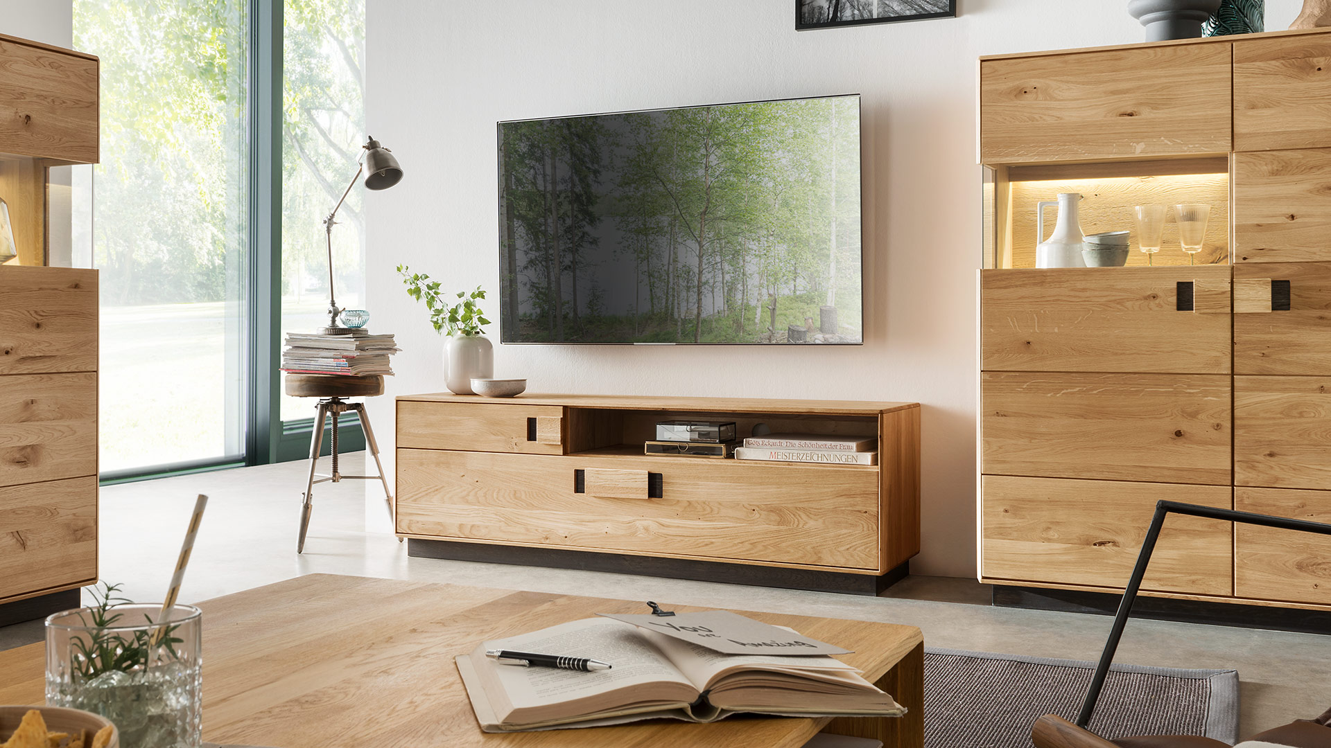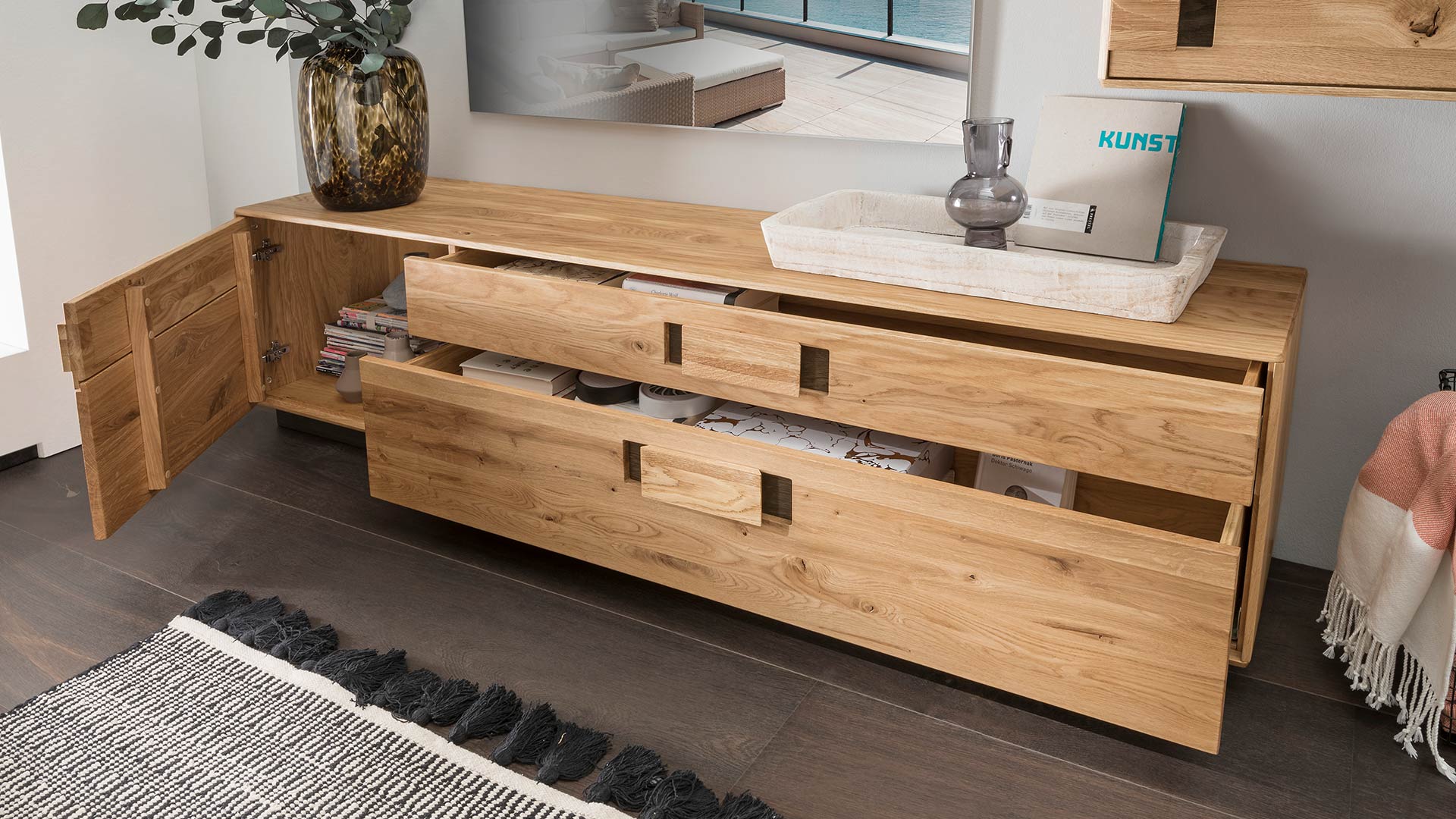 Der pfiffige Materialmix sorgt bei diesem Programm für Raffinesse! Die Fronten der schönen Massivholzmöbel präsentieren charaktervolles Wildeichenholz mit seinen Ästigkeiten und kleineren Unebenheiten. Der Korpus dagegen setzt mit dezent gemasertem Eichenholz einen ruhigen Kontrapunkt.