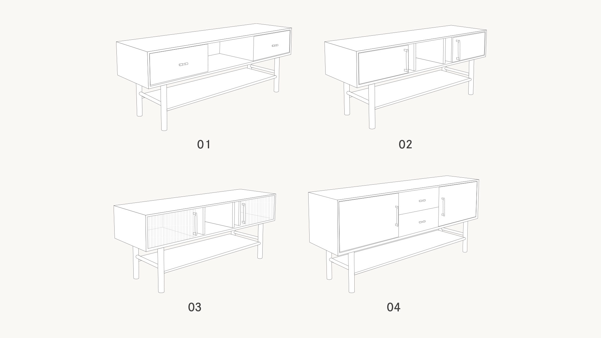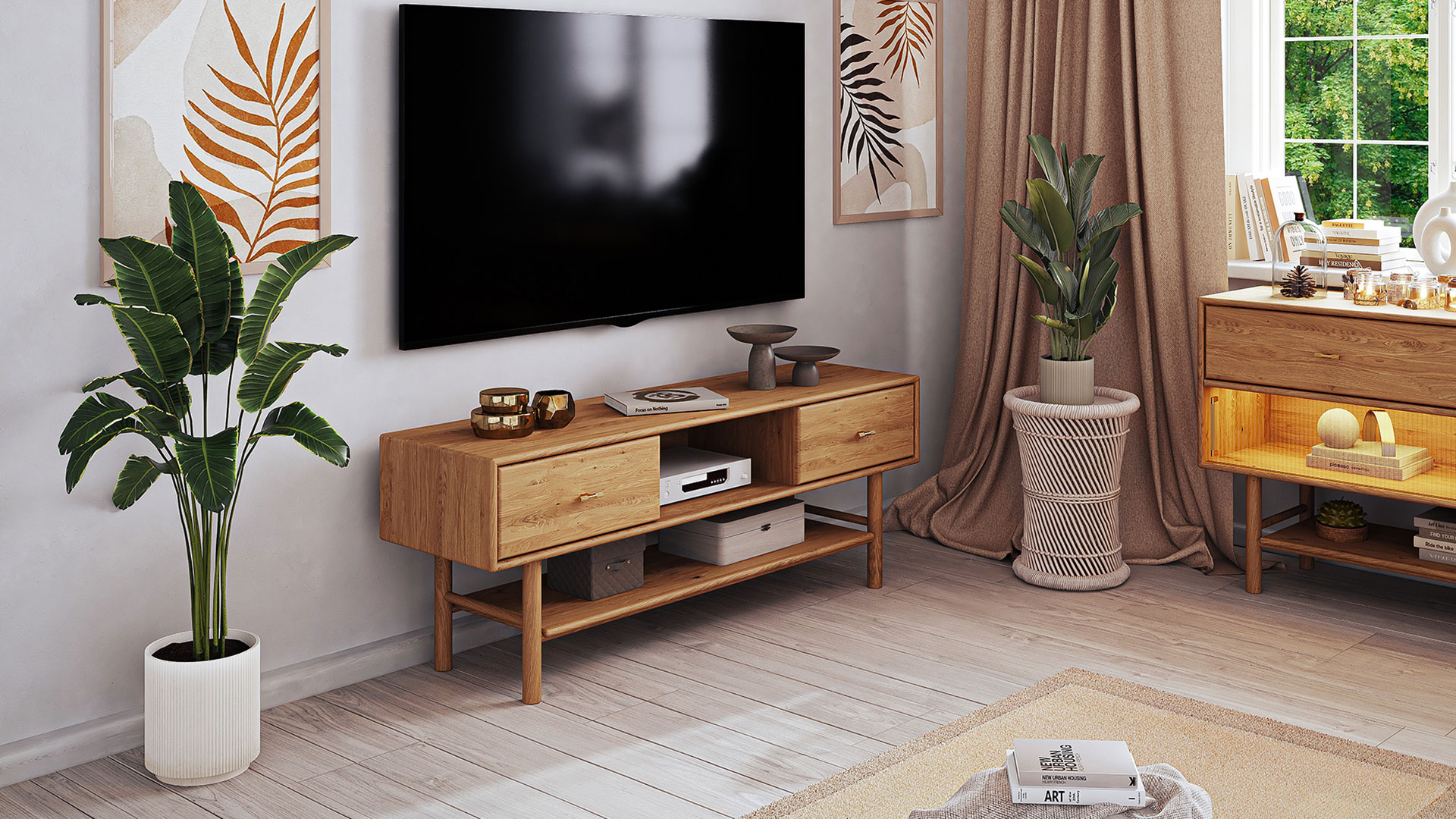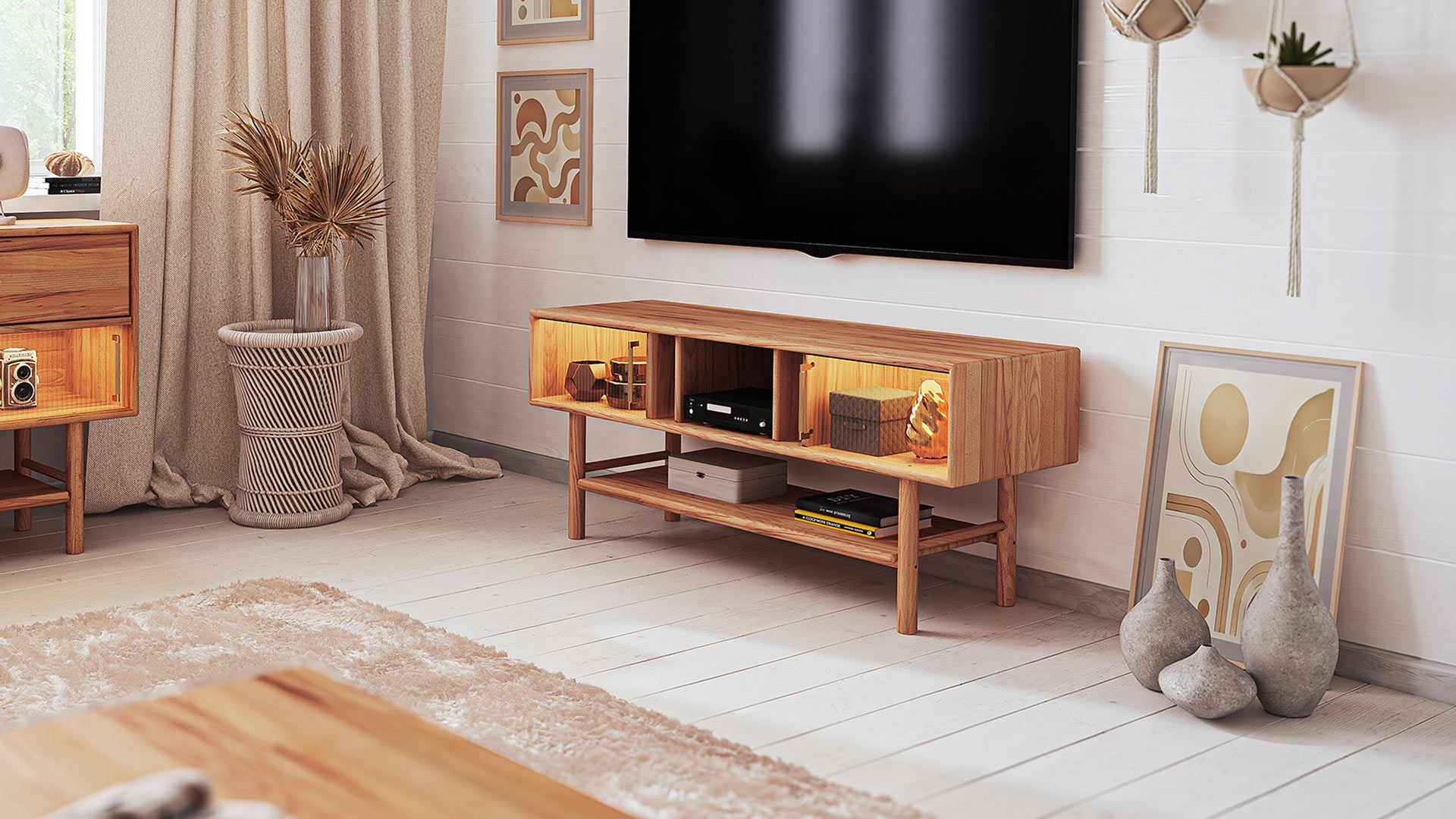Praktisch durchdacht zeigt sich Serea auch im Alltag: mit offenen Fächern für Technik, Schubladen für Ordnung und – in Variante 03 – Schiebetüren aus geriffeltem Glas, die den Blick dezent lenken und gleichzeitig das Besondere betonen. Hinter den Glastüren sorgt außerdem eine integrierte LED-Beleuchtung für stimmungsvolle Akzente und setzt Ihre Lieblingsstücke elegant in Szene. So wird Ihr Wohnbereich zum Ort, an dem Funktion und Design im perfekten Einklang stehen.