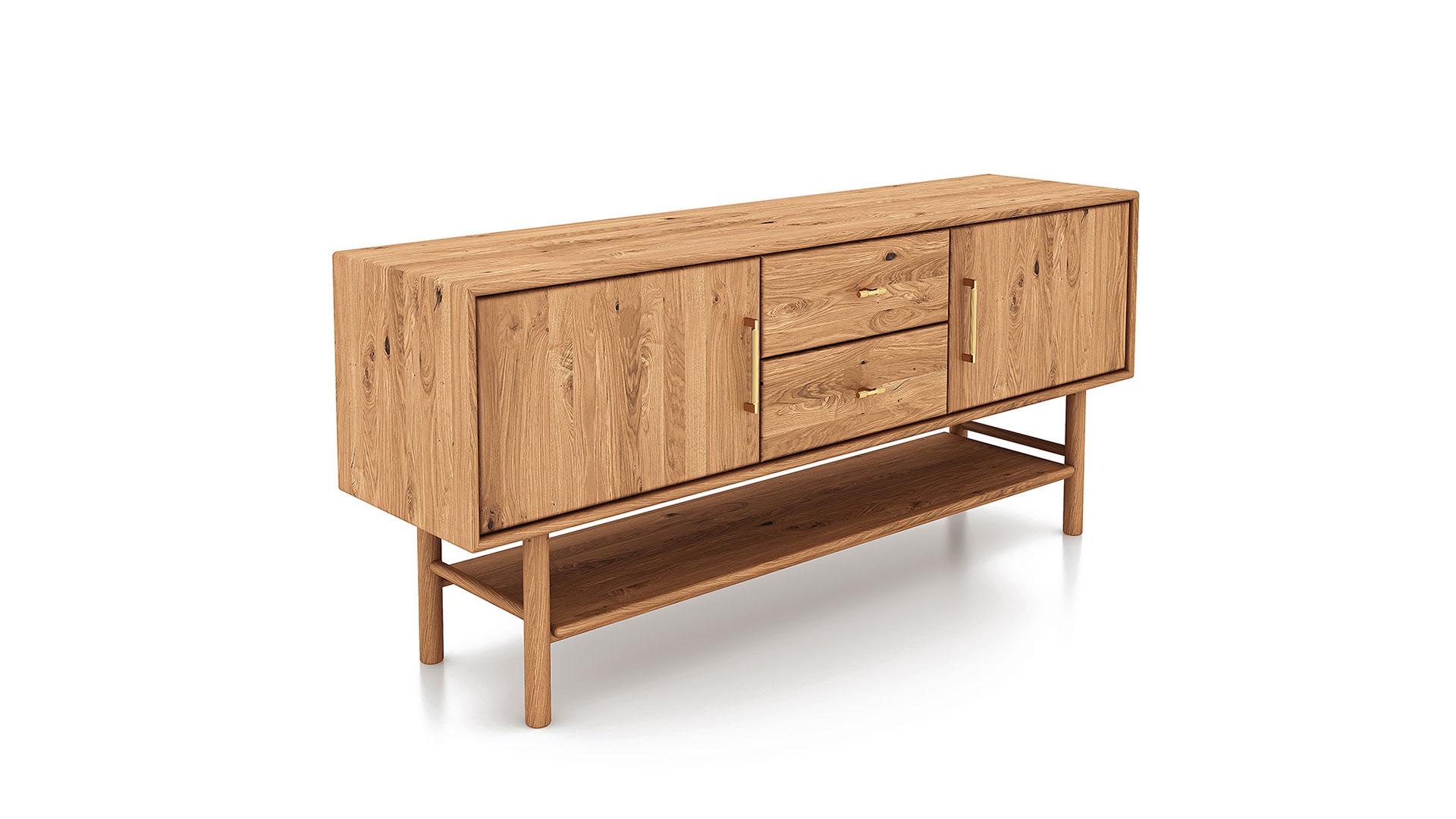 Stellen Sie sich vor, wie das Lowboard Serea Ihr Wohnzimmer mit zeitloser Eleganz erfüllt. Das Design im Mid-Century-Stil trifft auf warme Holzoberflächen und goldfarbene Griffe, die dem Möbelstück einen Hauch von Glamour verleihen. Ob in Kernbuche geölt, Wildeiche geölt oder Wildeiche mokka – jede Variante bringt ihre ganz eigene Ausstrahlung mit.