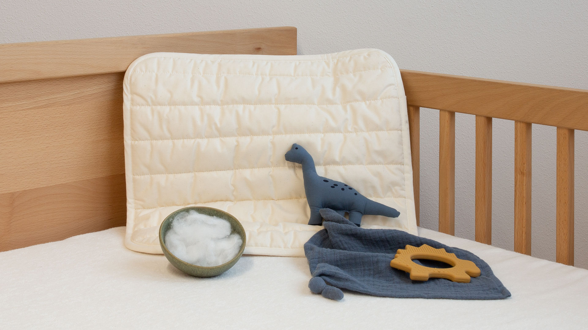 Es werden zwei Kissenteile separat mit einem Tencel-Vlies versteppt und zu einem flachen Babykissen vereint. So entsteht ein angenehm weiches, pflegeleichtes Kissen mit orthopädisch idealer Höhe für Babys.