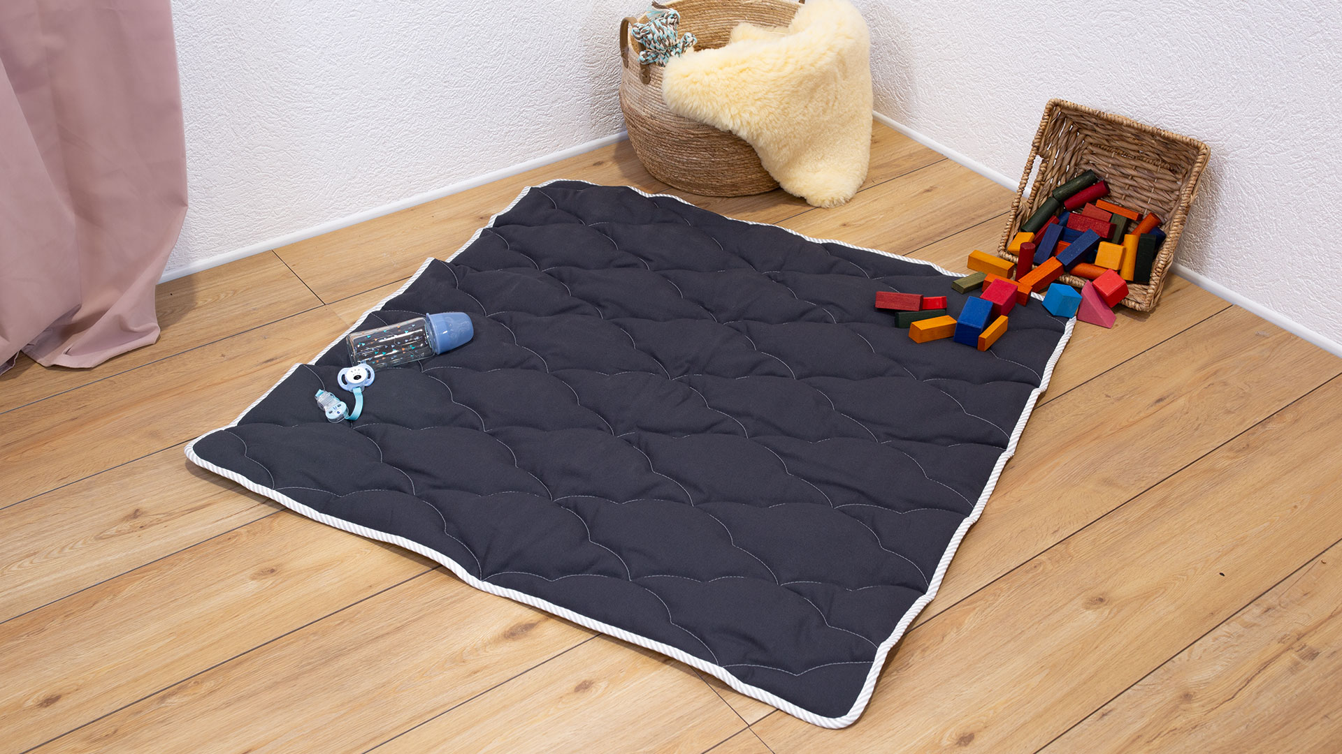 Krabbeldecke "Santino" mit ihrem hübschen, eingesteppten Wolken-Muster ist exklusiv nur bei allnatura erhältlich. Wir bieten sie wahlweise in natur mit getupftem Einfassband in rosa oder blau oder in anthrazit mit hellgrau gestreiftem Einfassband an. Die praktische Krabbeldecke ist waschbar und trocknergeeignet und damit sehr pflegeleicht.